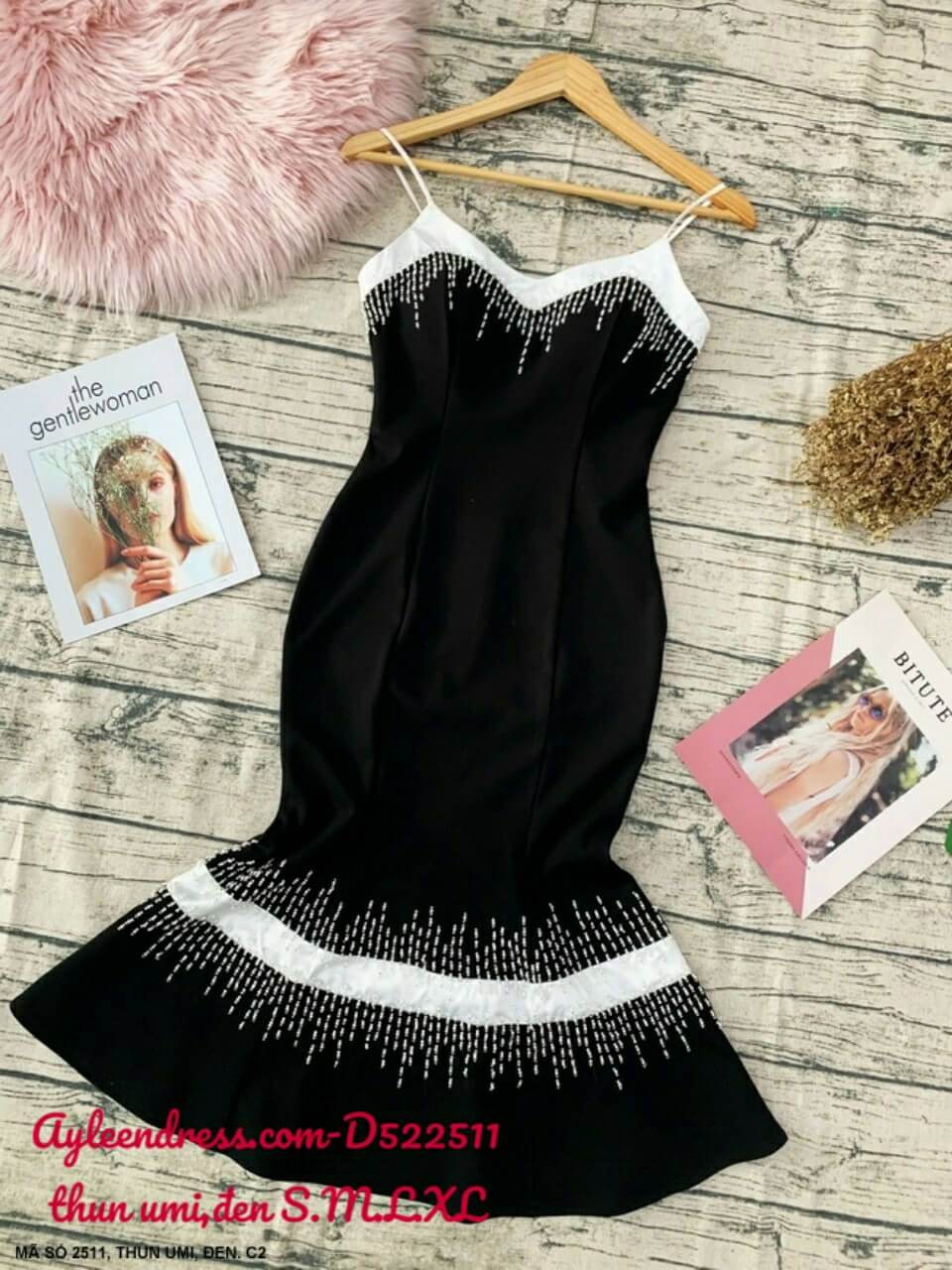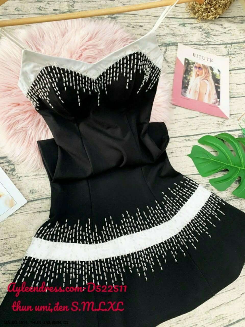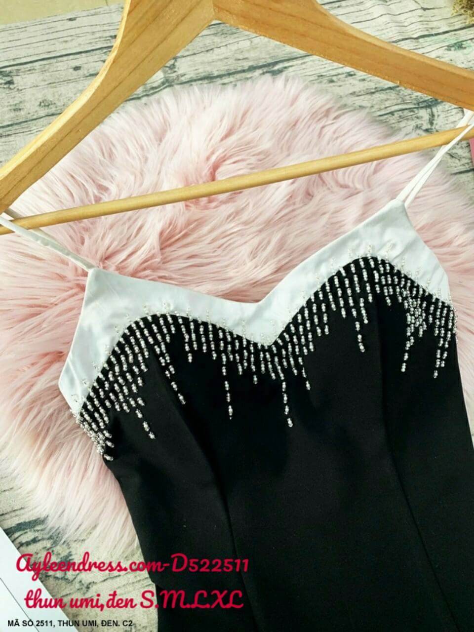 Đầm 2 dây màu đen kết cườm trắng sang trọng quyến rũ