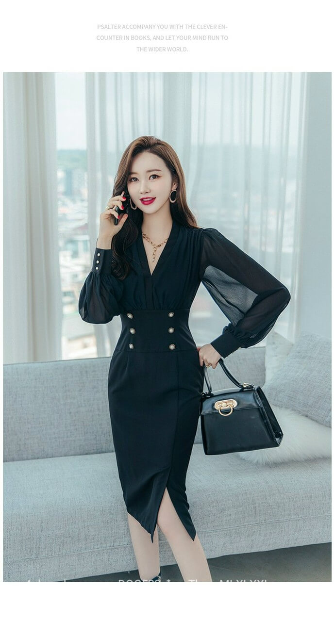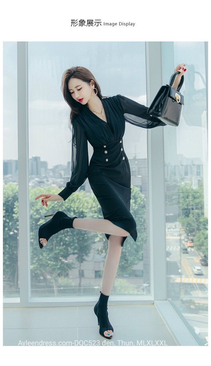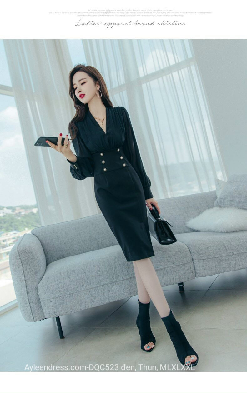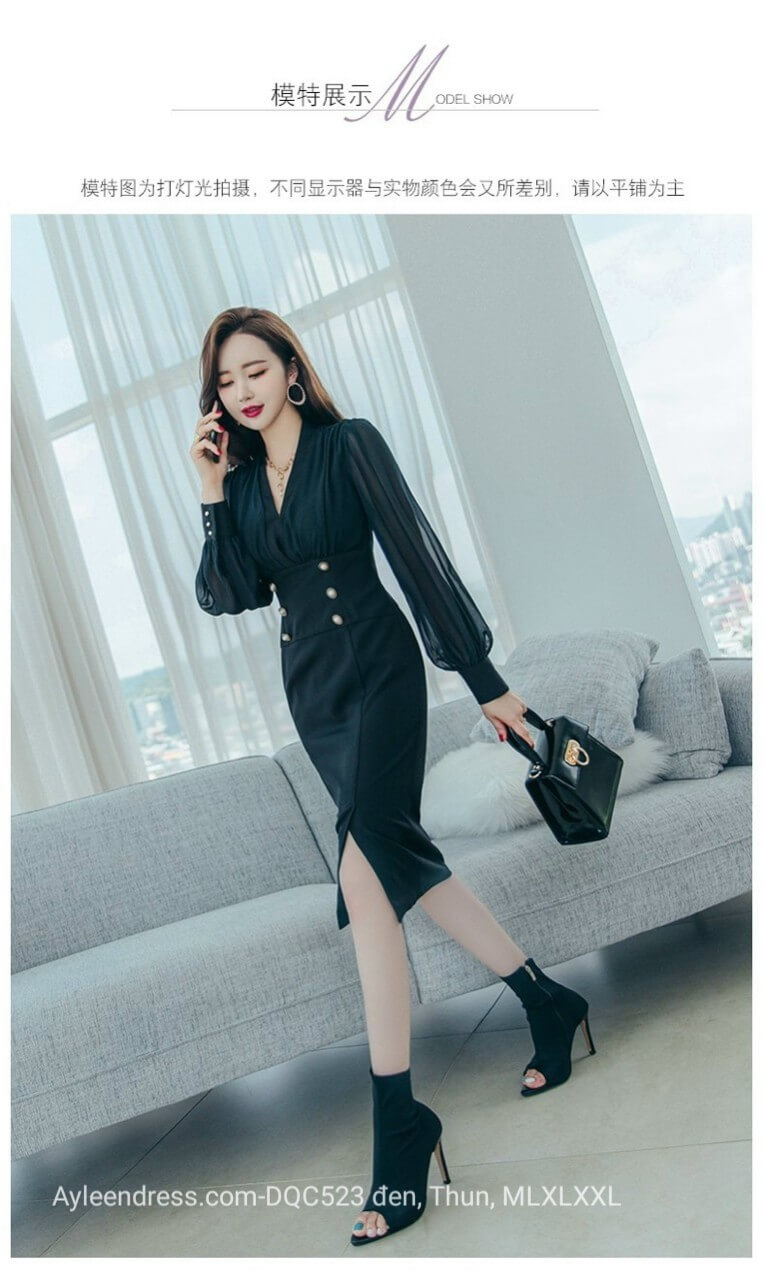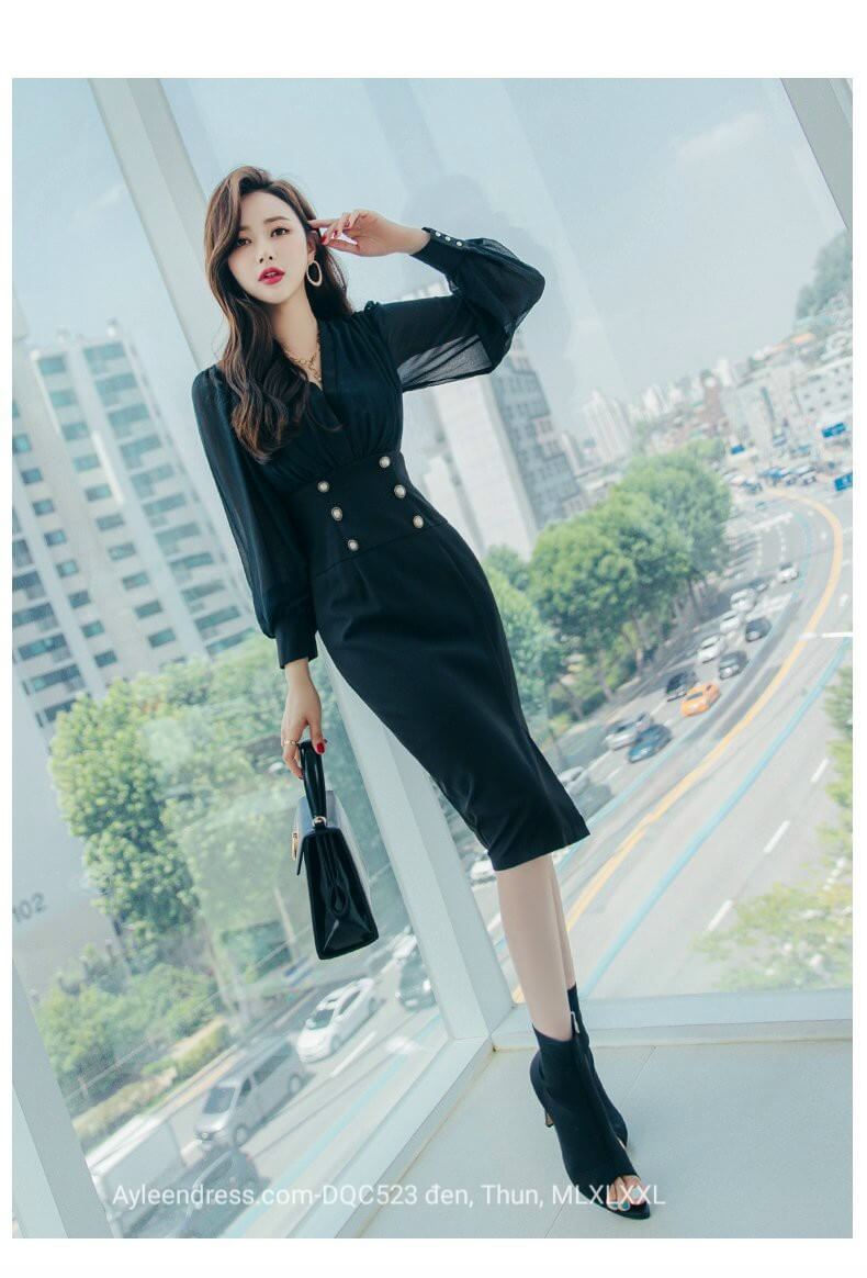 Đầm body cổ vest phối tay voan màu đen