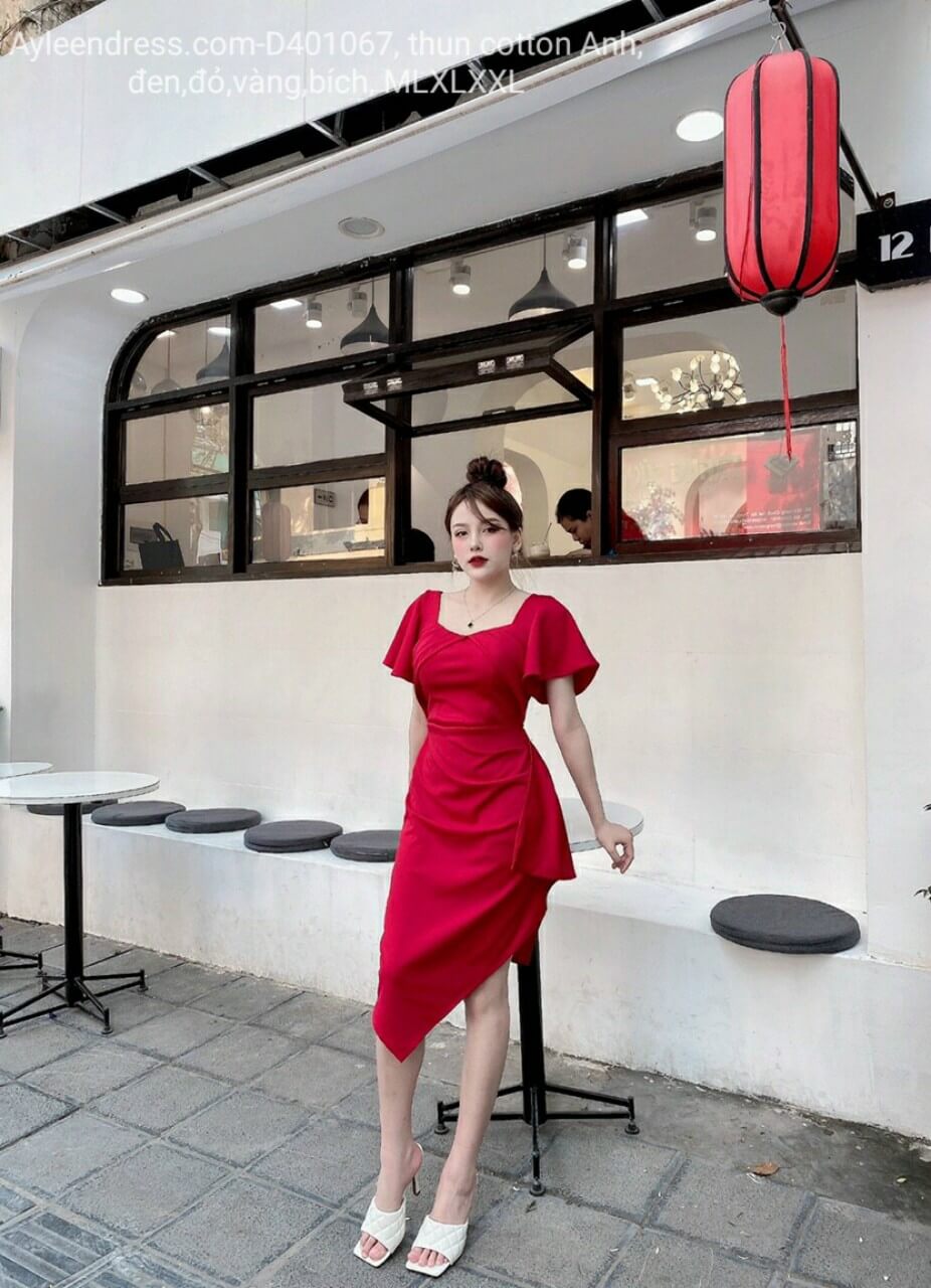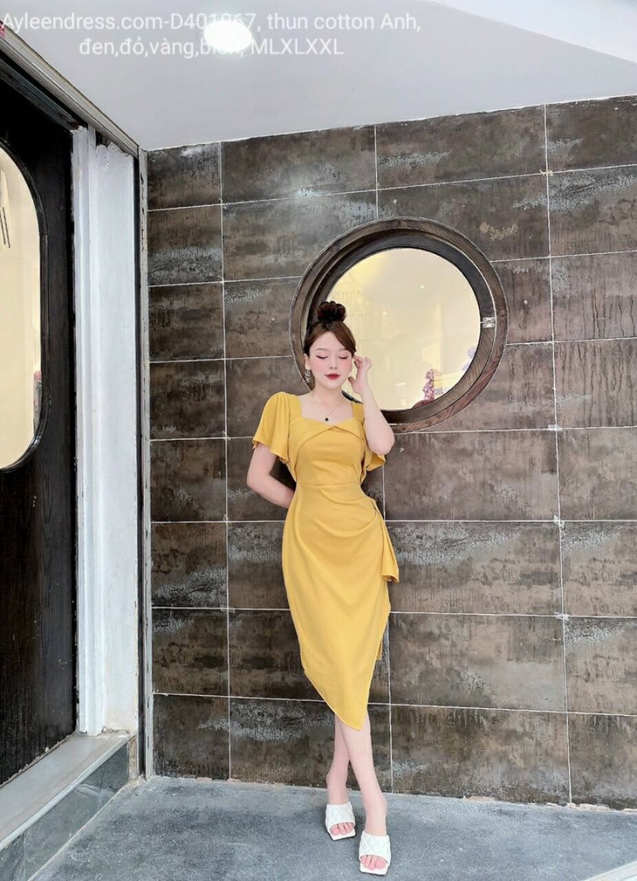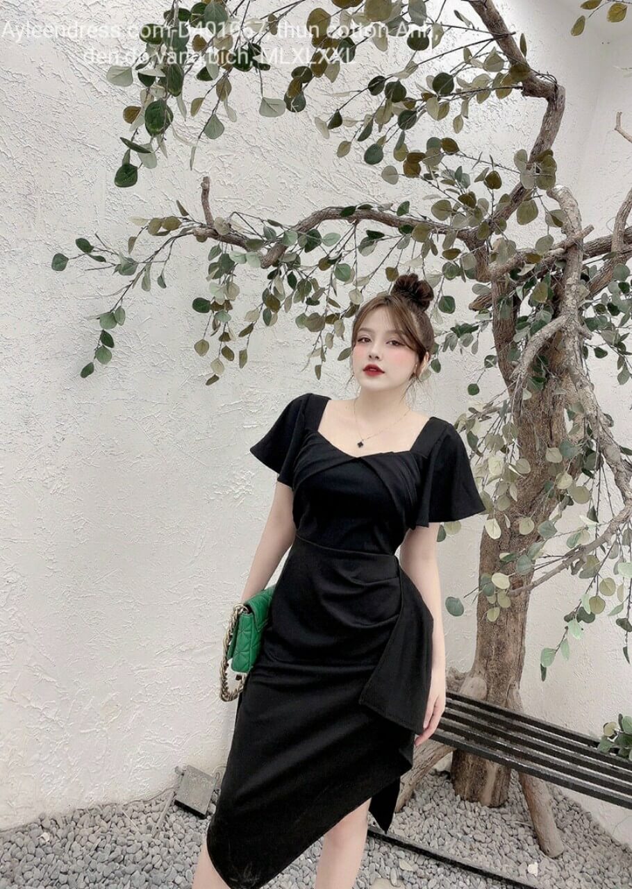 Đầm body cổ vuông xếp ly tà xéo