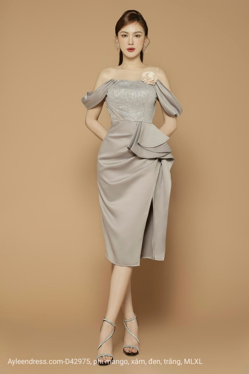 Đầm body rớt vai phối lưới kim tuyến (Kèm hoa)