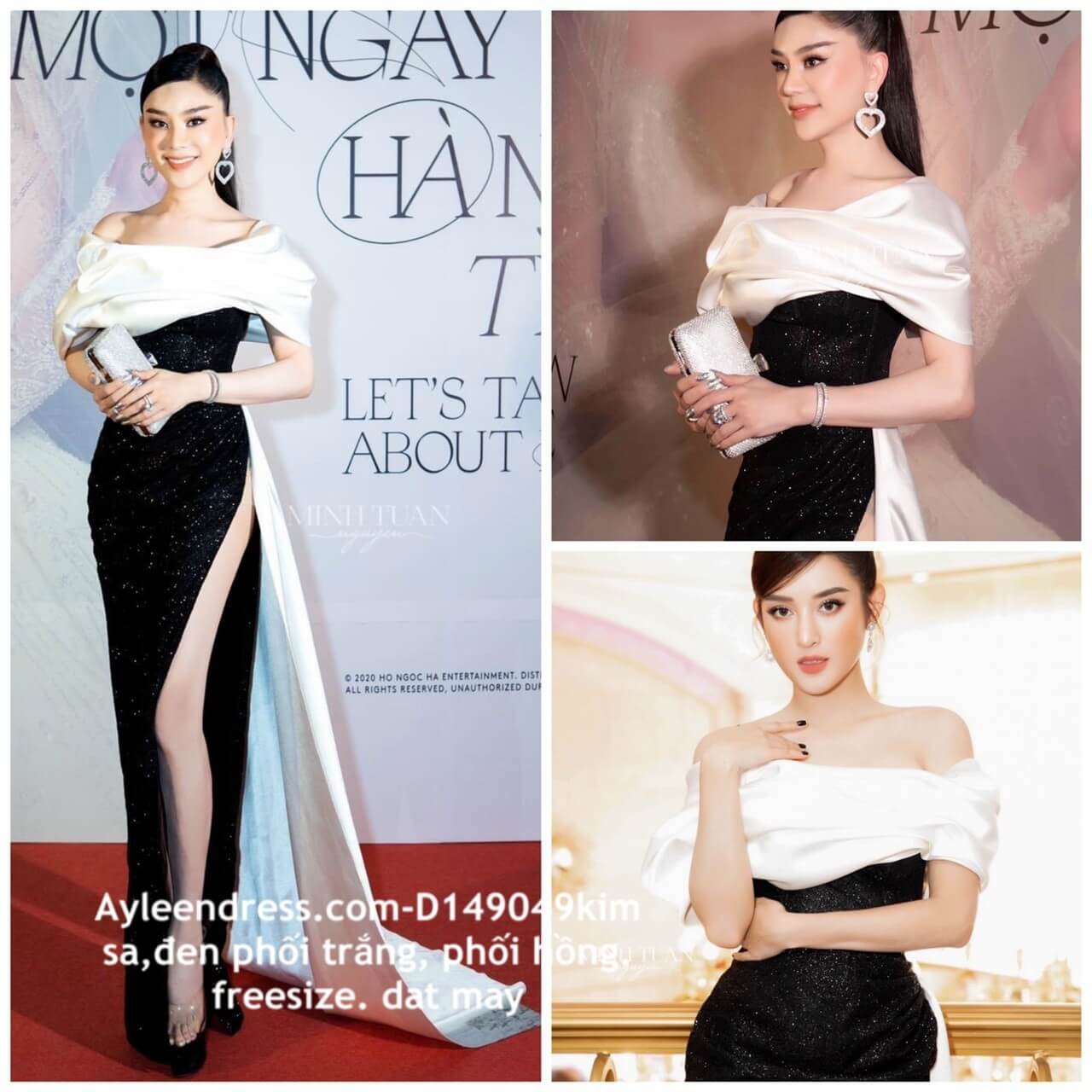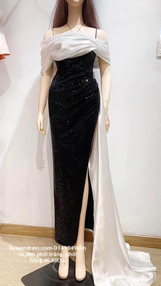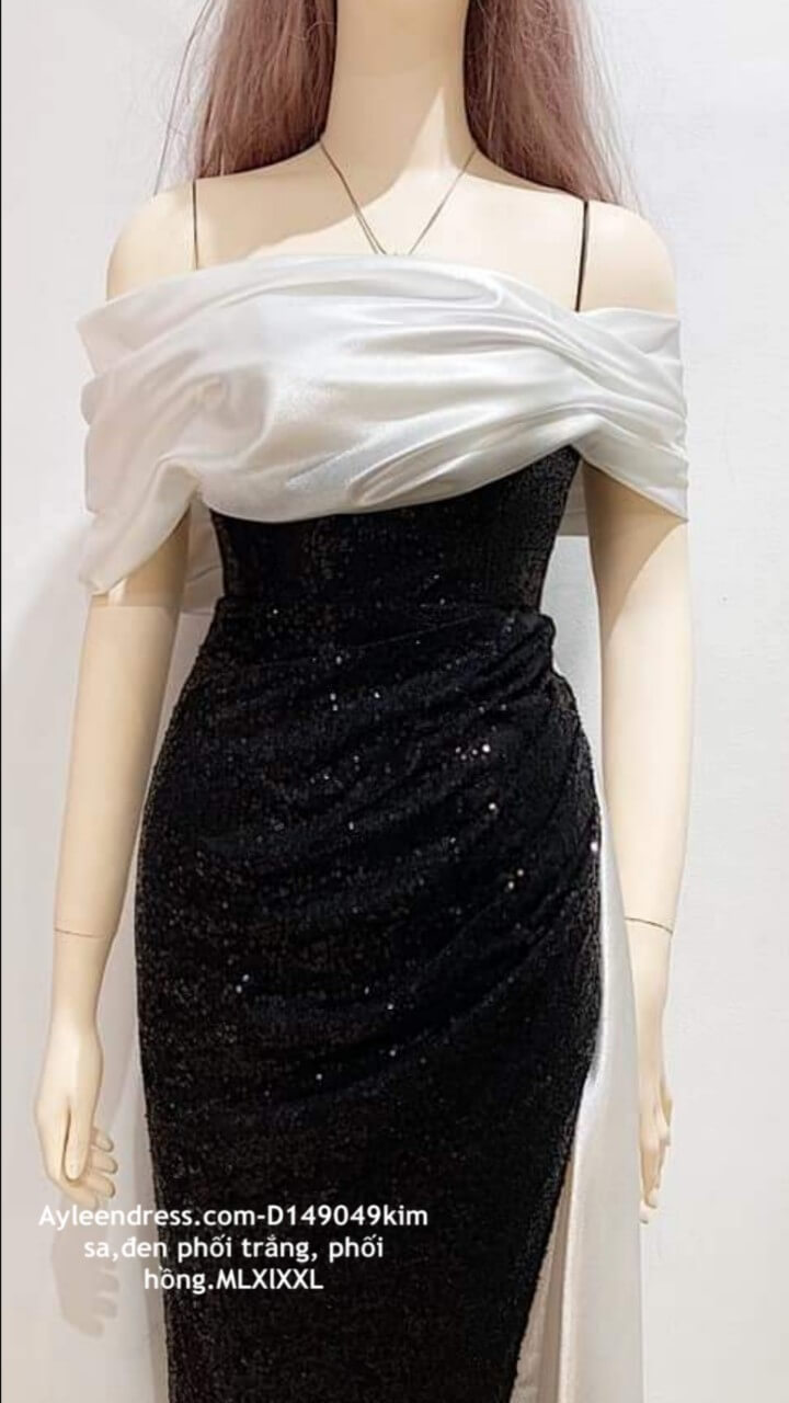 Đầm dạ hội cao cấp trễ vai đen phối trắng sang trọng