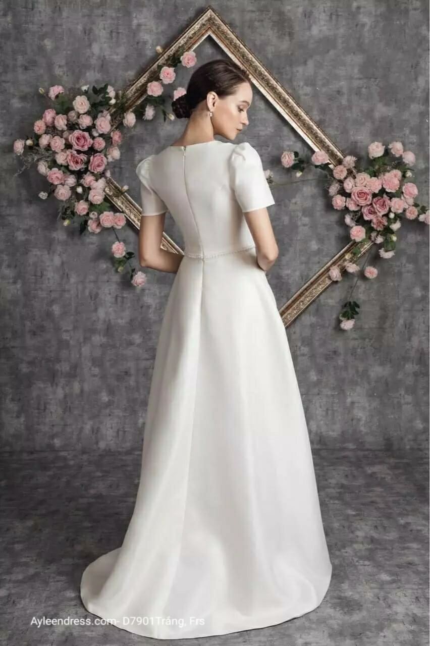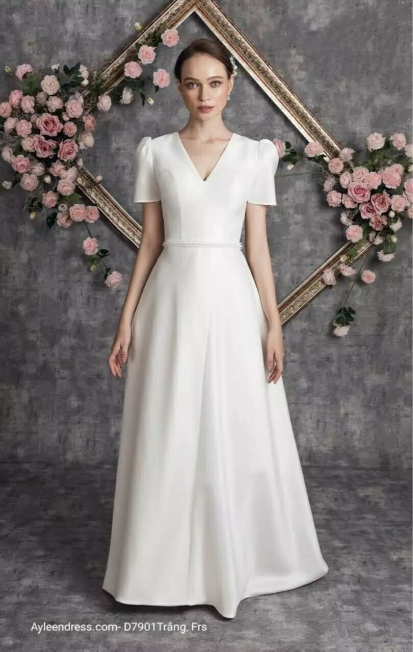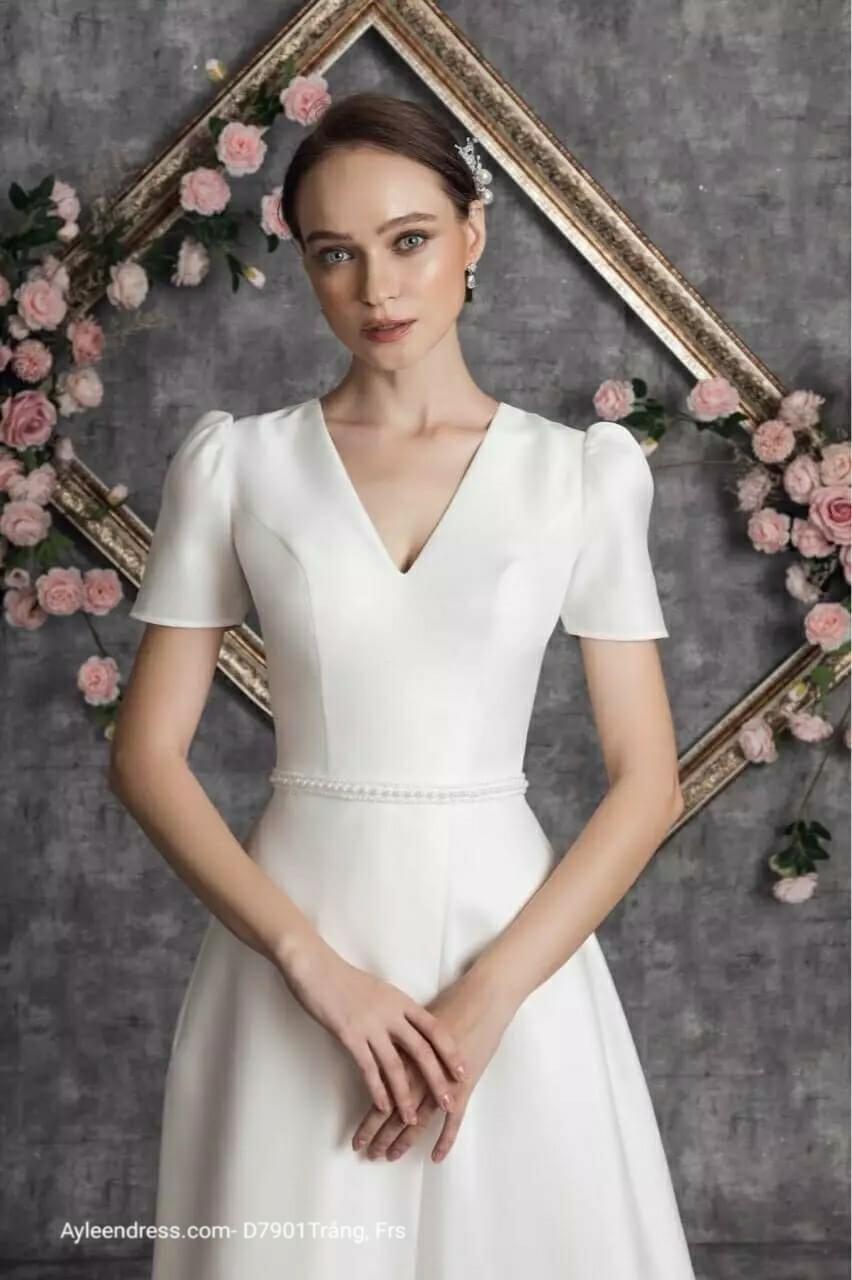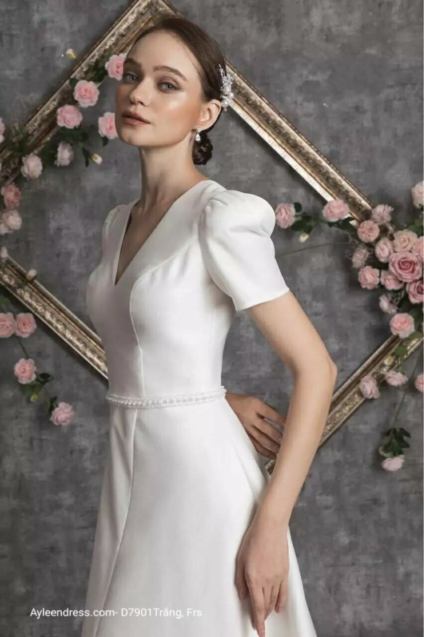 Đầm dạ hội cô dâu kiểu xoè tay con cổ V eo đính ngọc