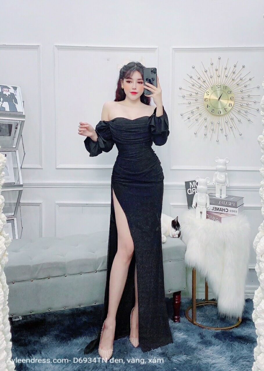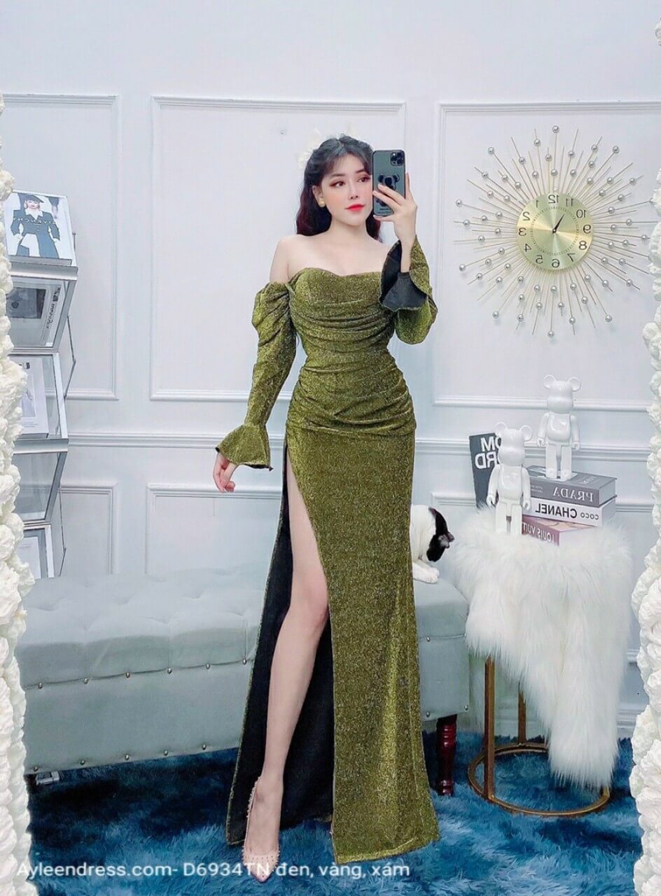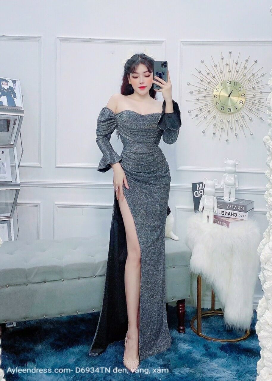 Đầm dạ hội cúp ngực trễ vai tay dài loe cổ tay
