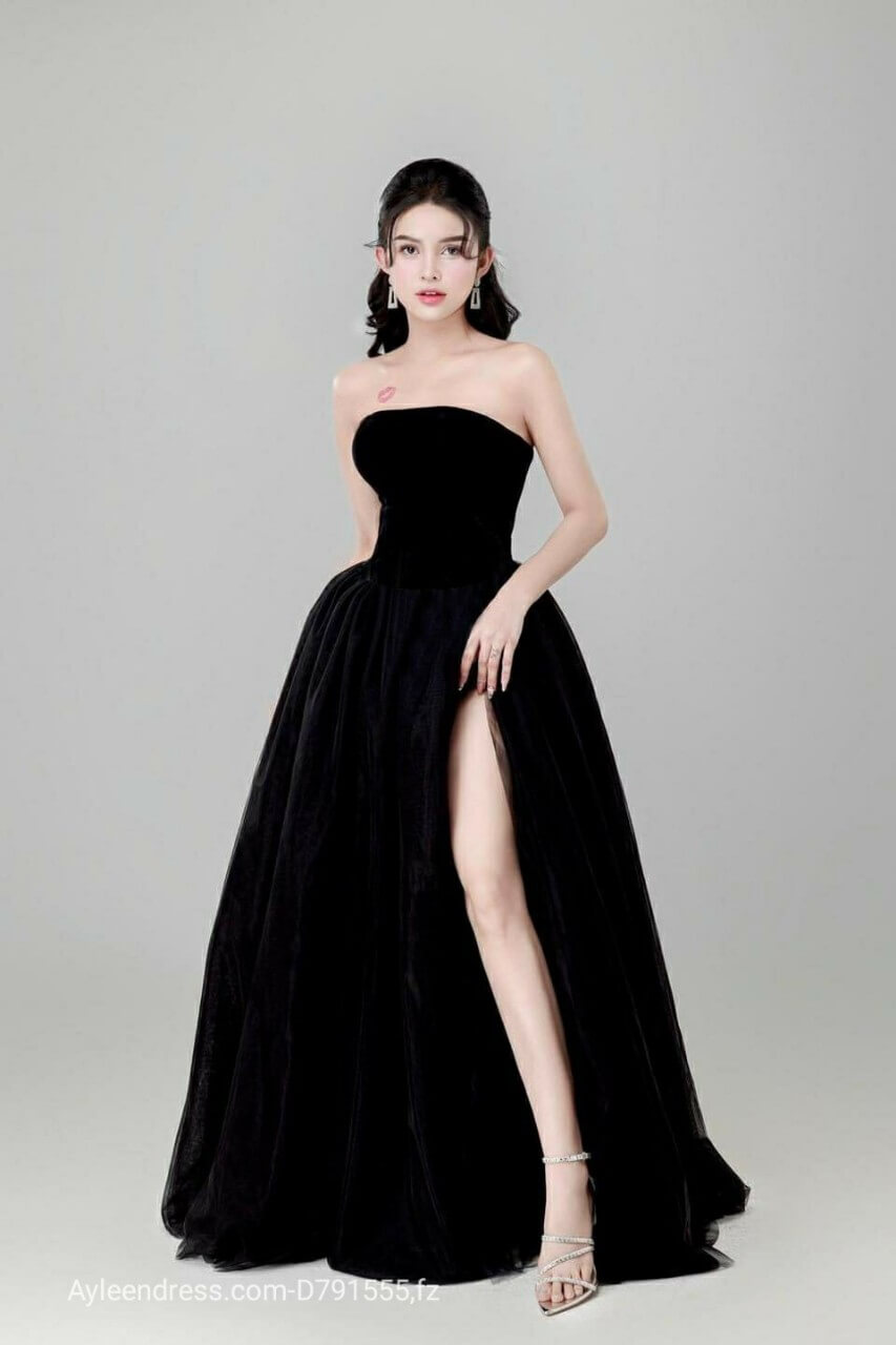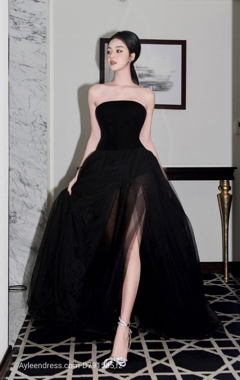 Đầm dạ hội cúp ngực xẻ tà phối lưới dự tiệc