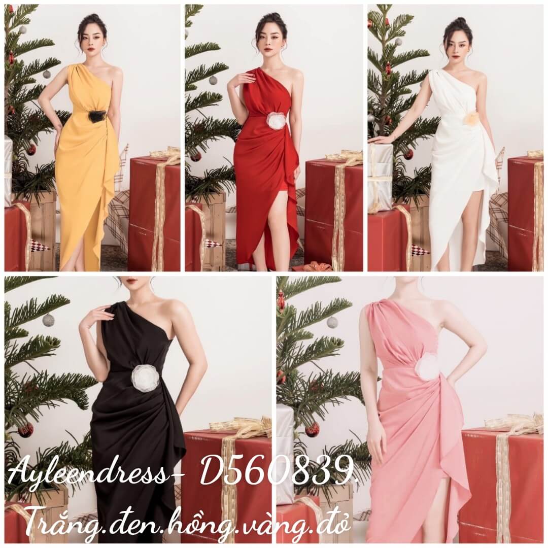 Đầm dạ hội kiểu lệch vai xẻ đùi phối hoa eo