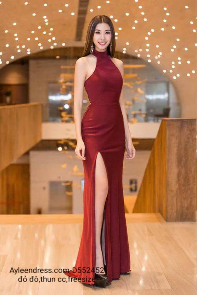 Đầm dạ hội màu đỏ kiểu cổ yếm xẻ tà