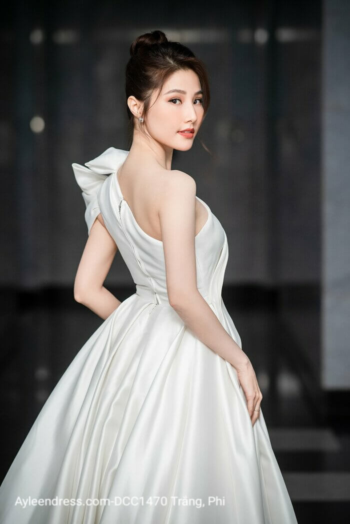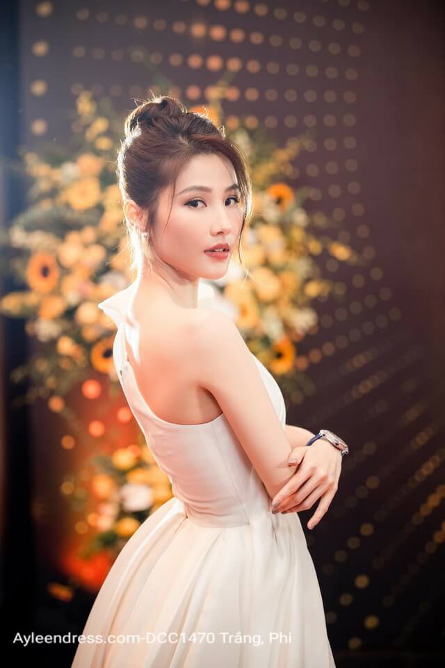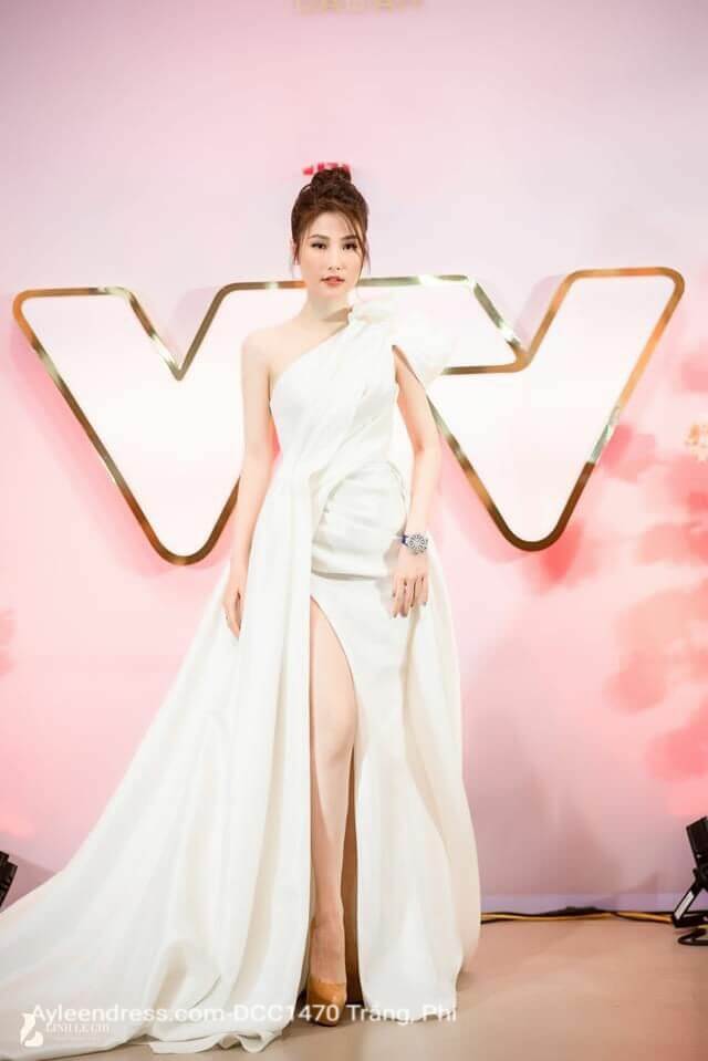 Đầm dạ hội màu trắng Diễm My lệch vai đuôi xòe
