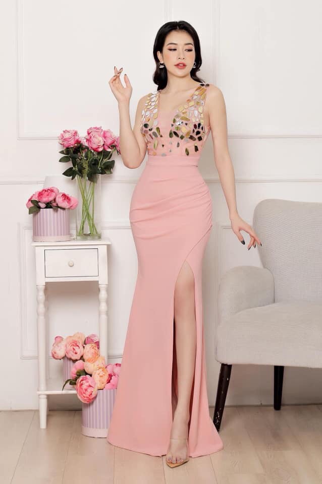 Đầm dạ hội ôm body xẻ tà đính đá gương ngũ sắc