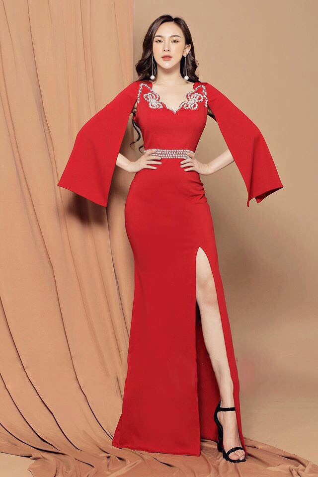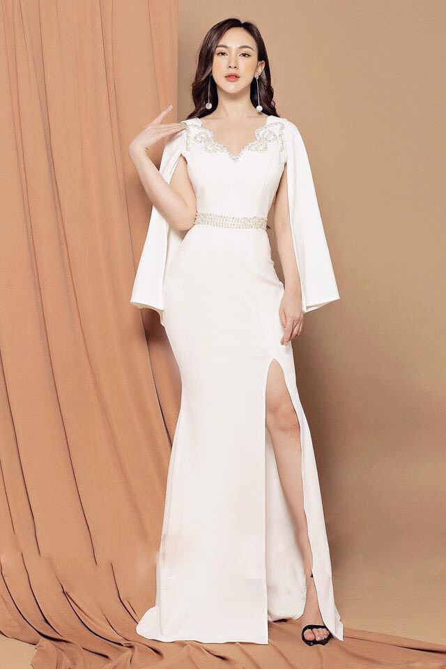 Đầm dạ hội tay choàng đính ngọc trai cao cấp