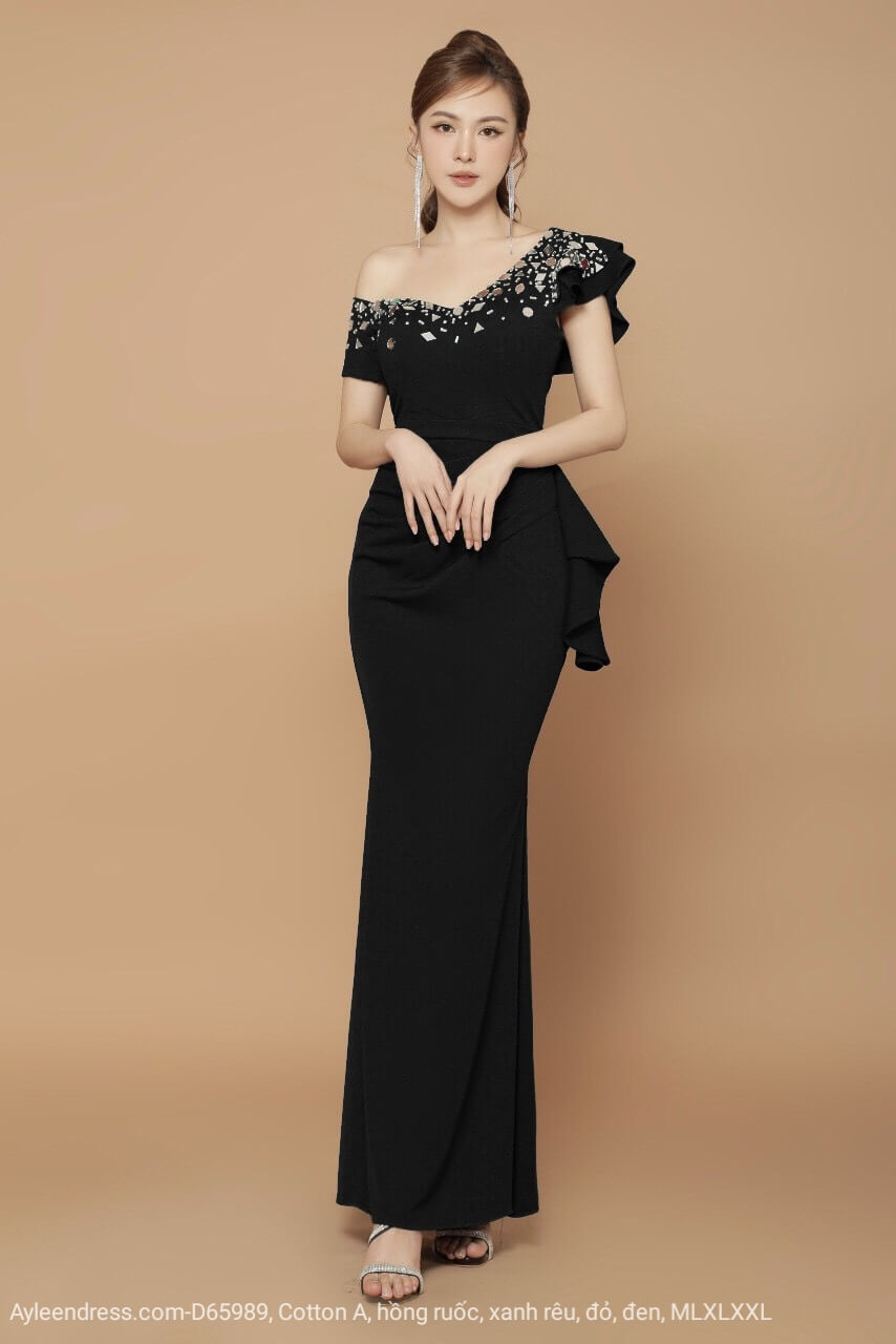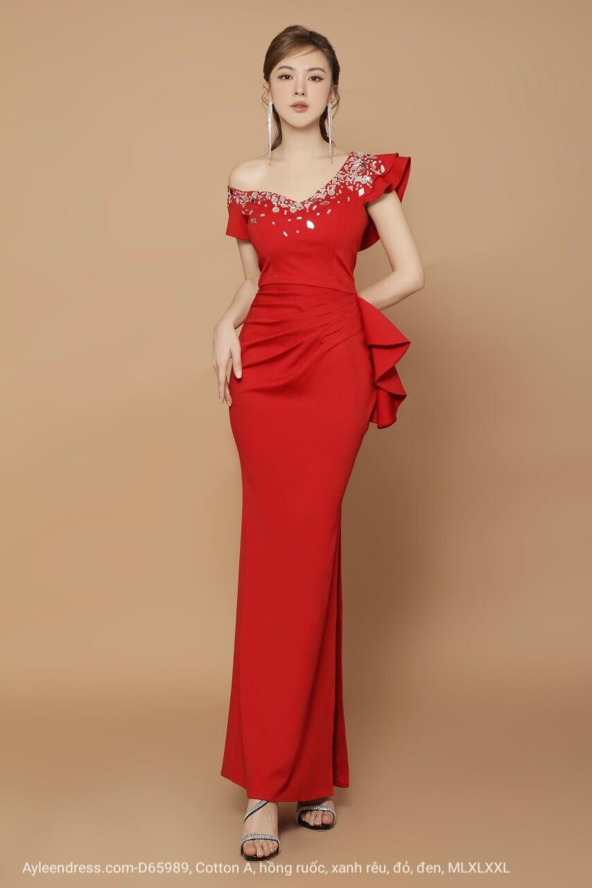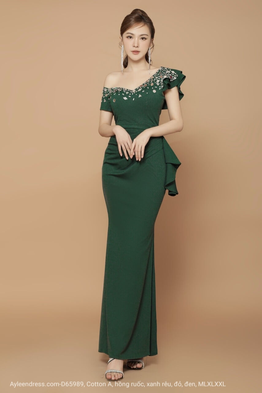 Đầm dạ hội tay ngắn lệch vai đính đá tứ giác