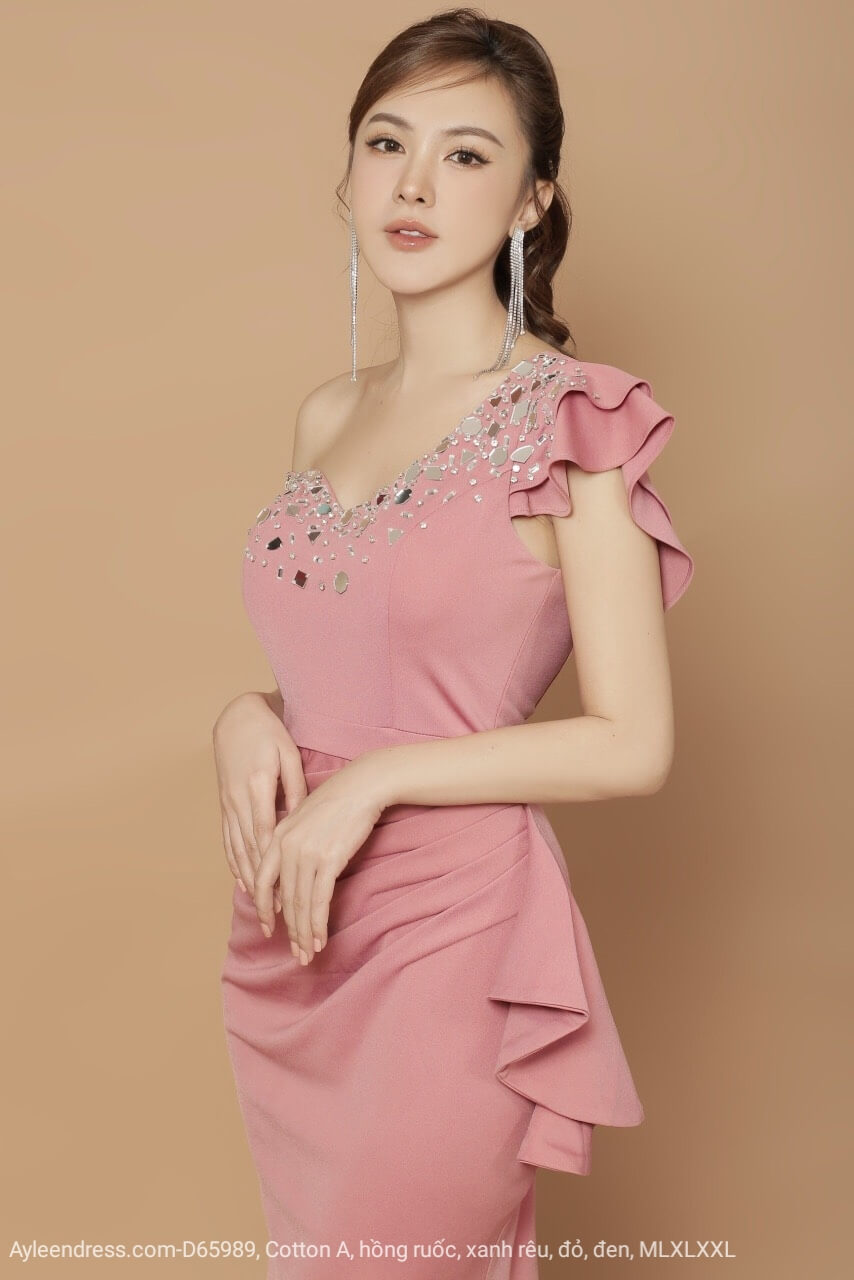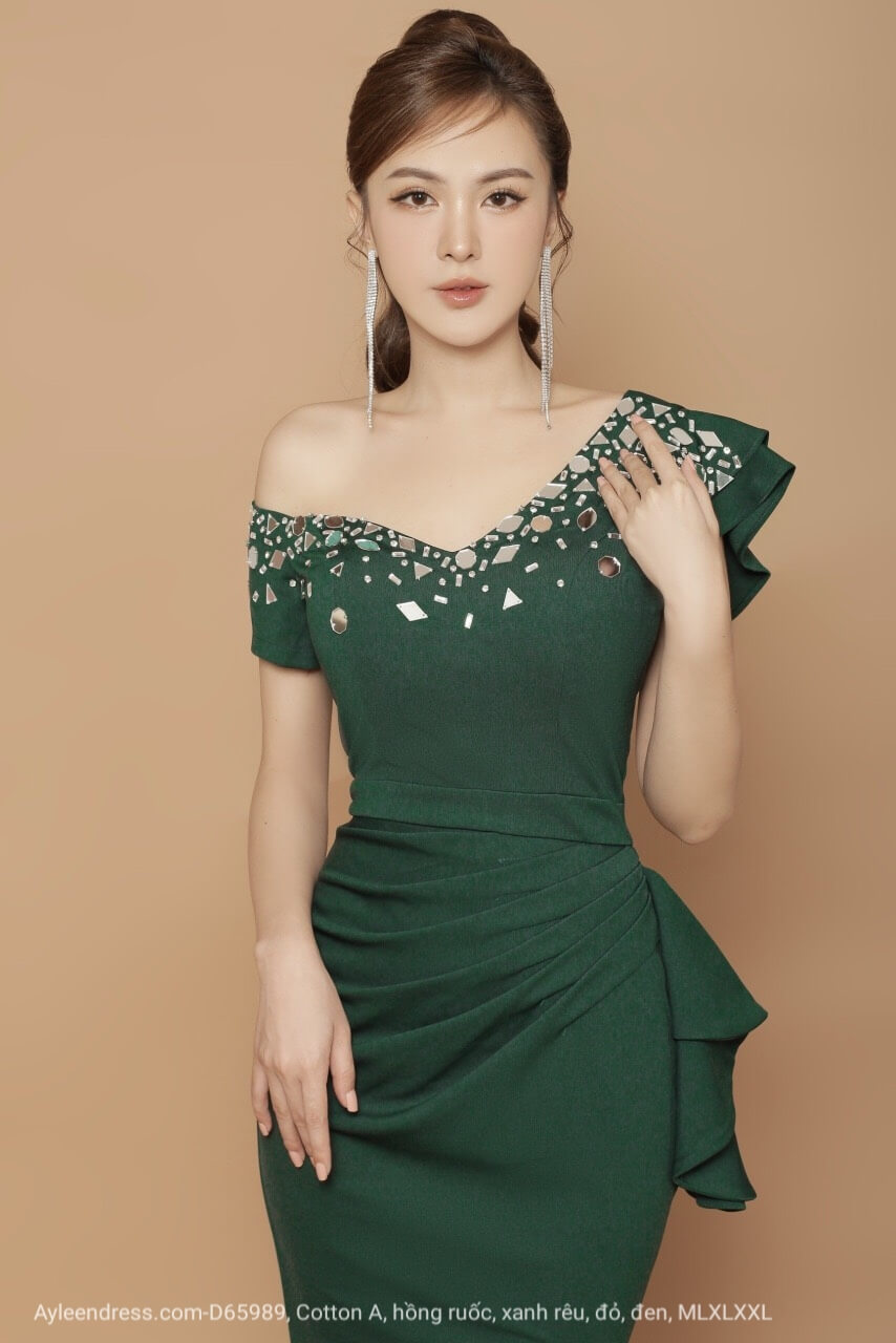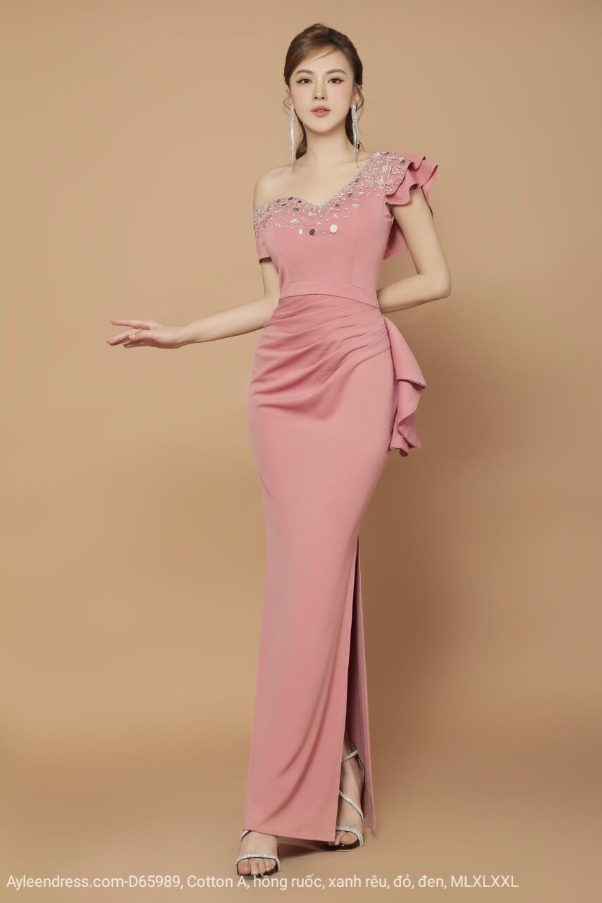Đầm dạ hội tay ngắn lệch vai đính đá tứ giác