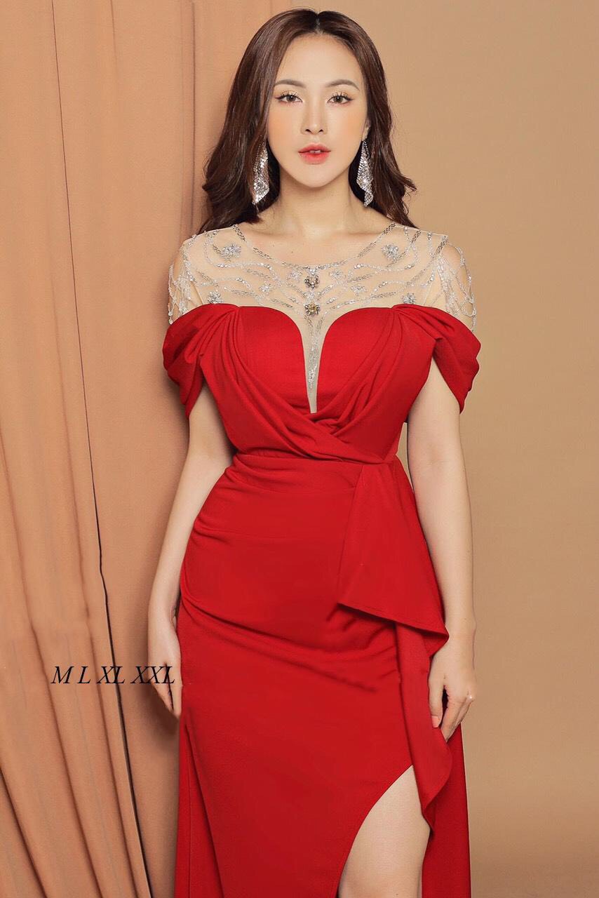 Đầm dạ hội xẻ tà đính kim sa rớt vai