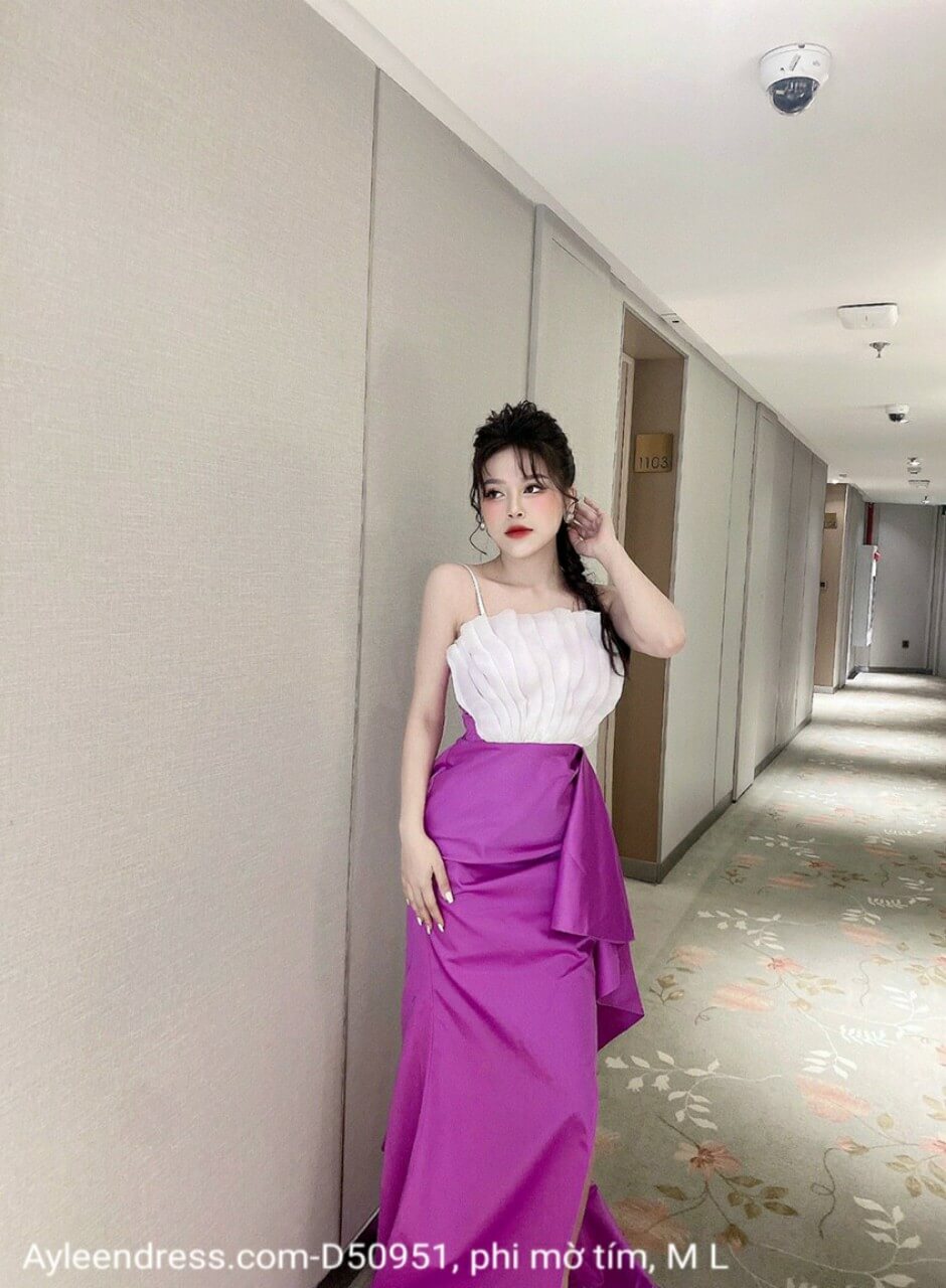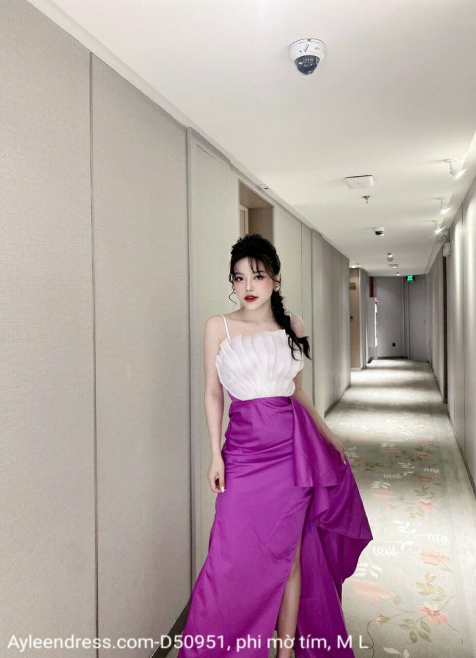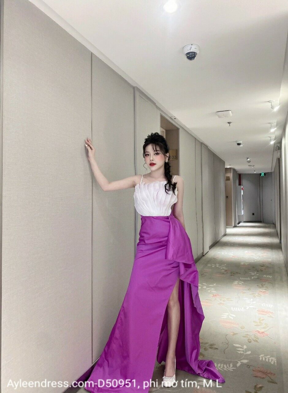 Đầm dạ hội tím xoè xẻ tà xếp ly
