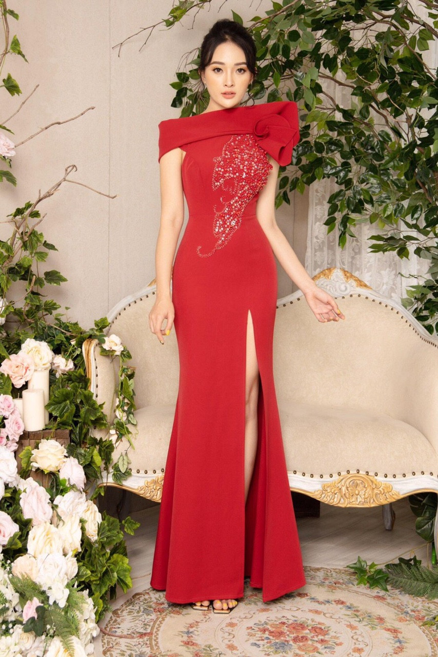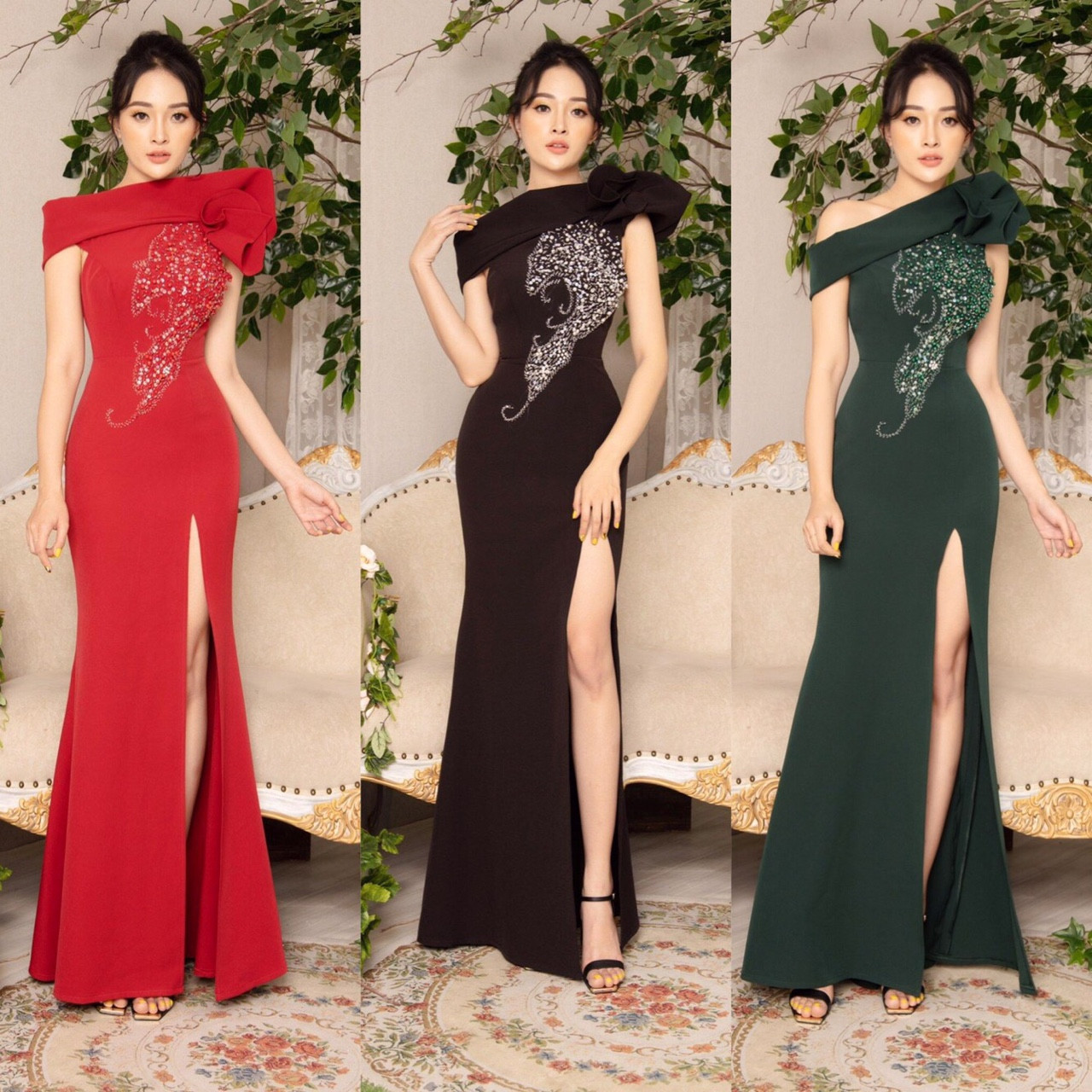 Đầm dạ hội trễ vai kết nơ xẻ tà cá tính