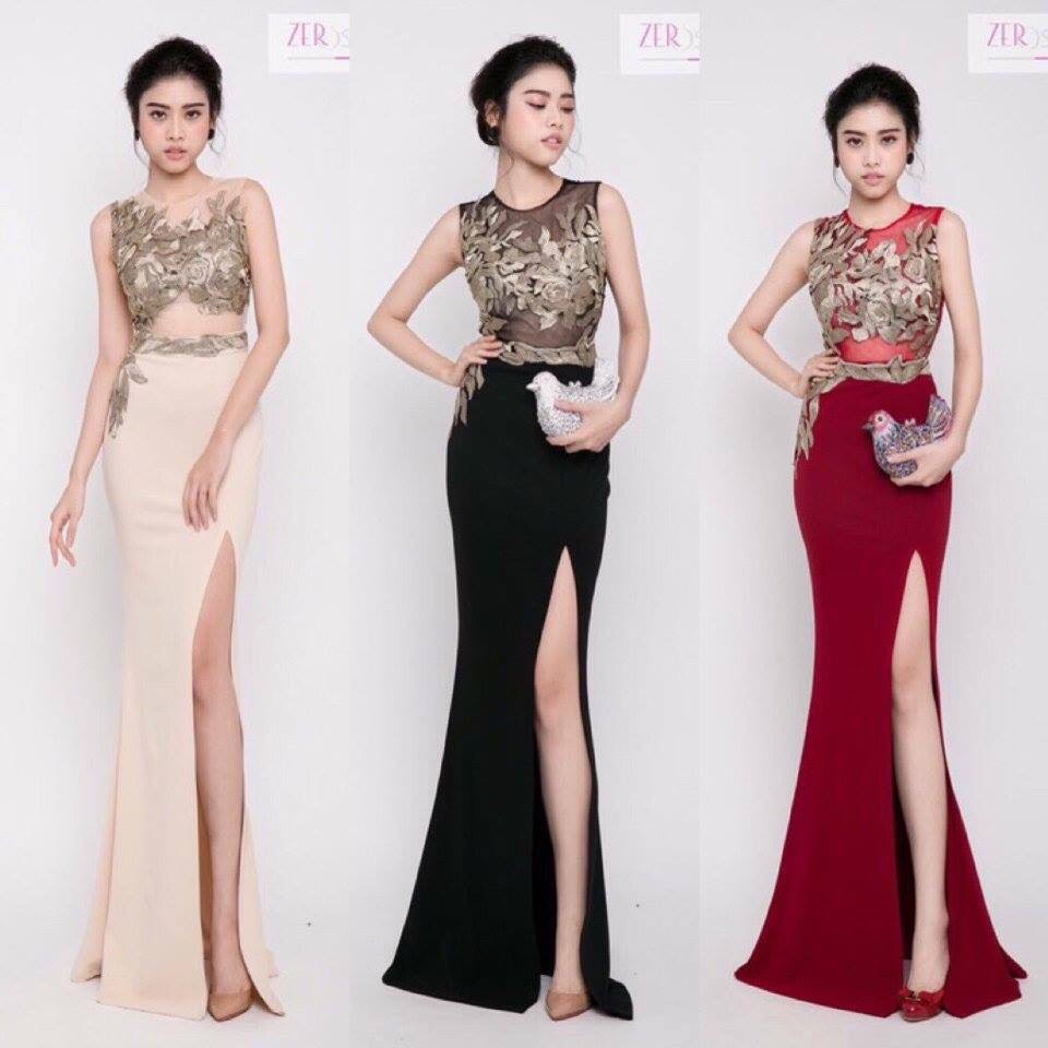 Đầm dạ hội xẻ tà đắp ren