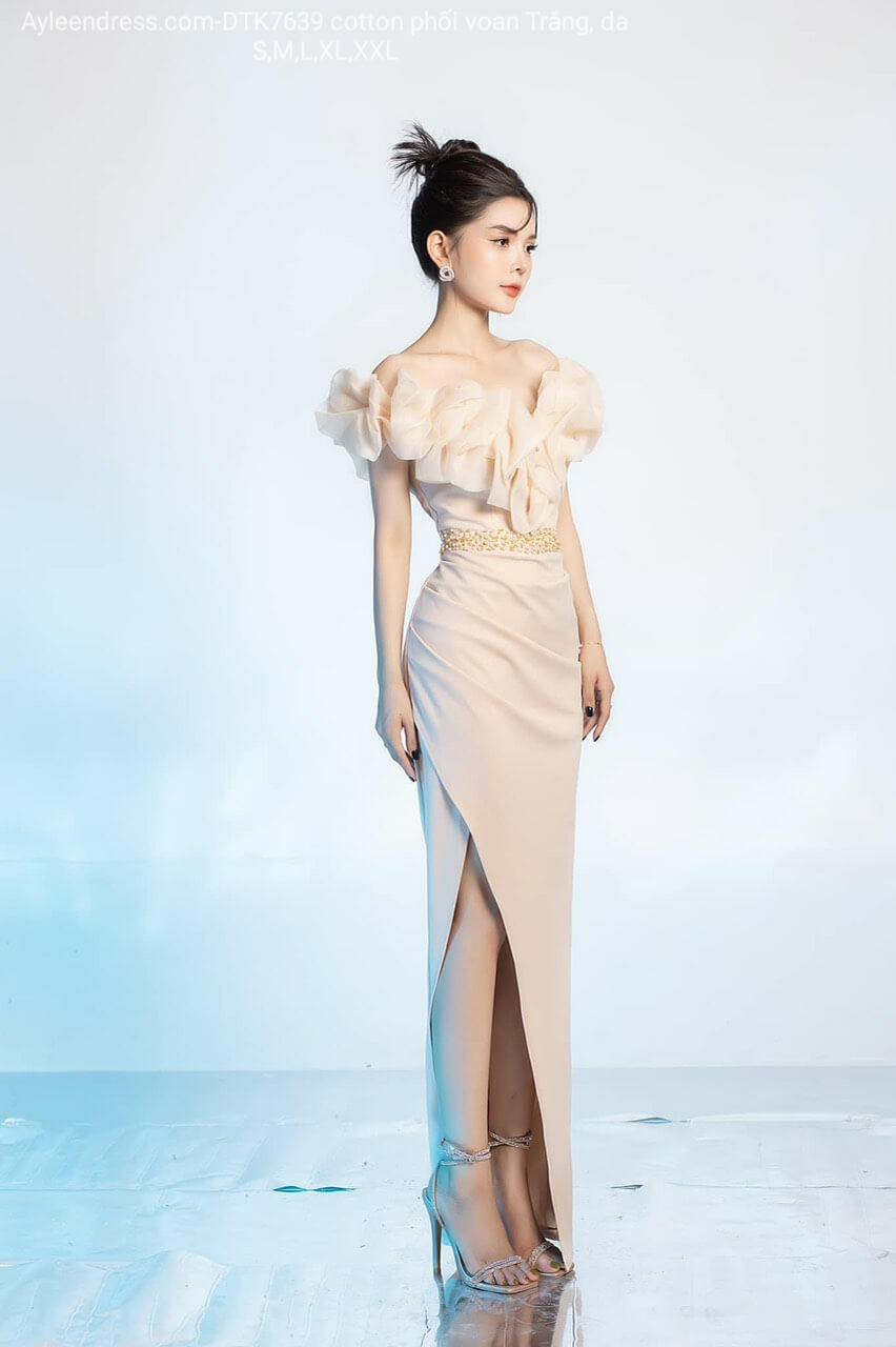 Đầm dạ hội xẻ tà trễ vai voan đính ngọc eo