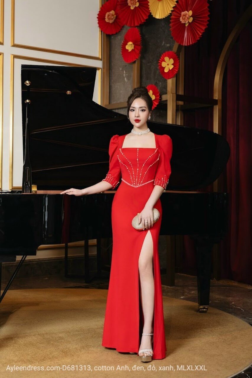 Đầm dạ hội cổ vuông tay lửng kết pha lê