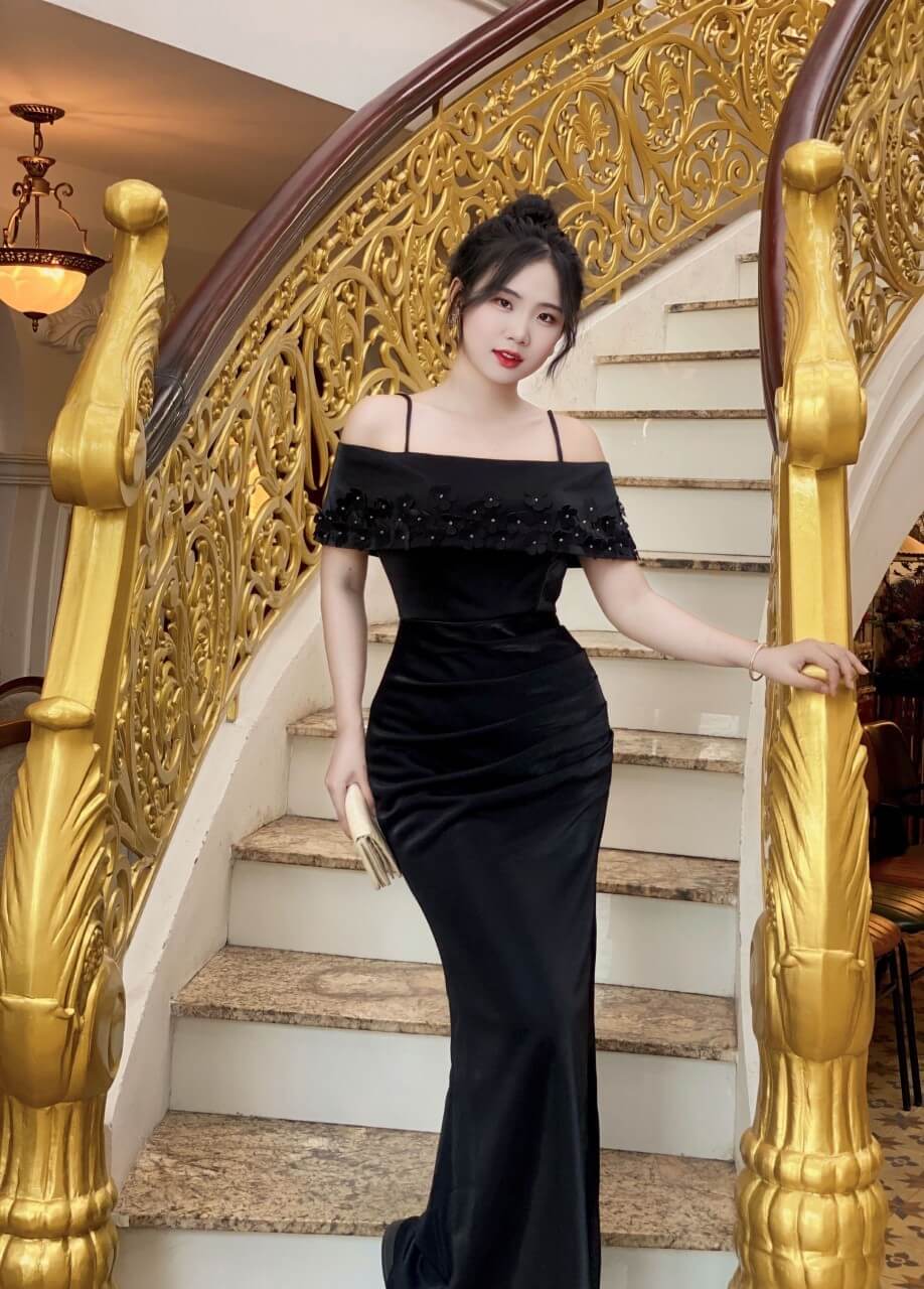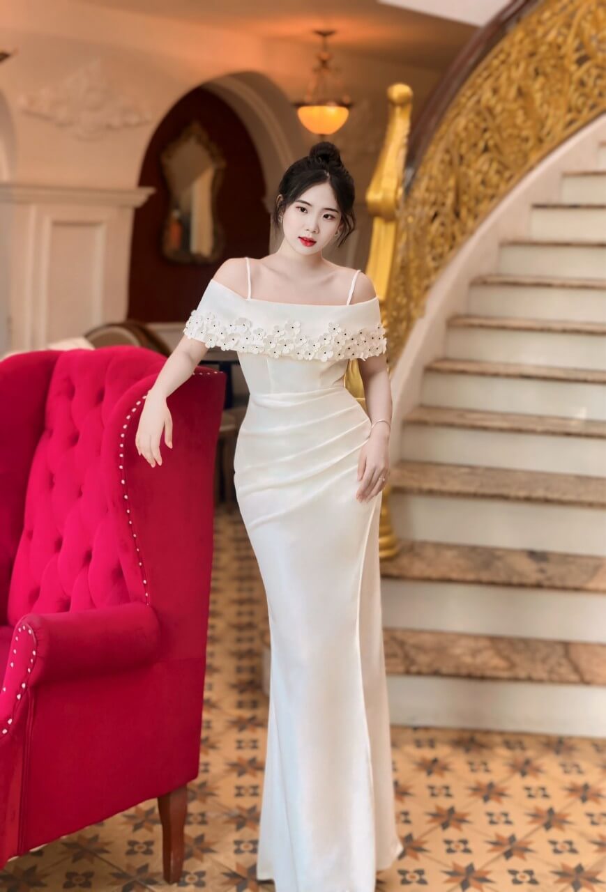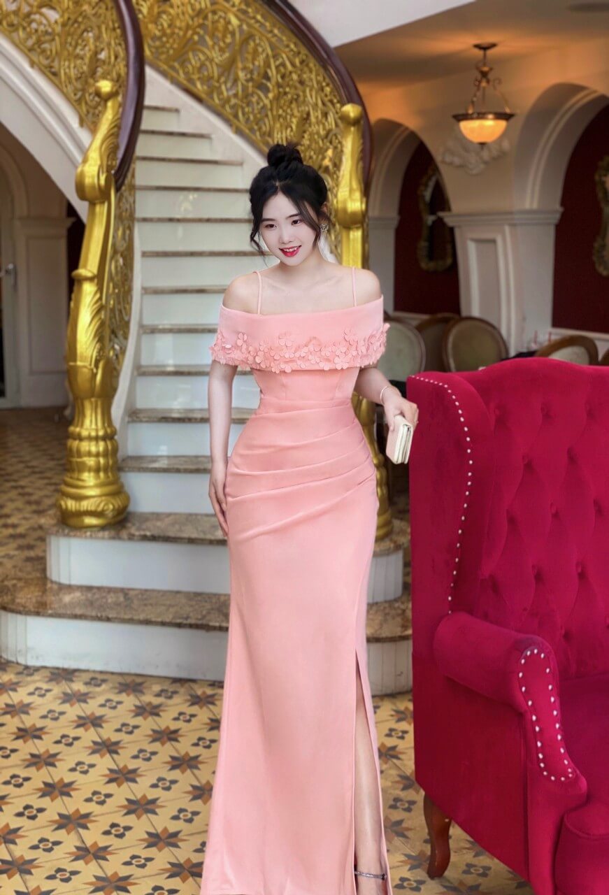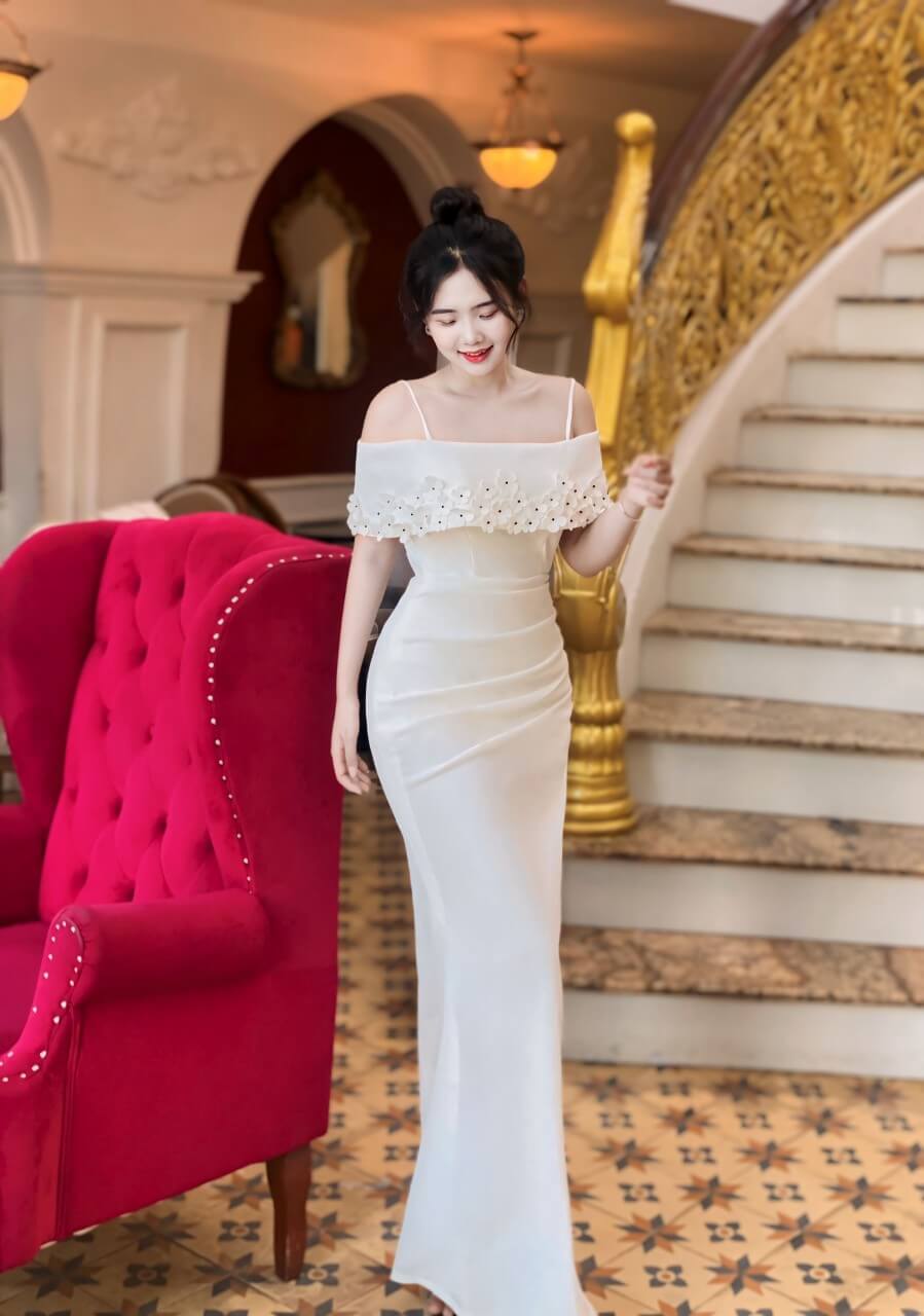 Đầm dạ hội trễ vai đính bông