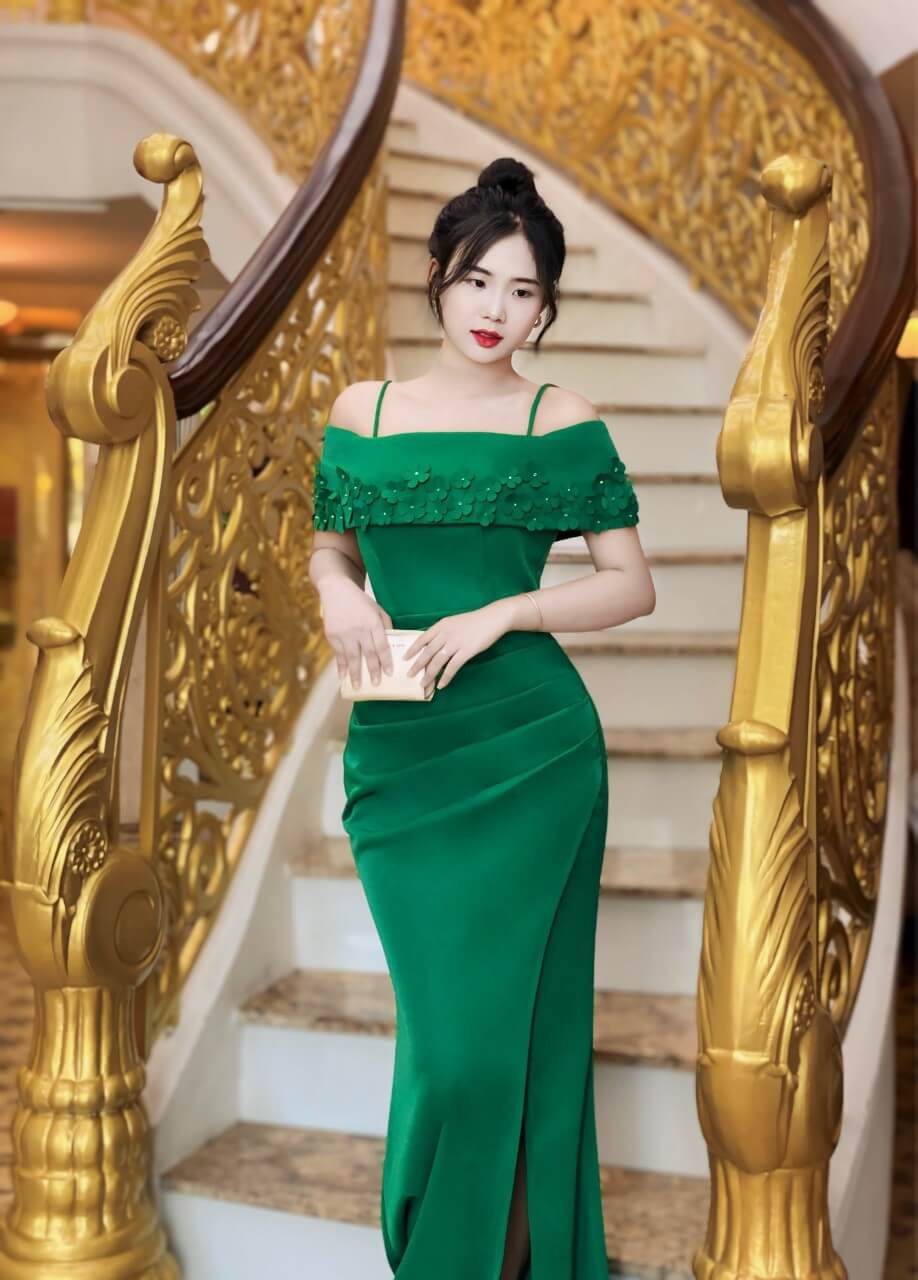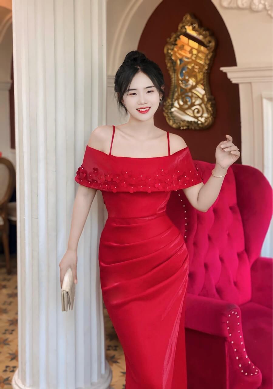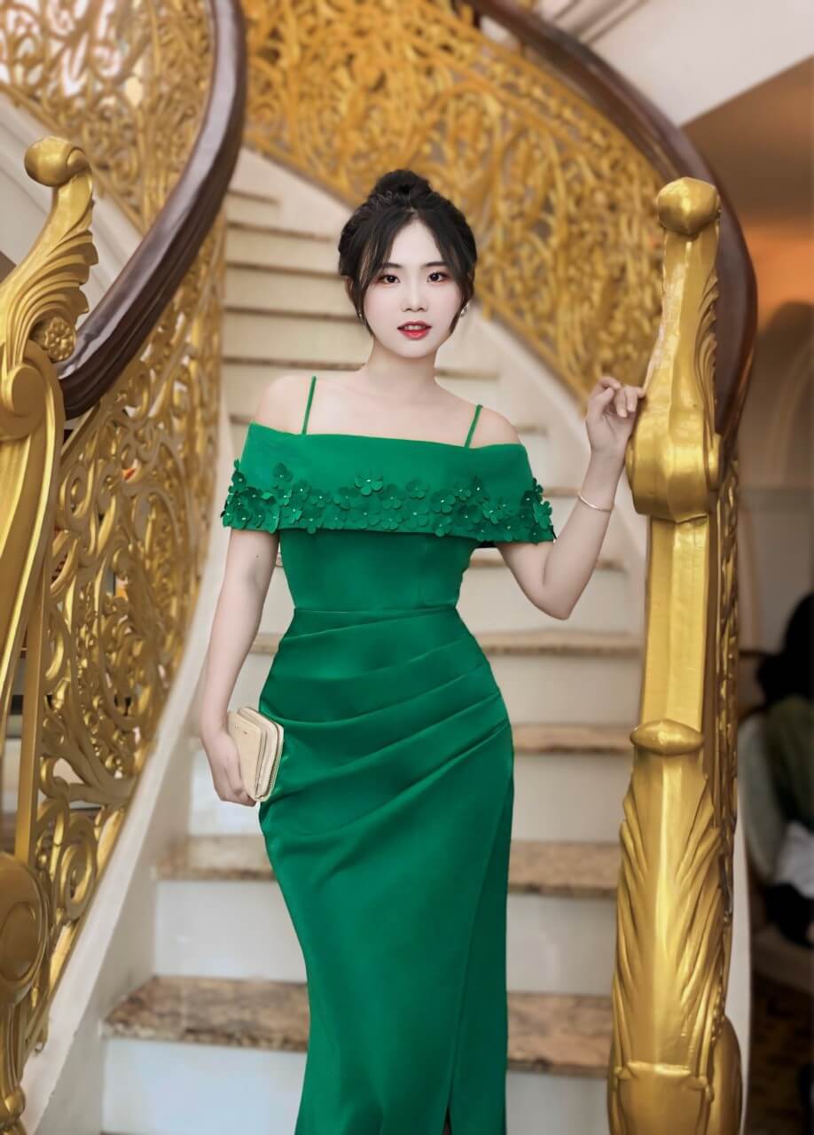 Đầm dạ hội trễ vai đính bông