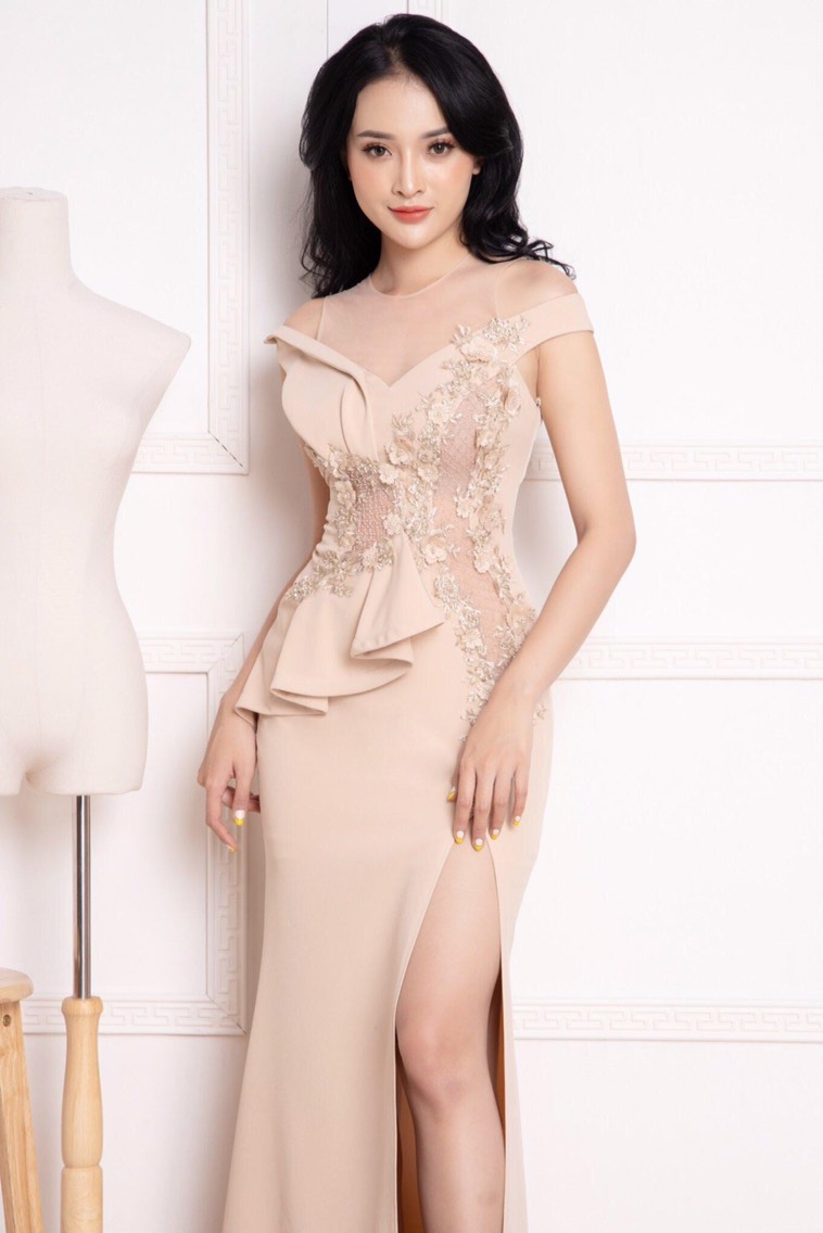 Đầm dài dự tiệc xẻ tà trễ vai vạt eo kết hạt quyến rũ