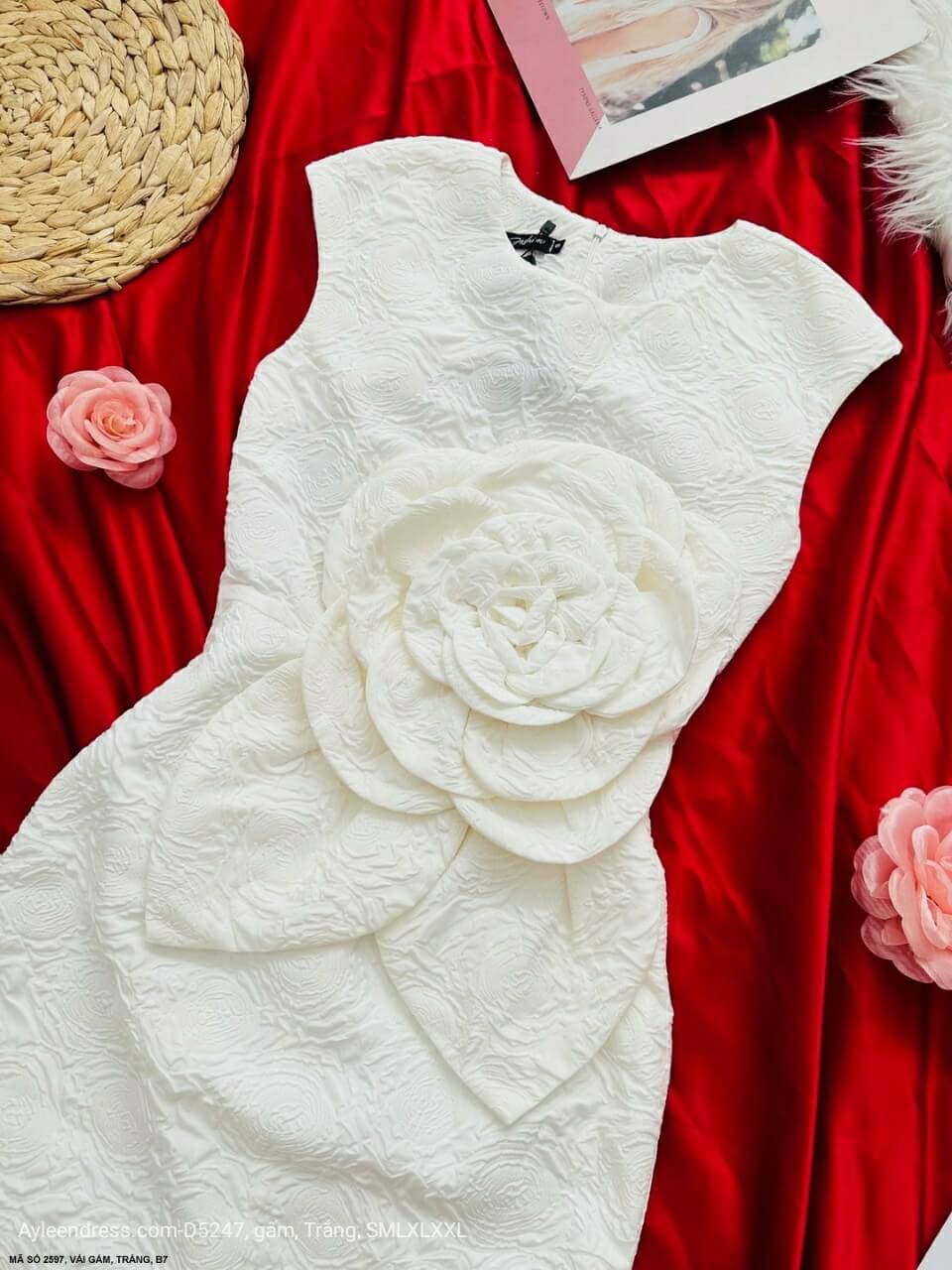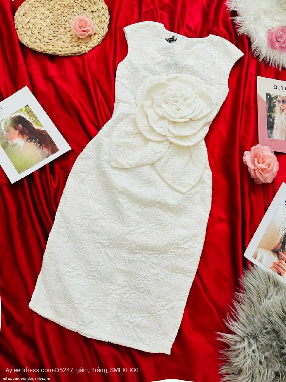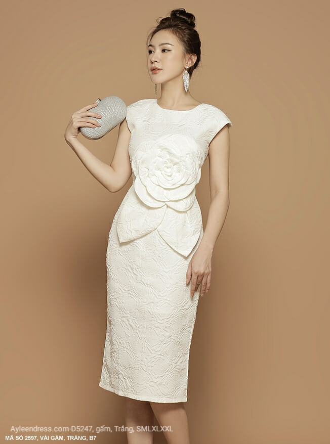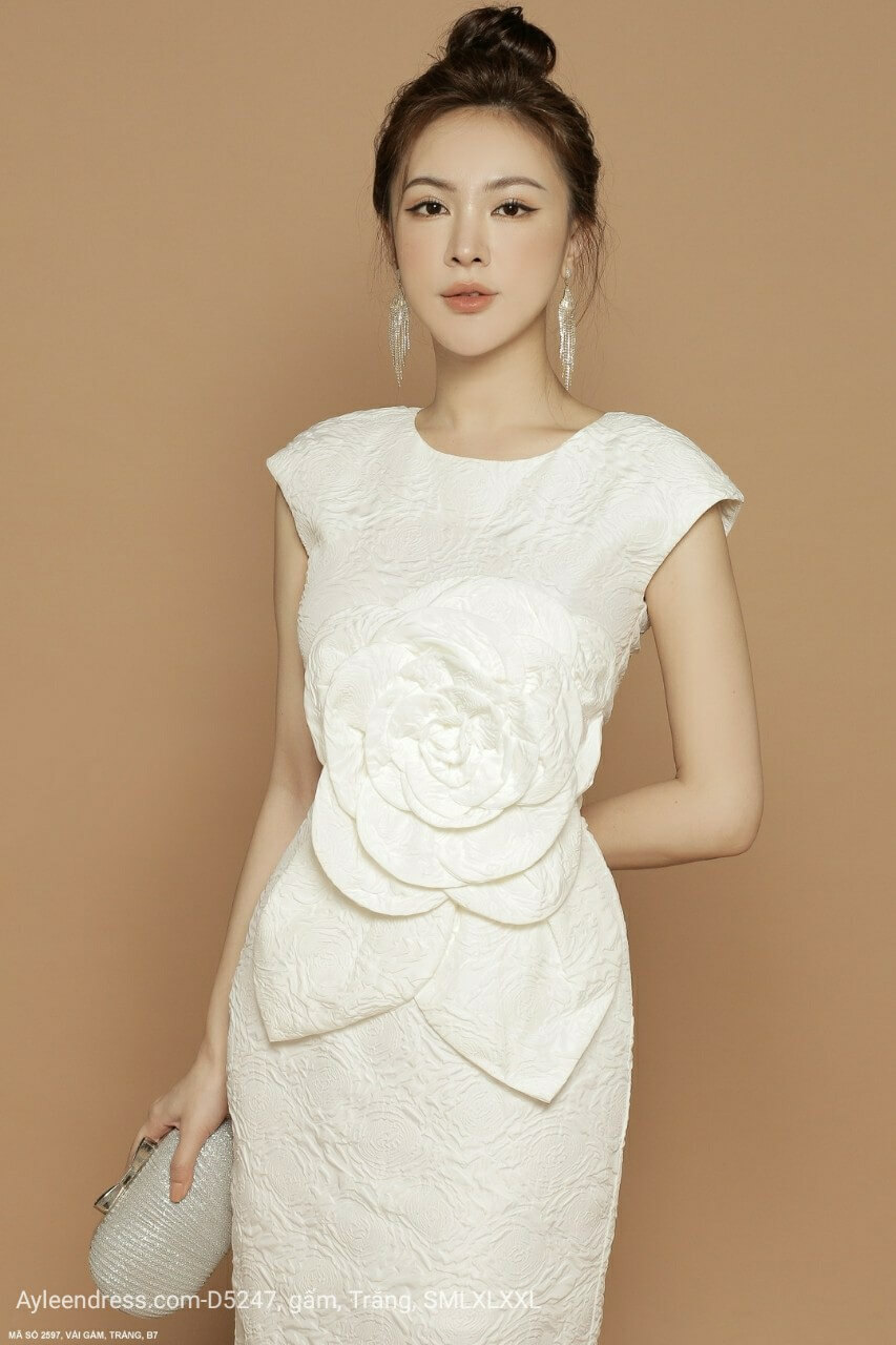 Đầm gấm ôm body dự tiệc hoa lớn trước ngực sang trọng