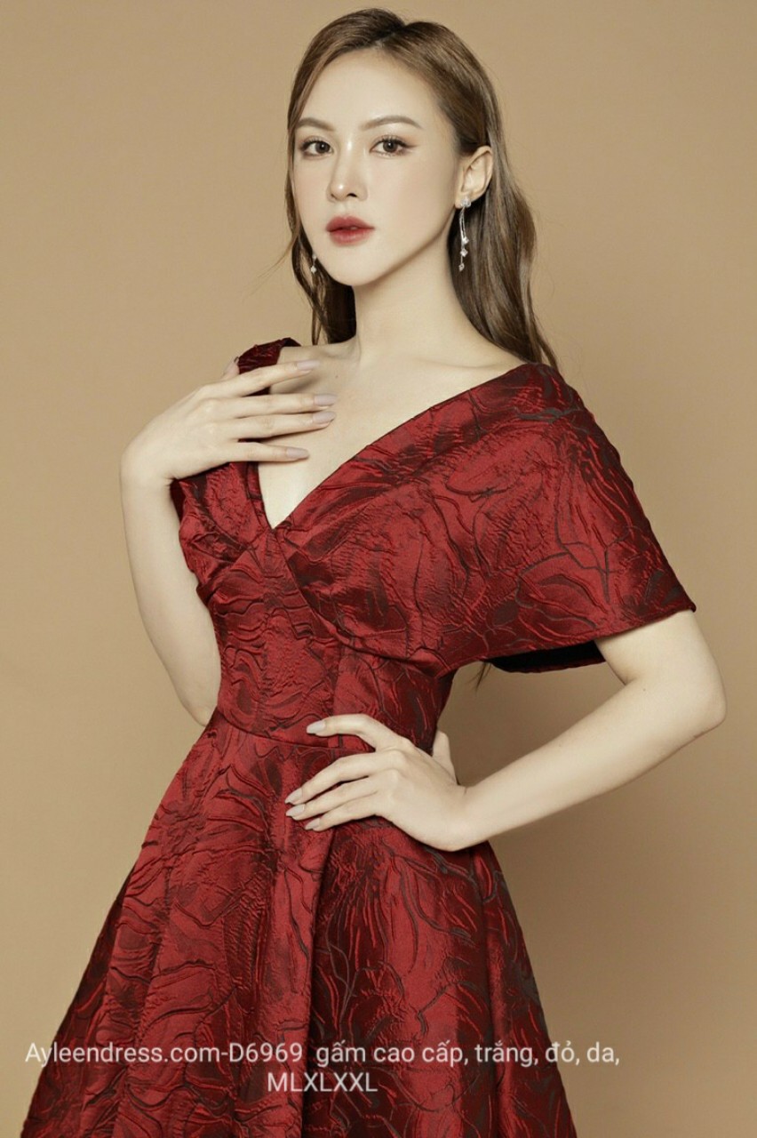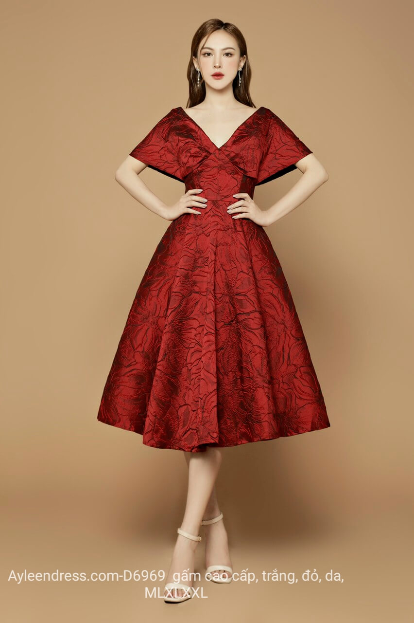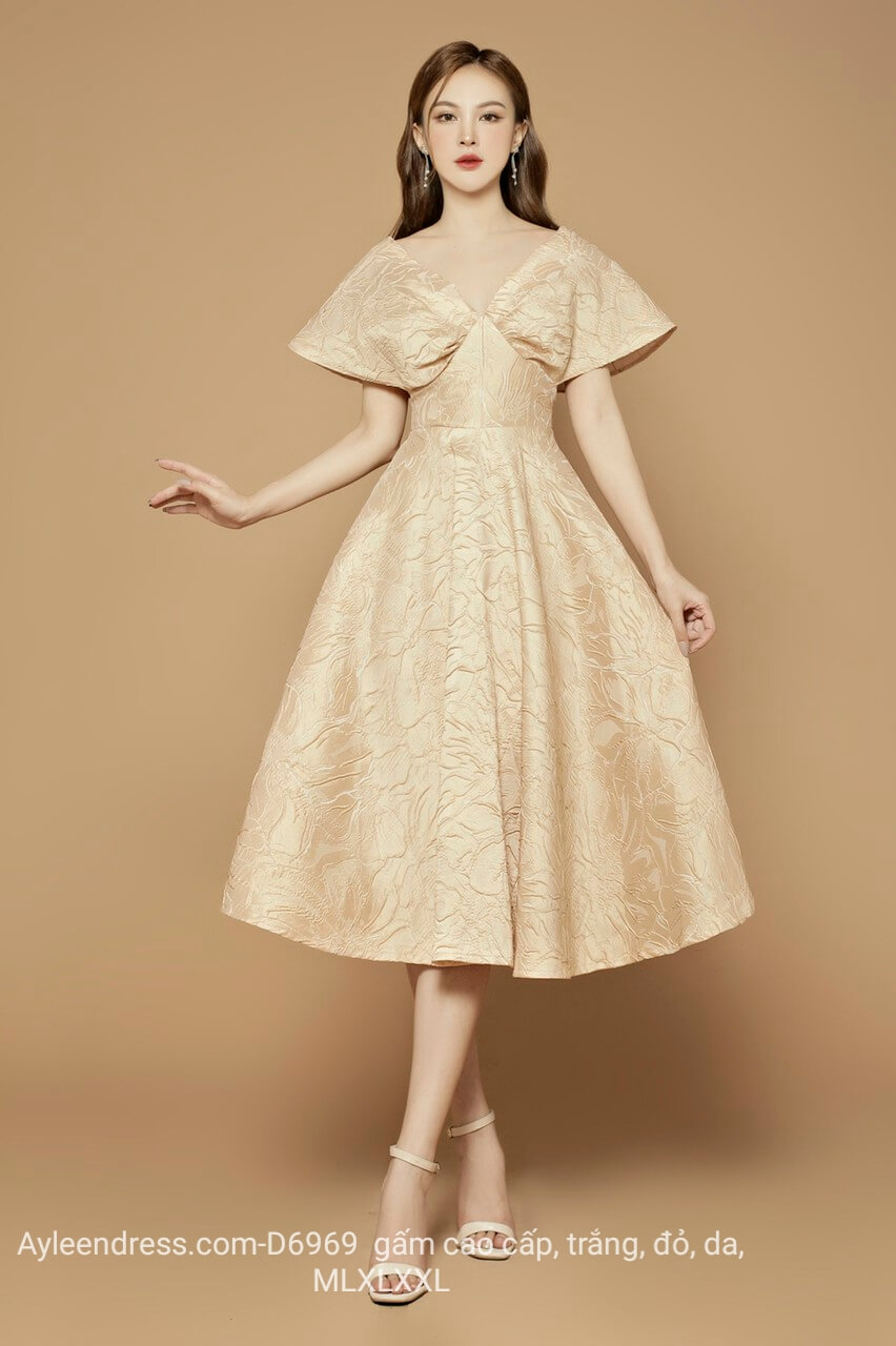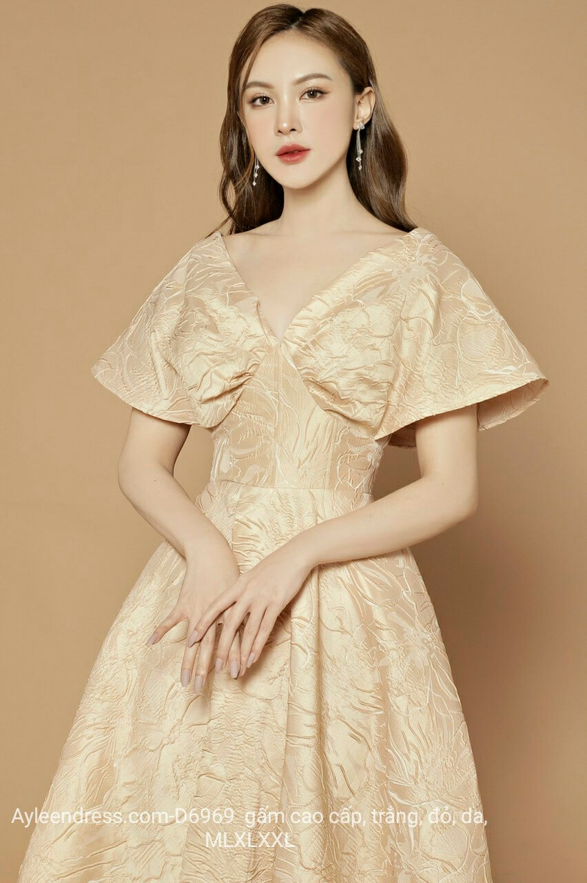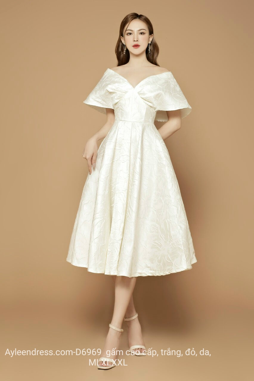 Đầm gấm xoè trễ vai (tùng xoè rất rộng)