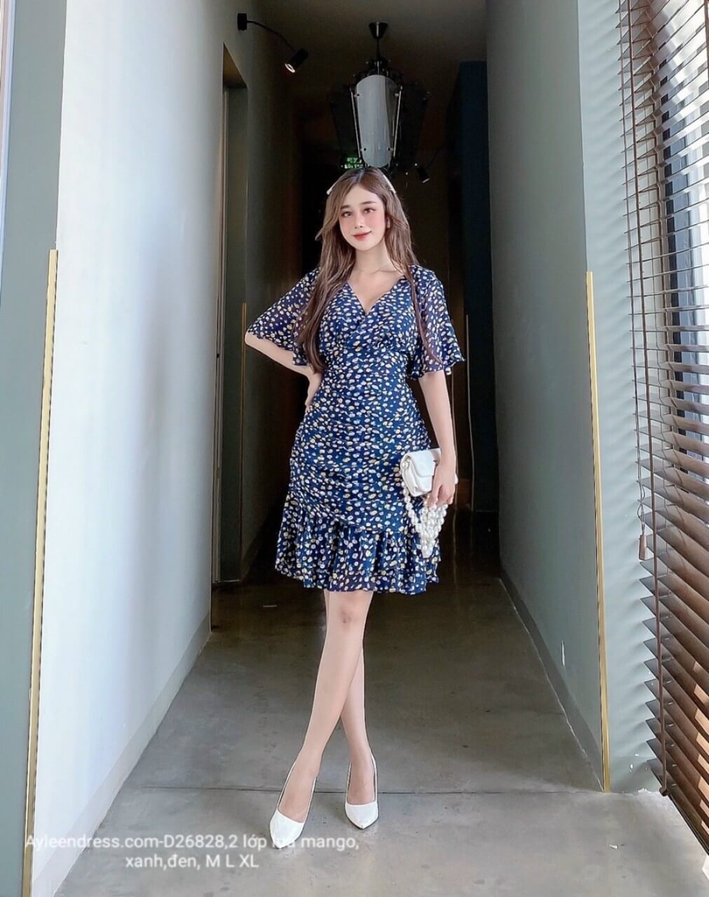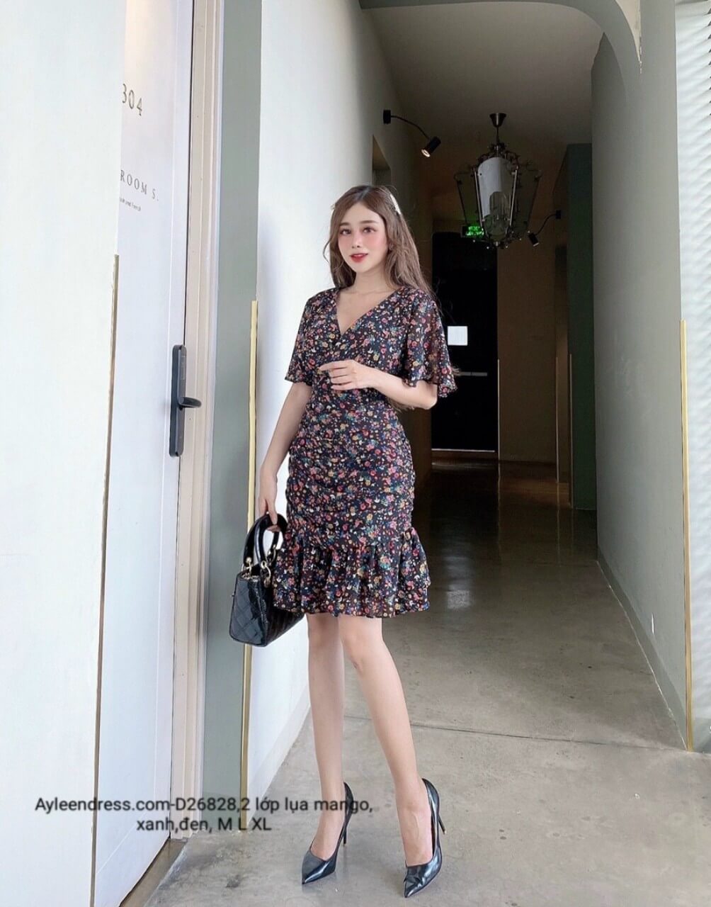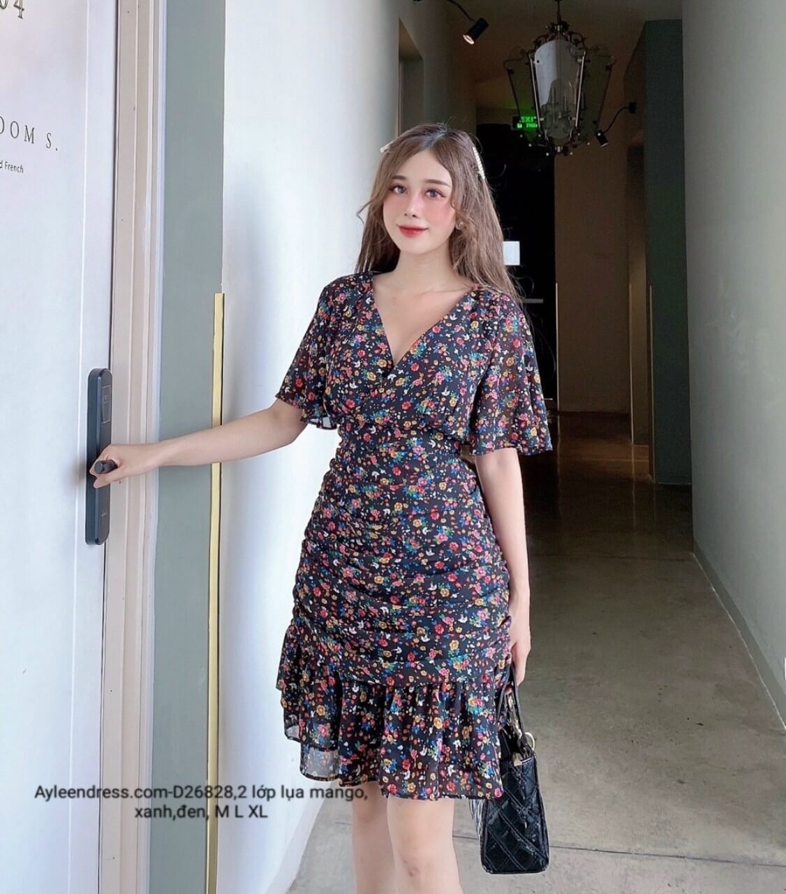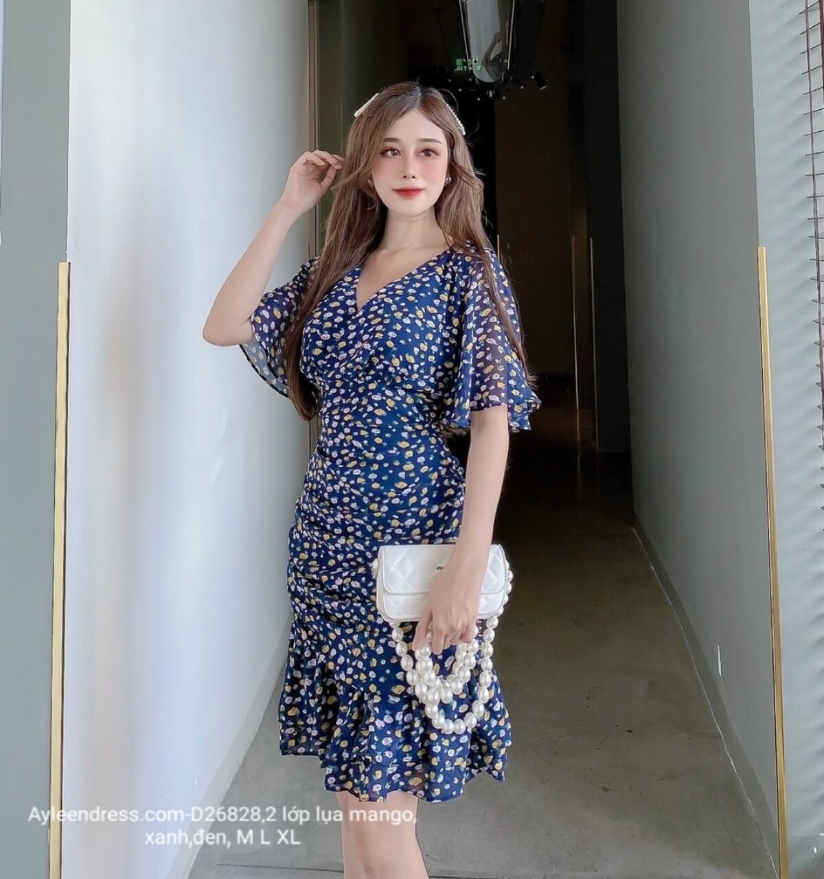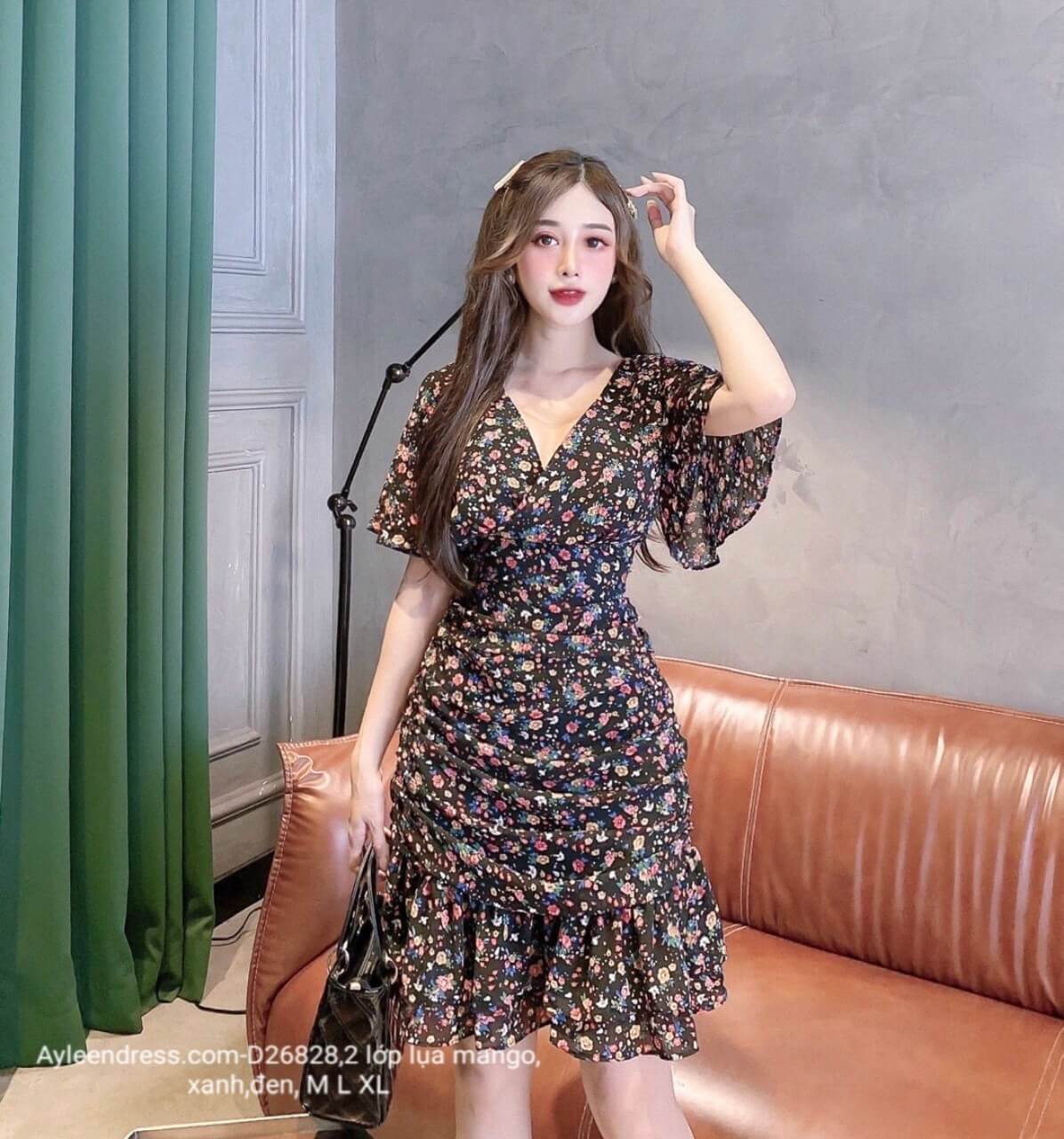 Đầm hoa nhí cổ V tay cánh tiên nhún đuôi