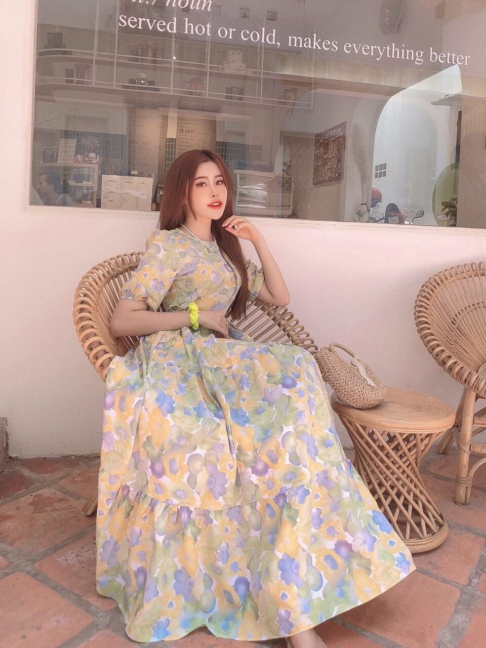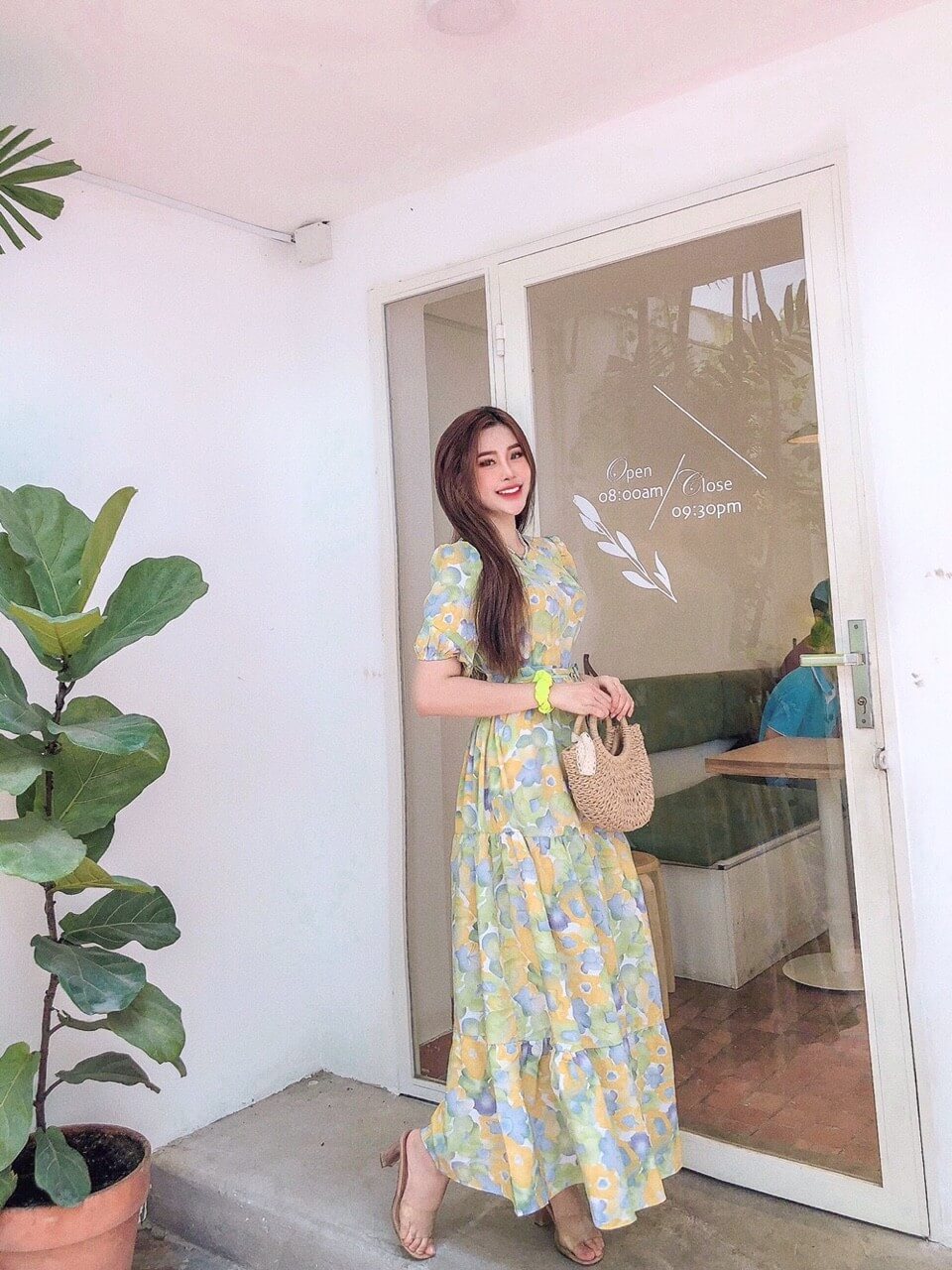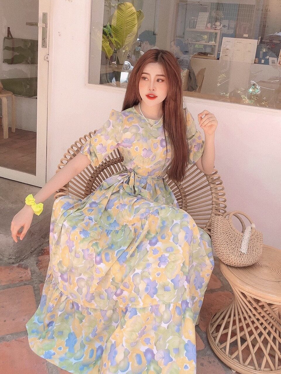 Đầm maxi họa tiết bông to tay phồng tiểu thư