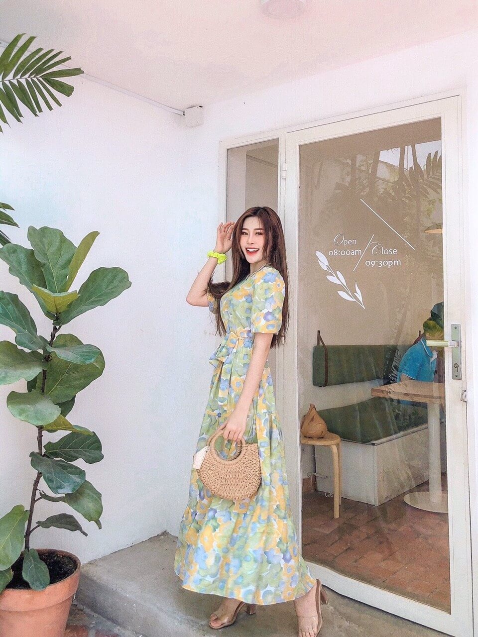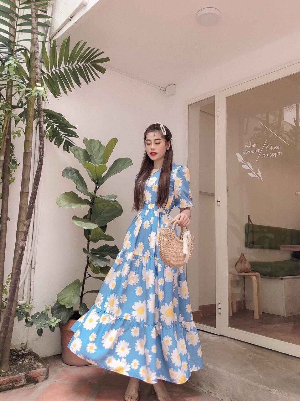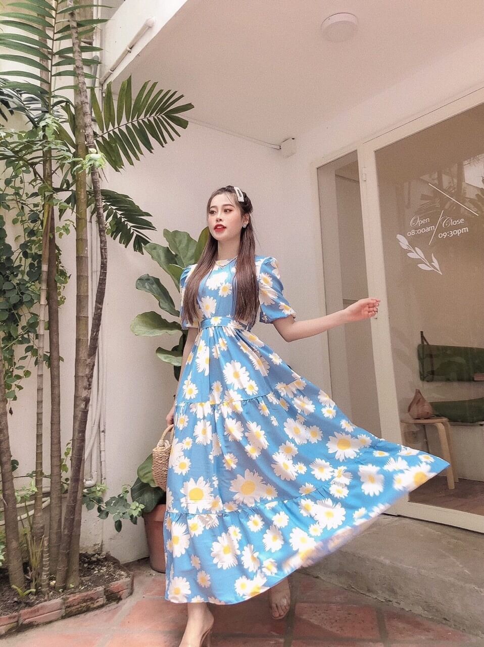 Đầm maxi họa tiết bông to tay phồng tiểu thư