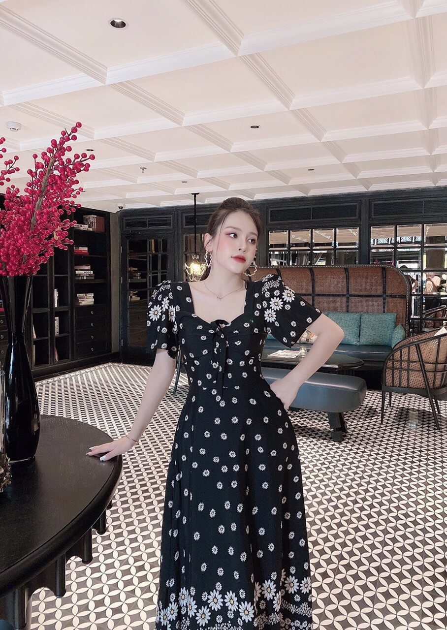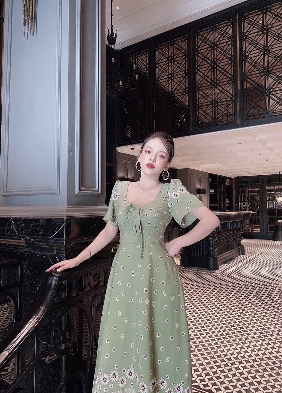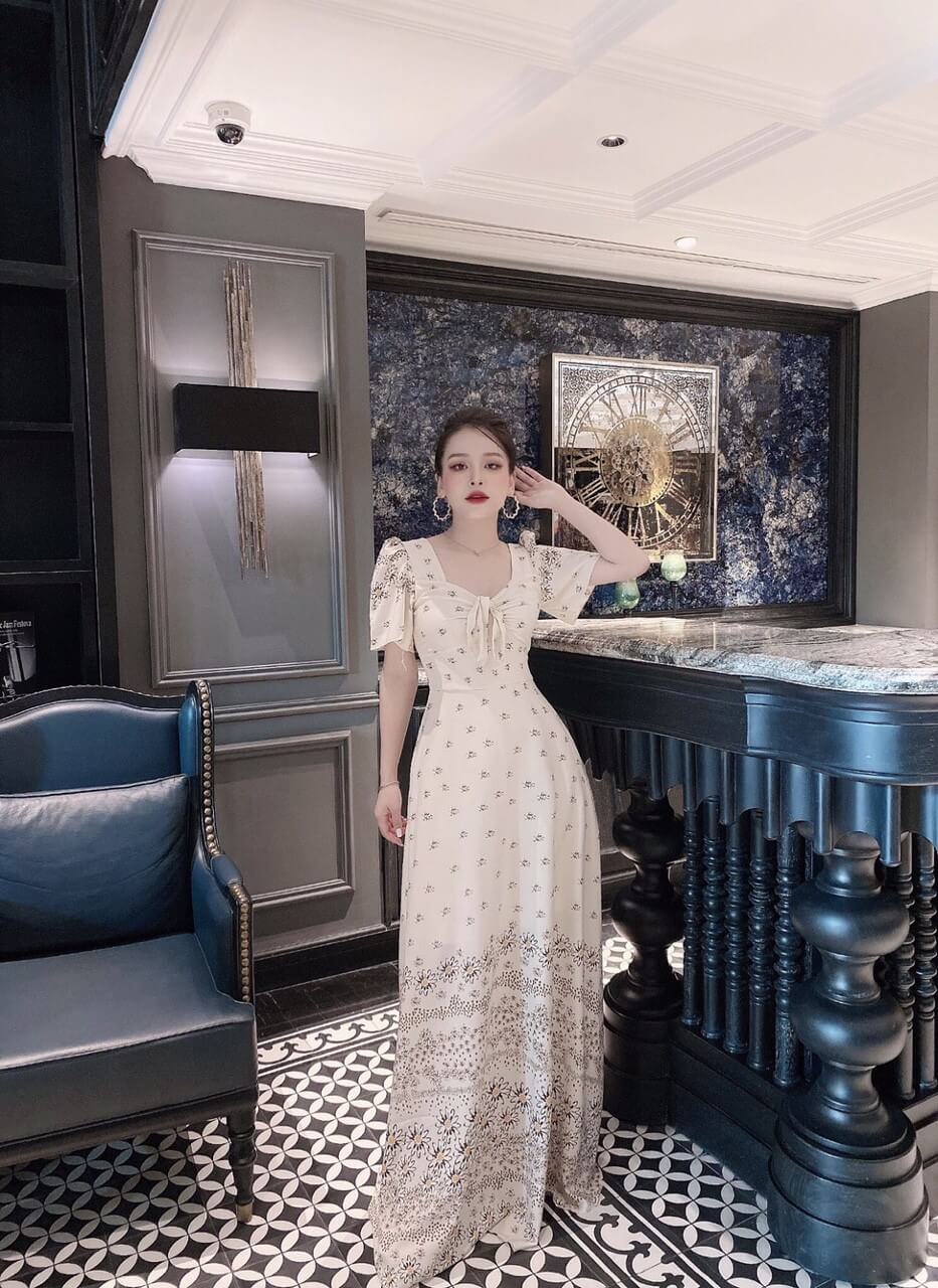 Đầm maxi tay con cổ vuông phối hoa chân váy