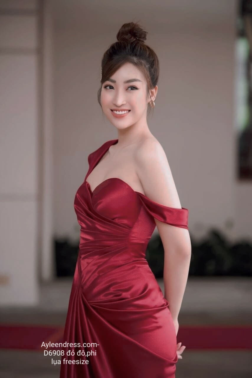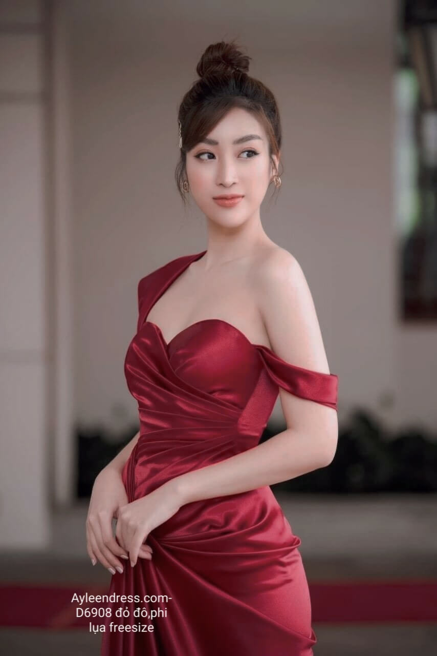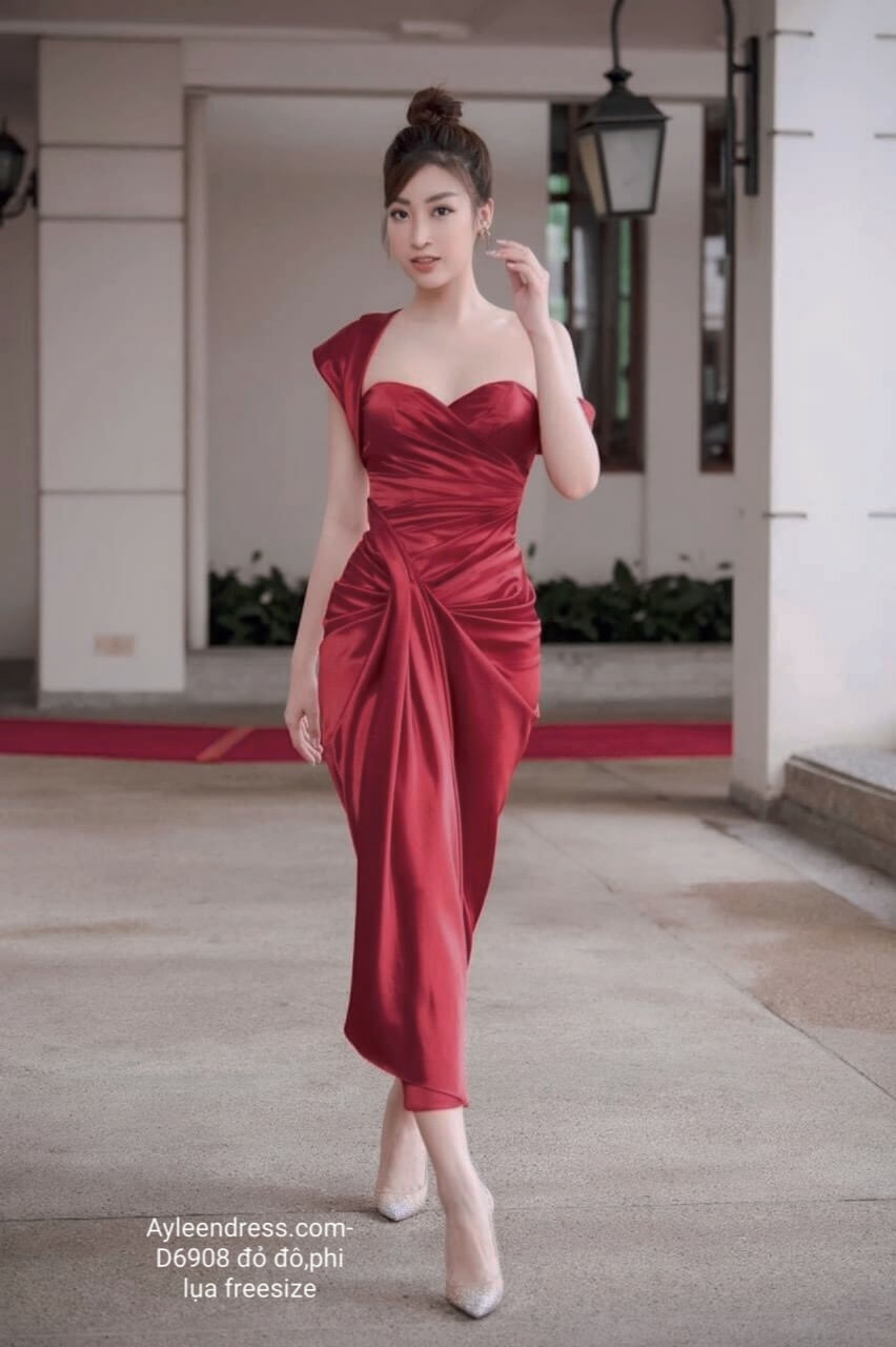 Đầm dạ hội kiểu cúp ngực lệch vai nhún eo đỏ đô