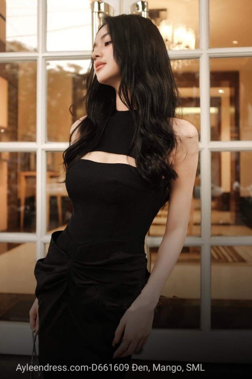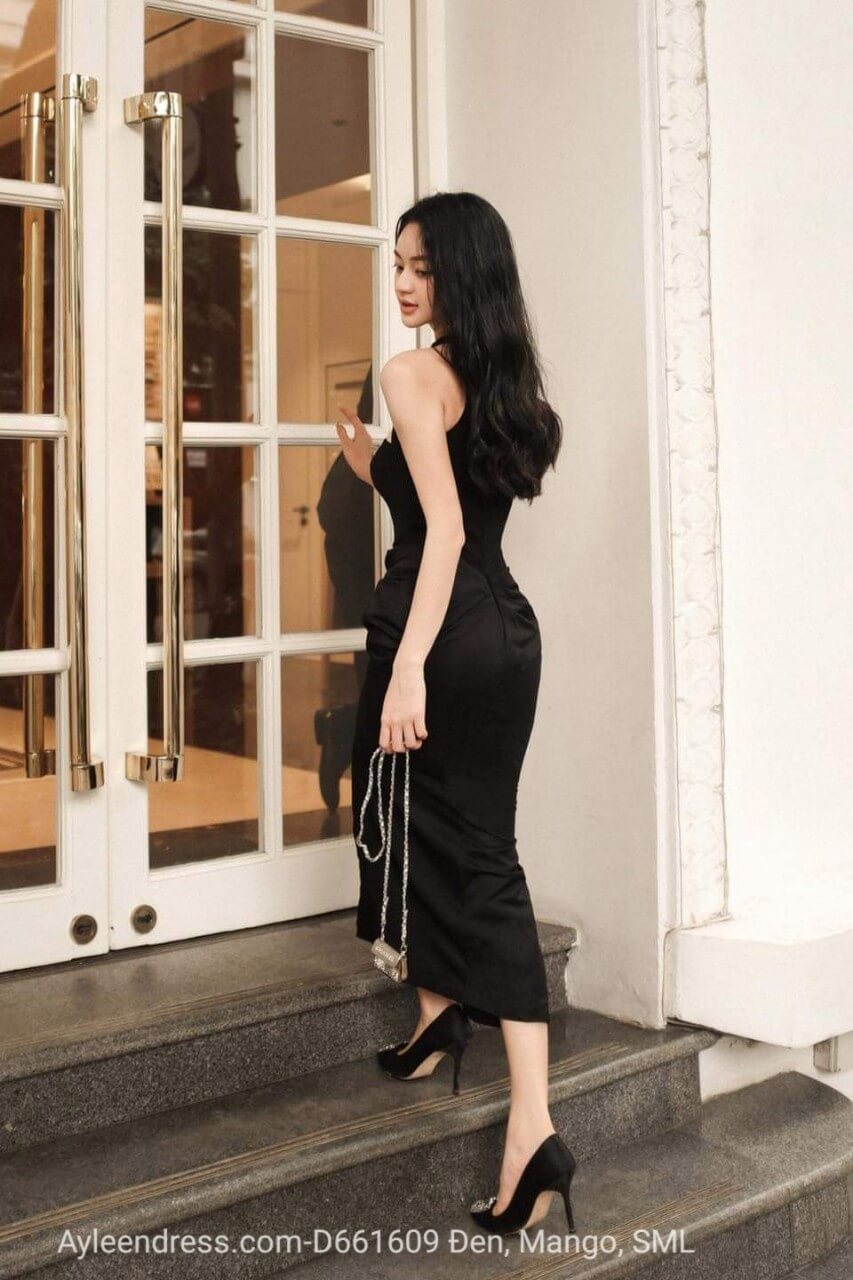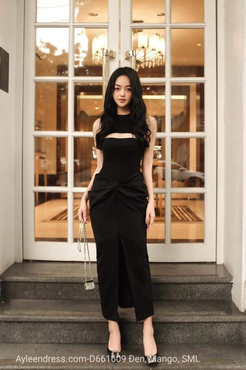 Đầm dự tiệc ôm body sát nách xẻ cúp ngực rút nhún