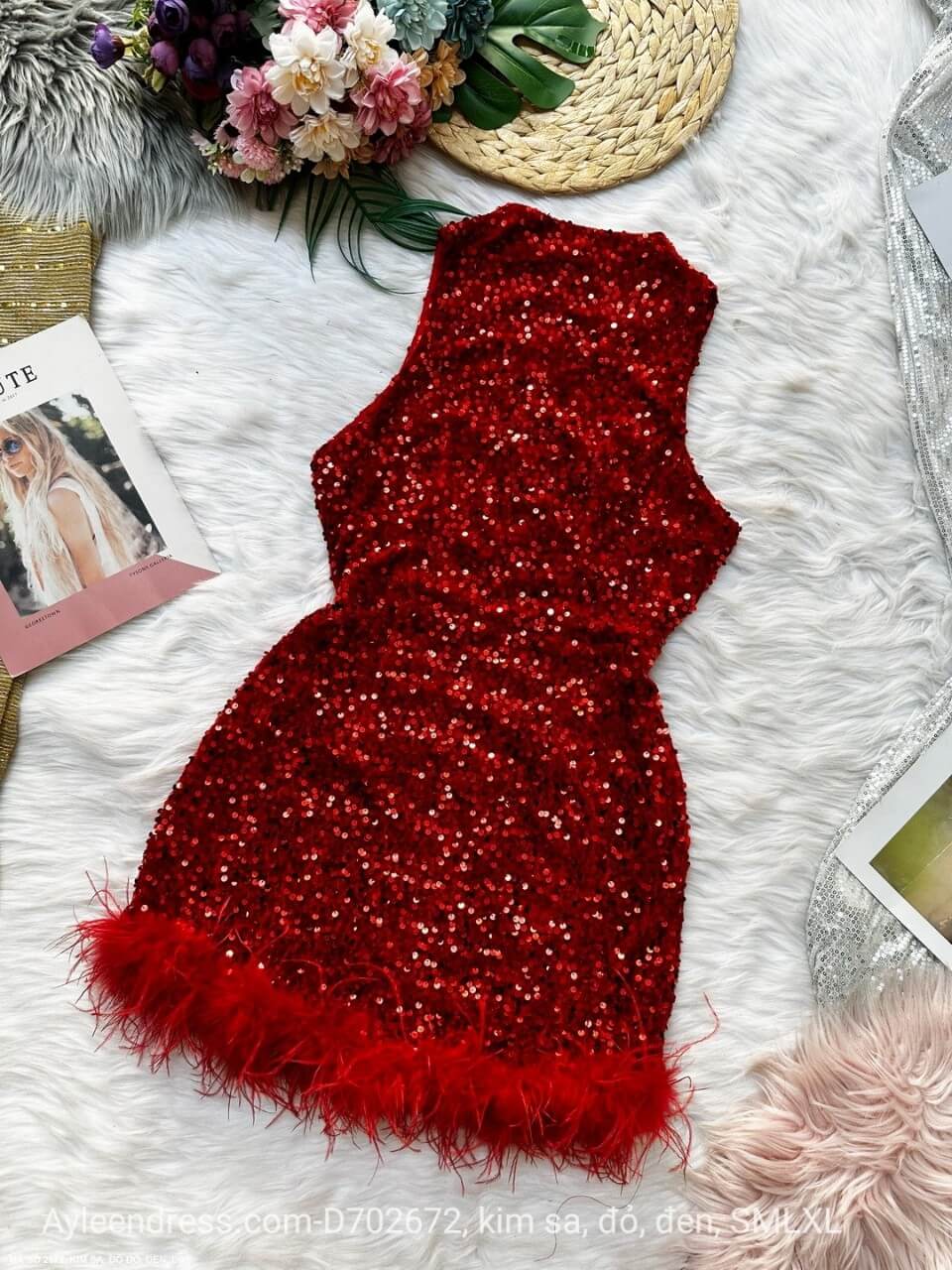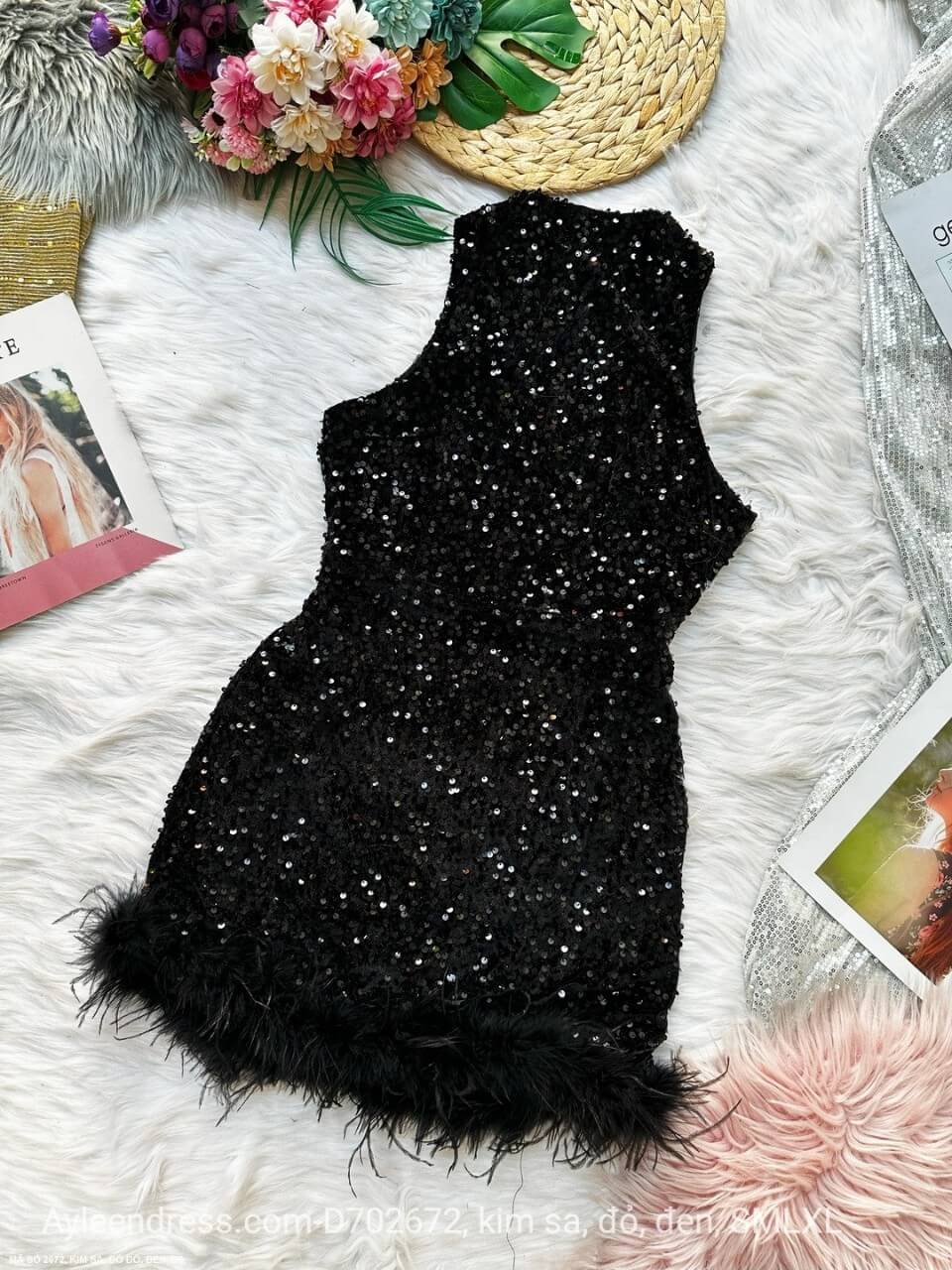 Đầm kim sa cổ lọ yếm lai kết lông đà điểu
