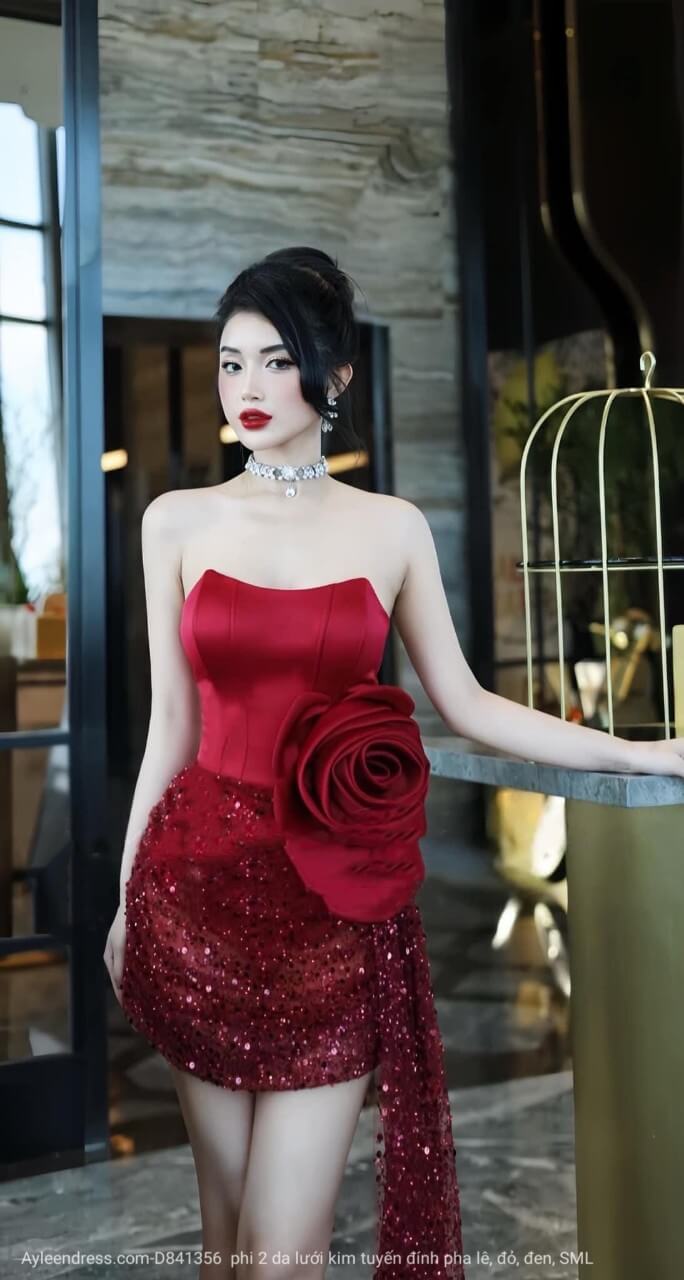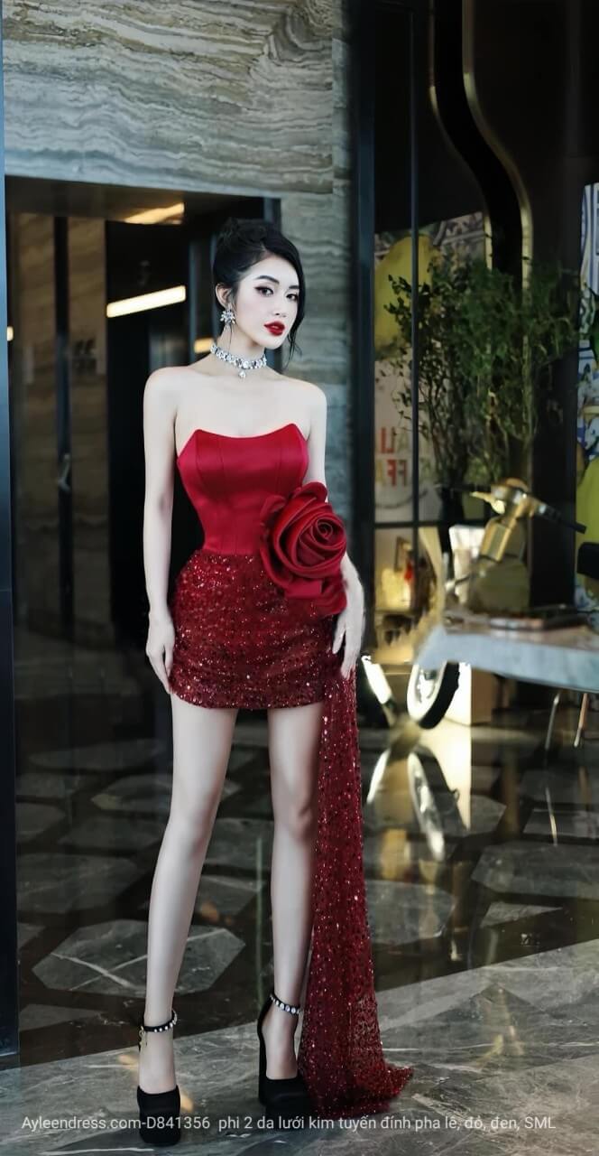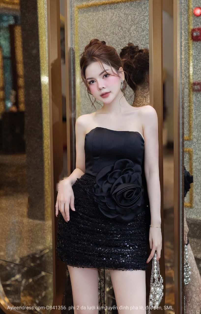 Đầm ngắn cúp ngực chân váy kim tuyến tà bay