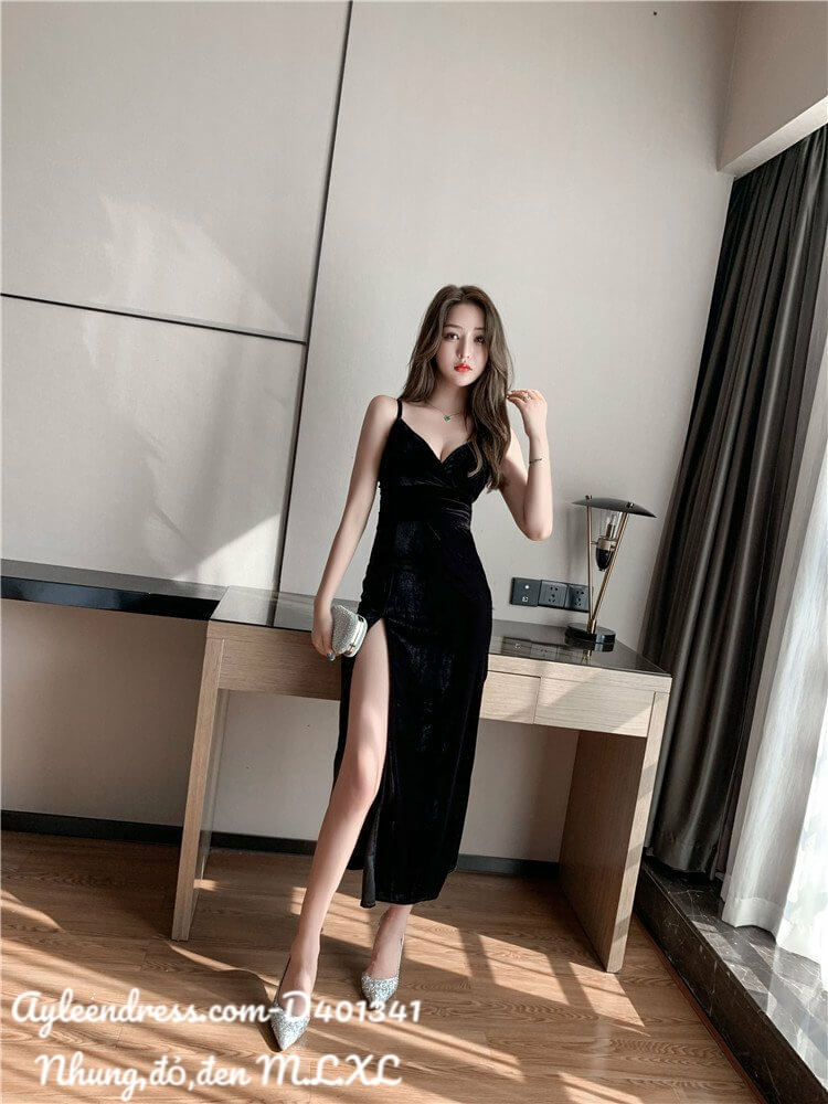 Đầm Nhung thiết kế 2 dây cổ V xẻ đùi