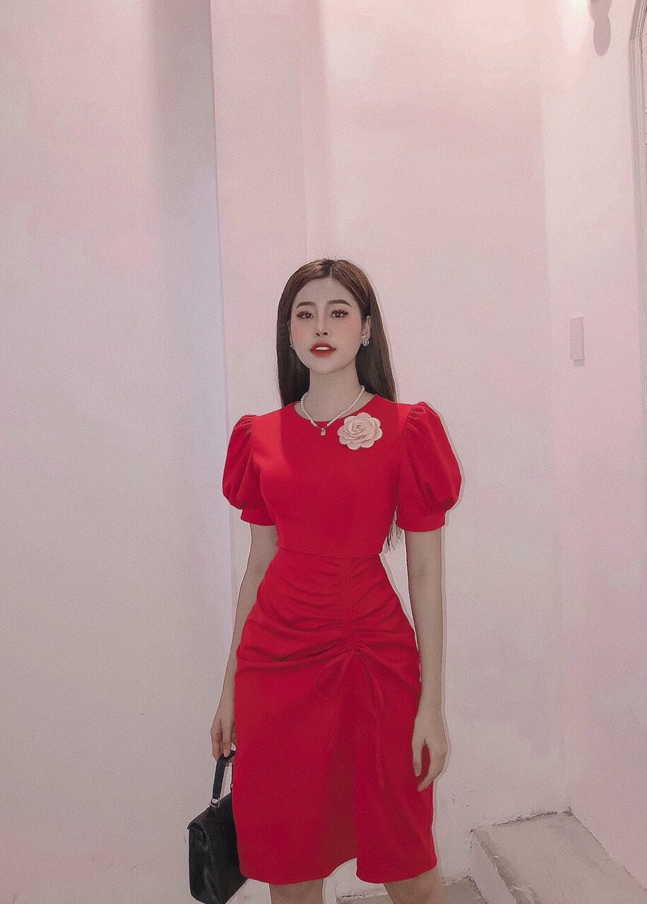 Chi tiết tay phồng trẻ trung duyên dáng kết hợp eo rút nhúng tạo độ xếp ly giúp nàng che khuyết điểm bụng kém thon.