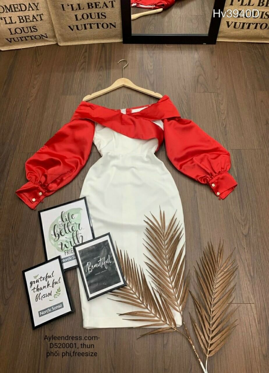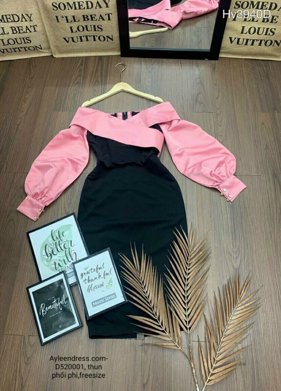 Đầm ôm body trễ vai tay dài cổ vắt chéo chữ V phối màu
