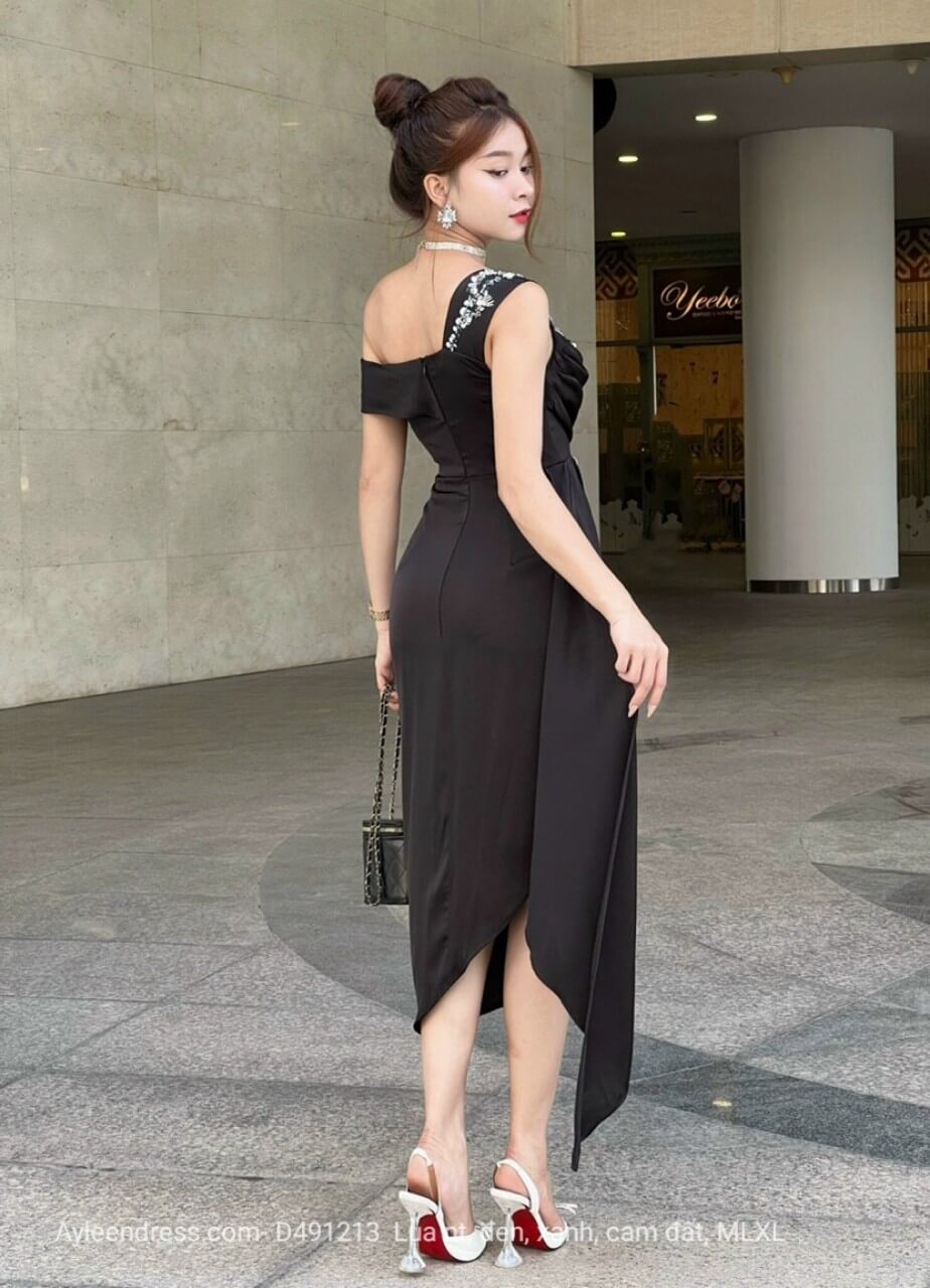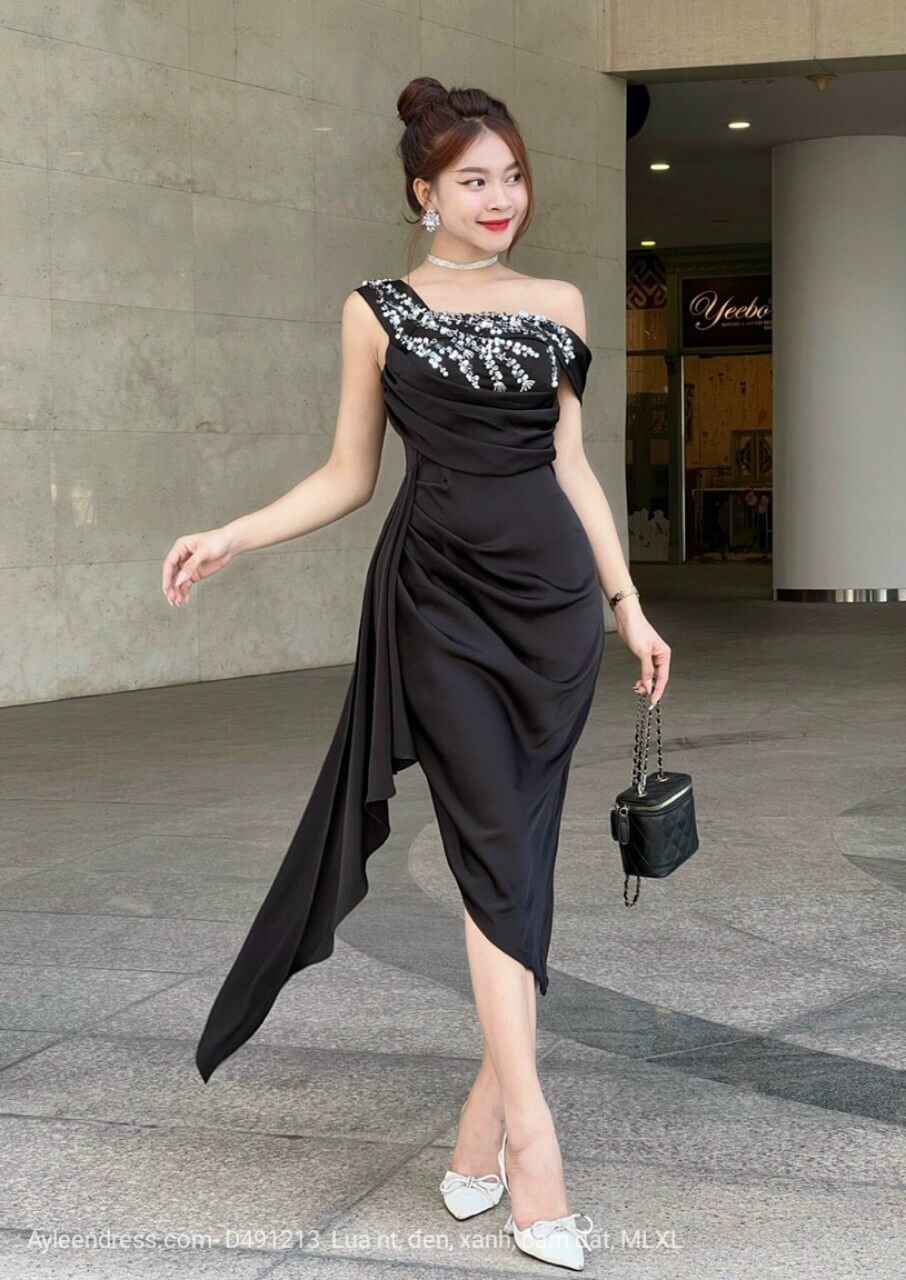 Đầm ôm lệch vai cut out đính kim sa