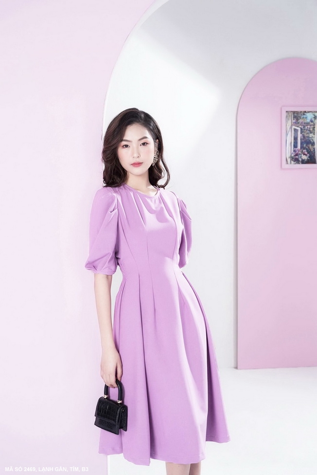 Đầm xếp ly màu tím tay ngắn dún dịu dàng