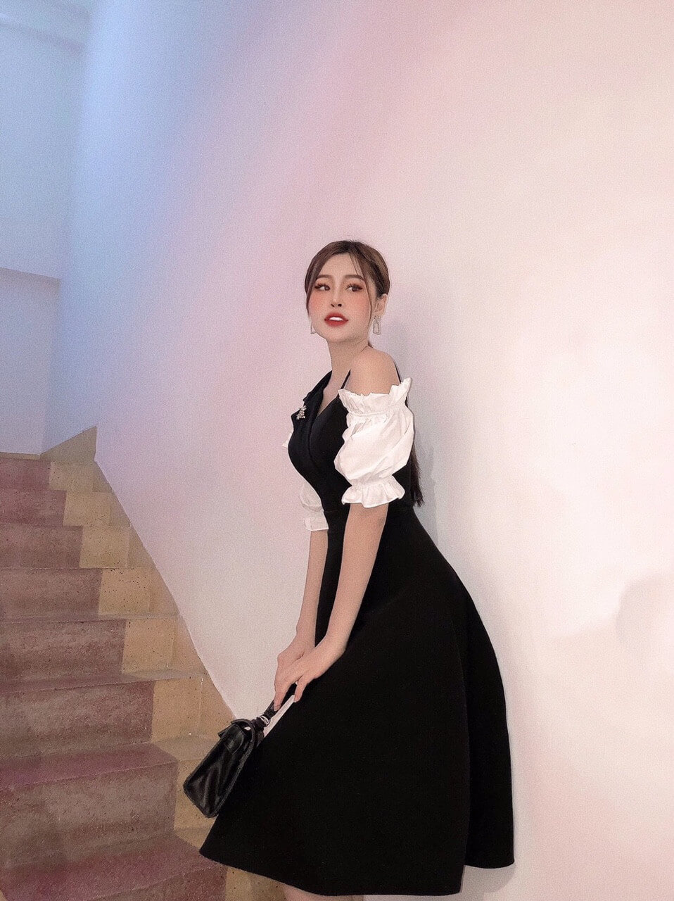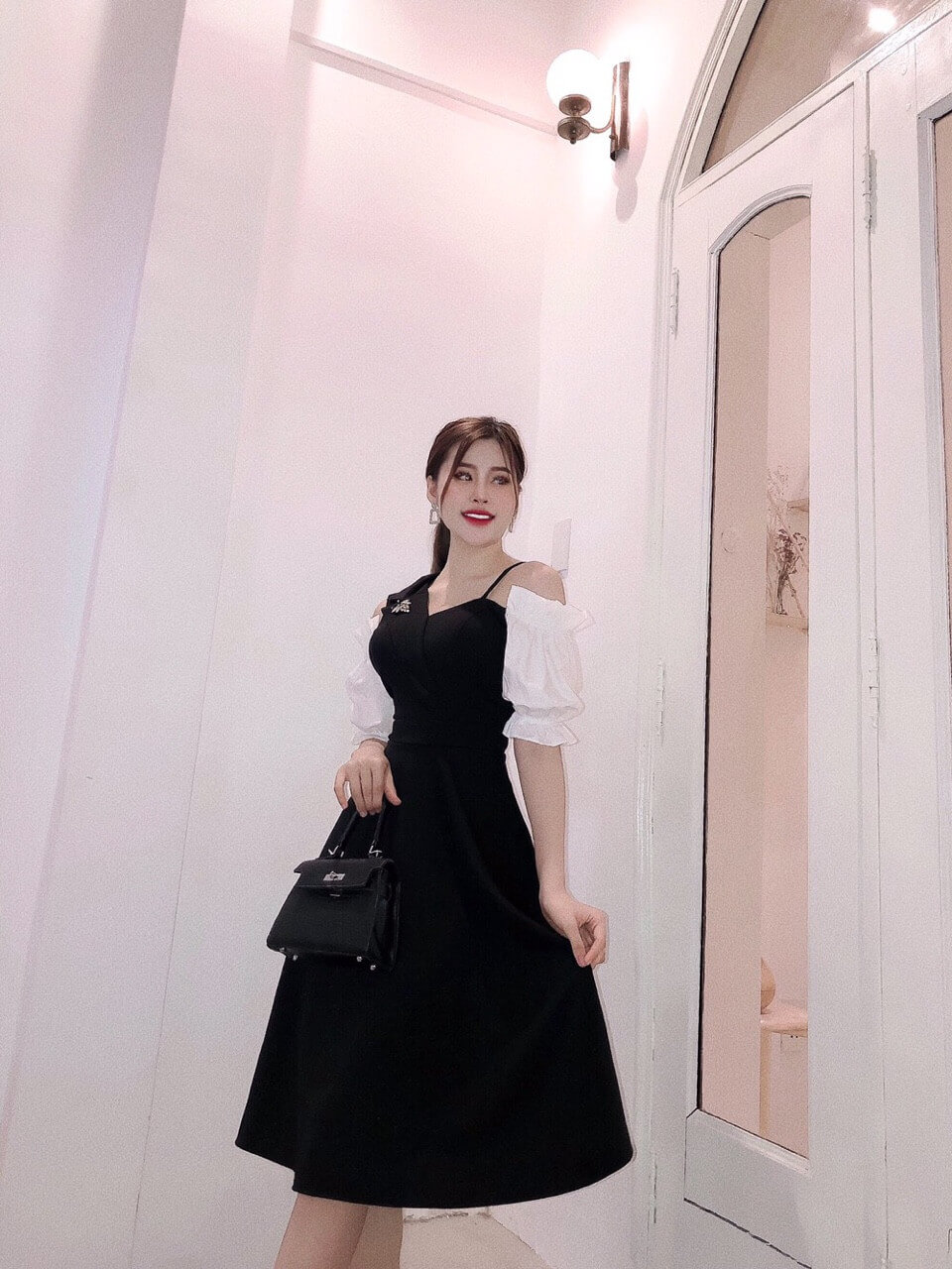 Đầm xoè cách điệu trễ vai. Phụ nữ hiện đại không ngại mặc táo bạo, hơi cách điệu 1 xíu, gợi cảm xíu thôi, nhưng đủ làm bao chàng xao xuyến rồi.