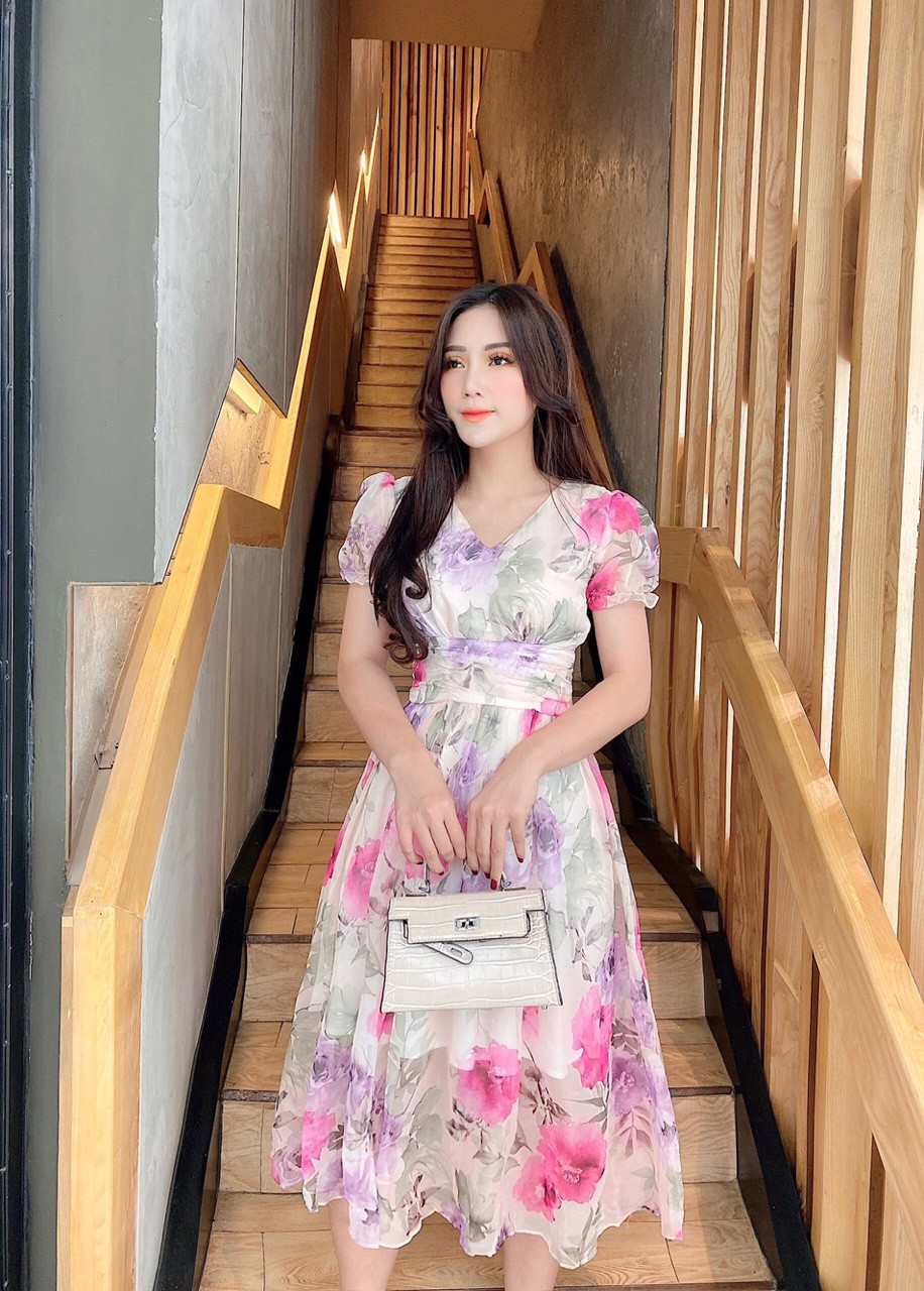Đầm xòe chữ A xếp ly hoa hồng
