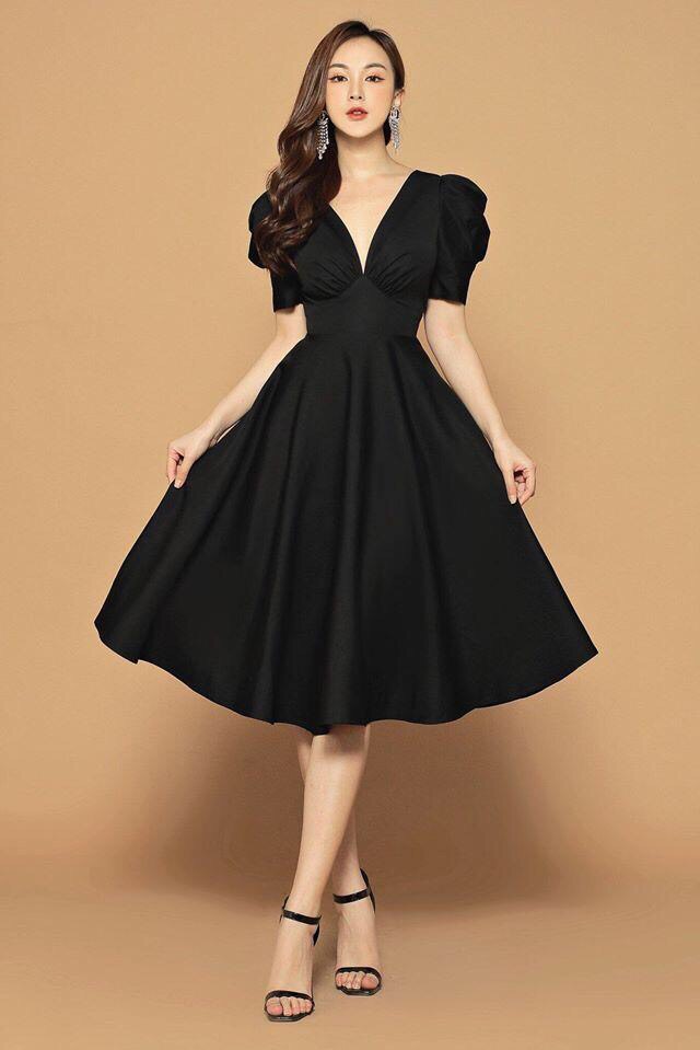 Đầm xoè cổ V nhún chân ngực trẻ trung
