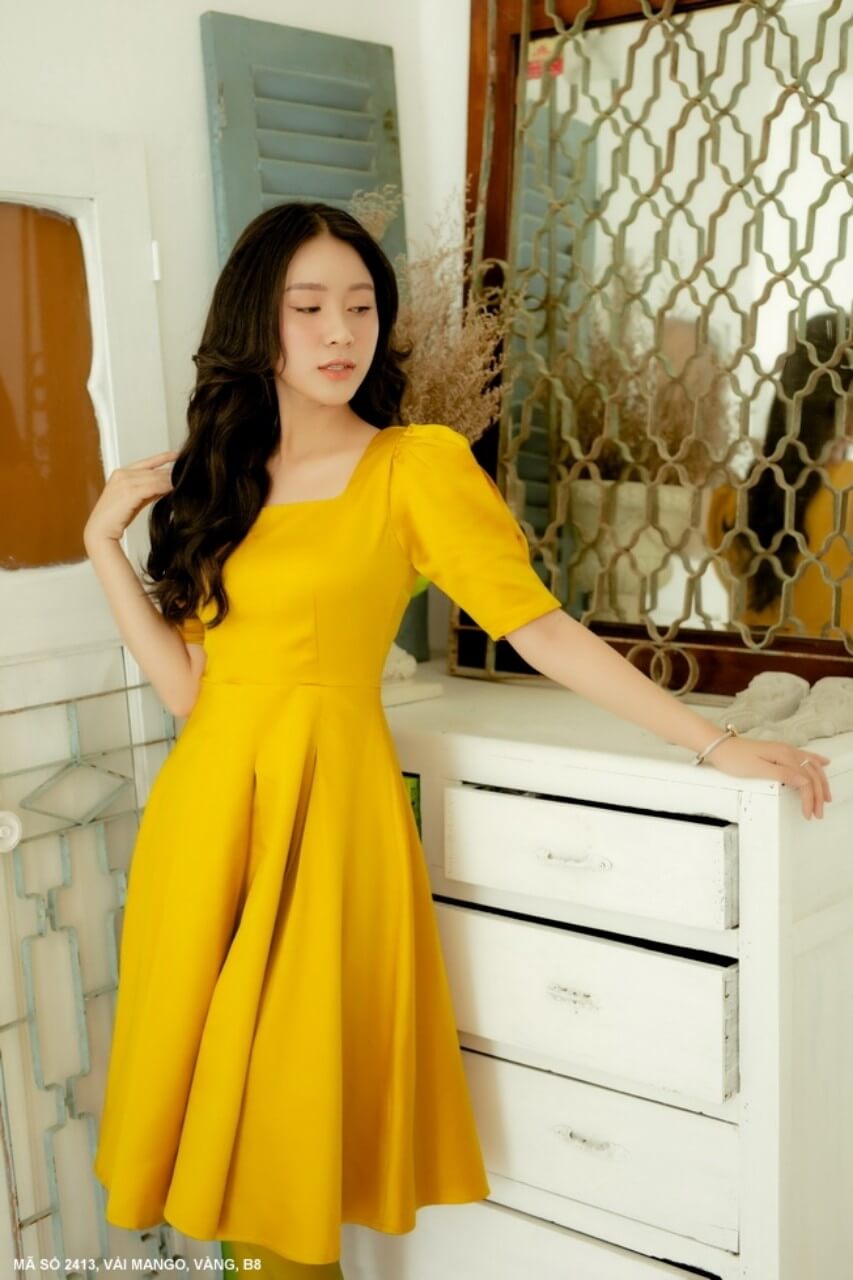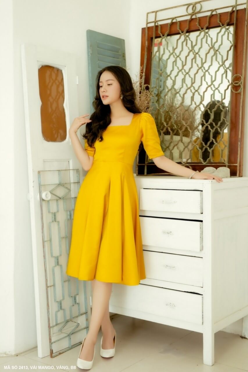 Đầm xòe màu vàng cổ vuông tay lửng sáng da