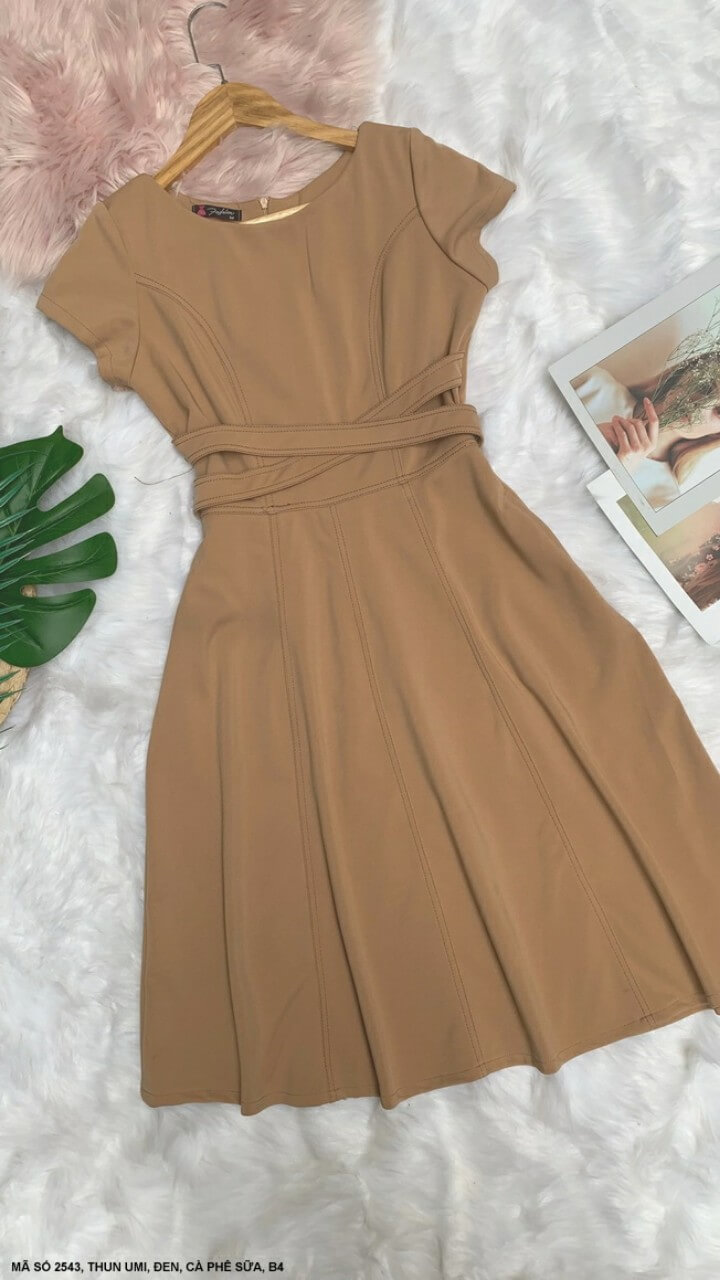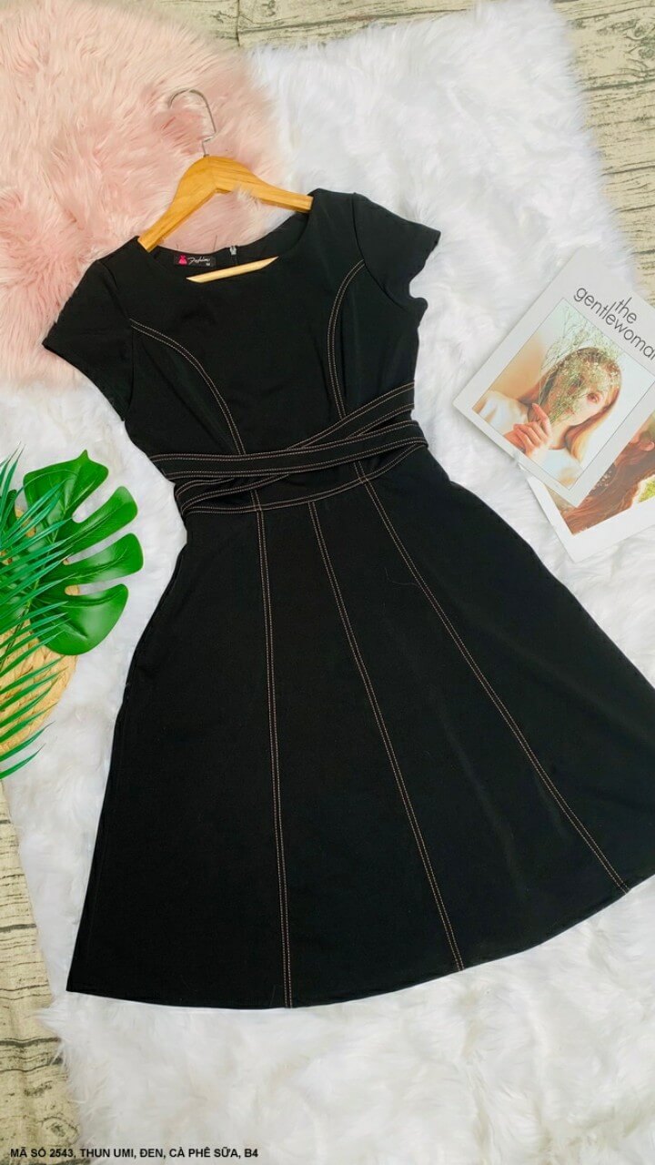 Đầm xòe công sở viền chỉ nổi bắt chéo eo