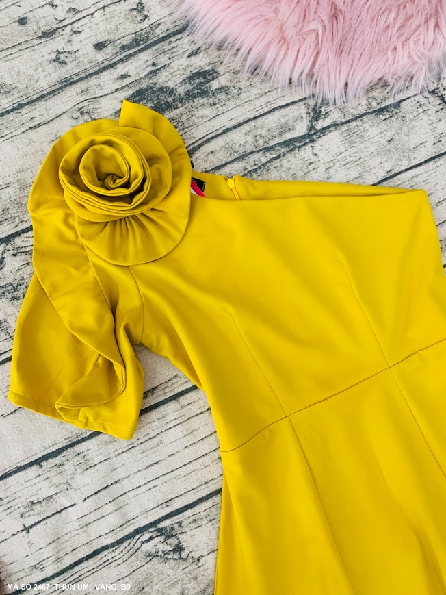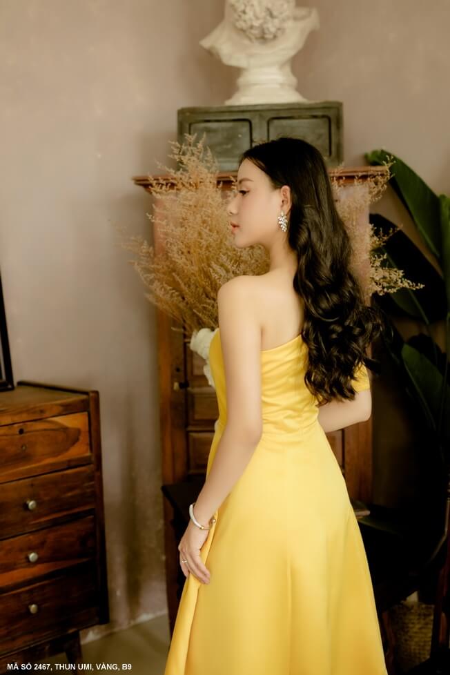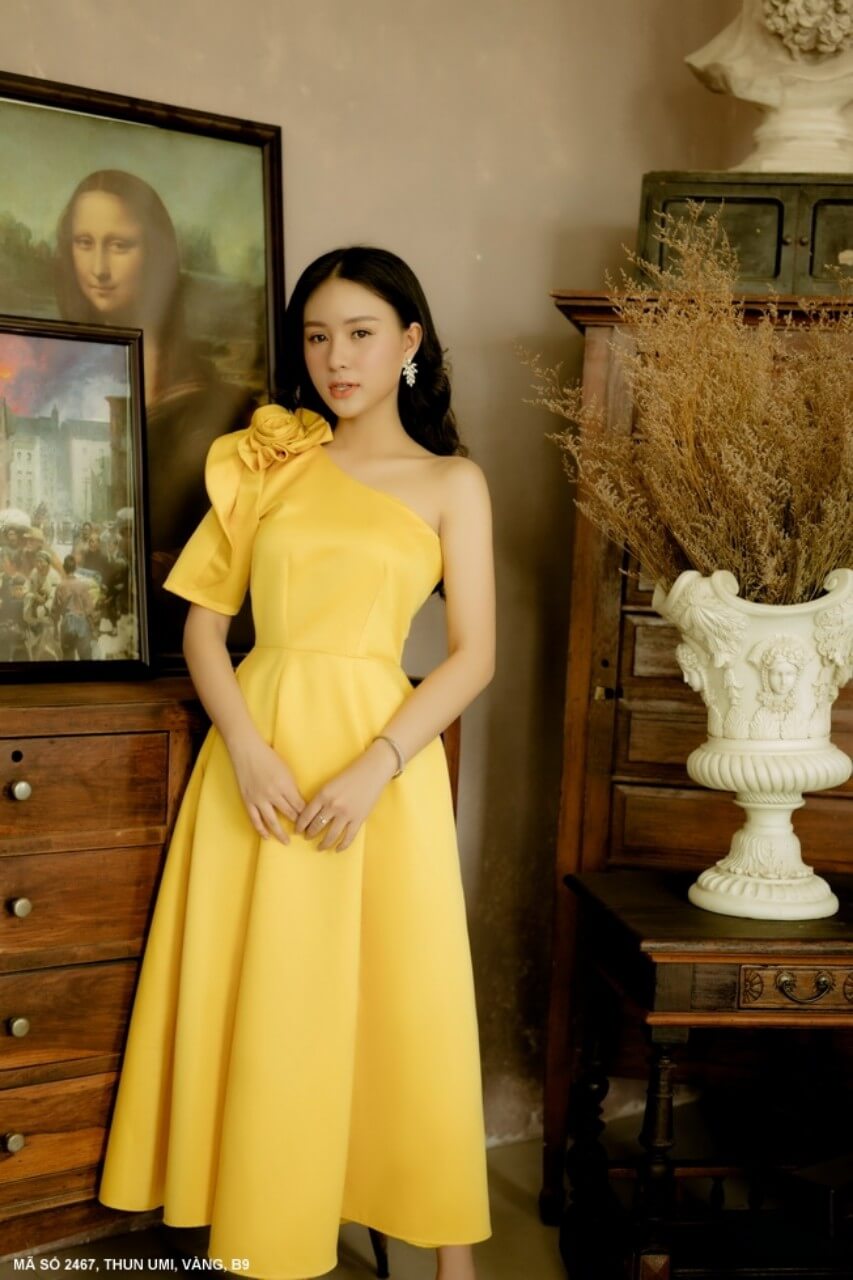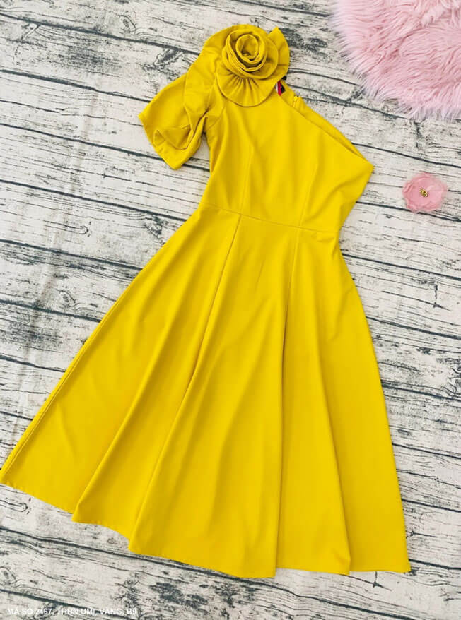 Đầm xòe dài vai xéo đính hoa hồng màu vàng sang trọng