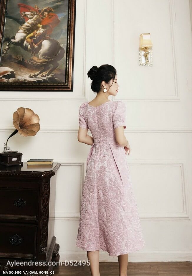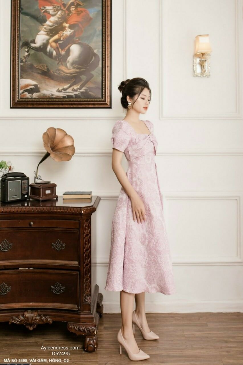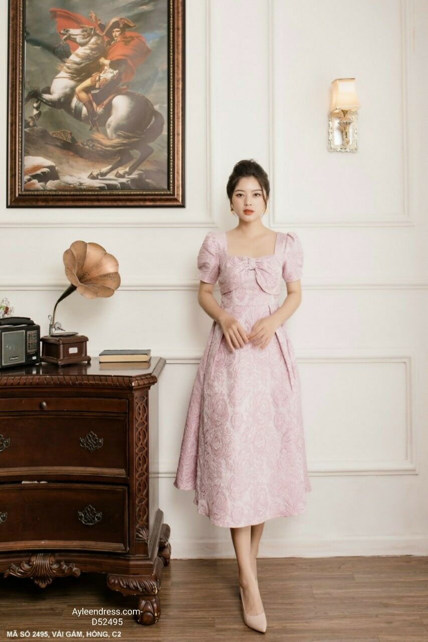 Đầm xòe gấm cổ vuông tay ngắn phồng đính nơ lớn trước ngực