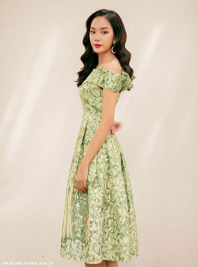 Đầm xòe hoa màu xanh rớt vai nữ tính