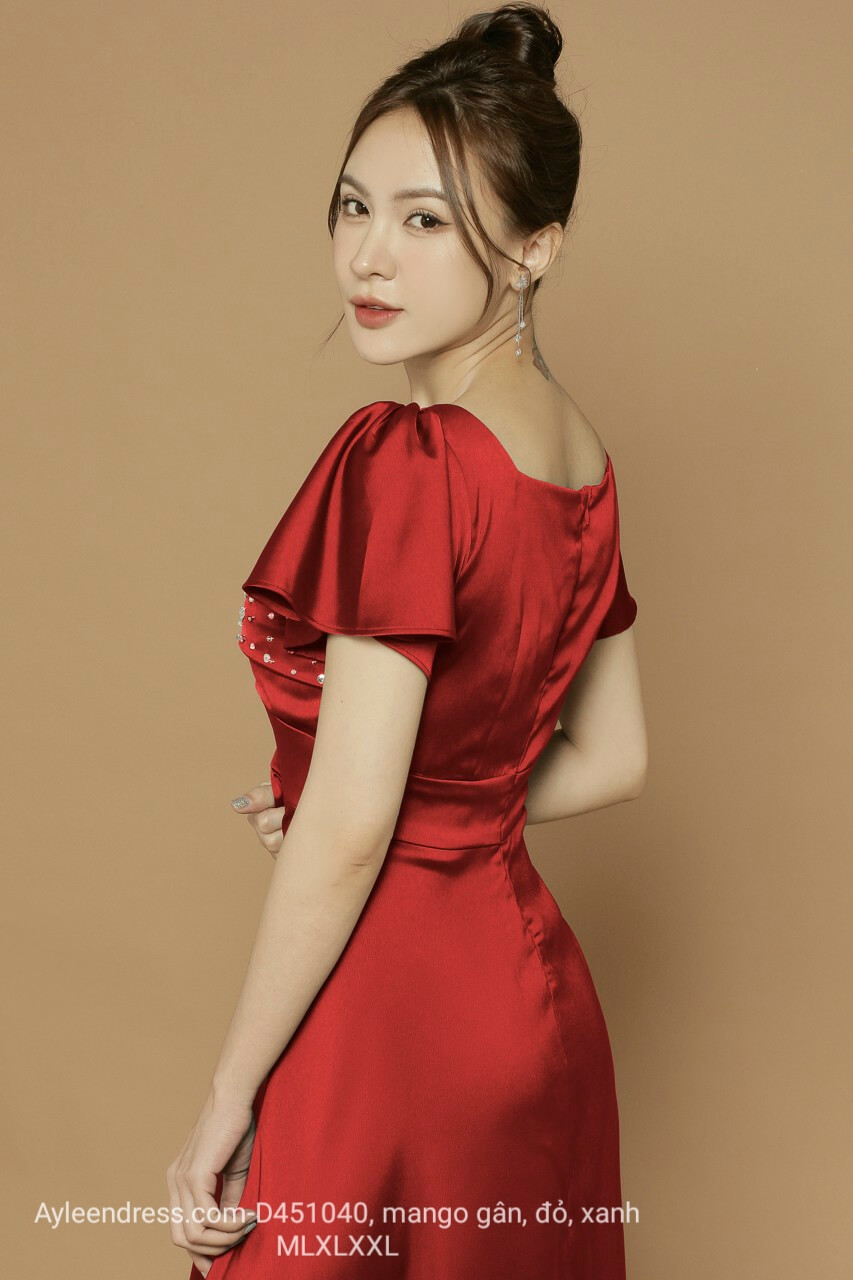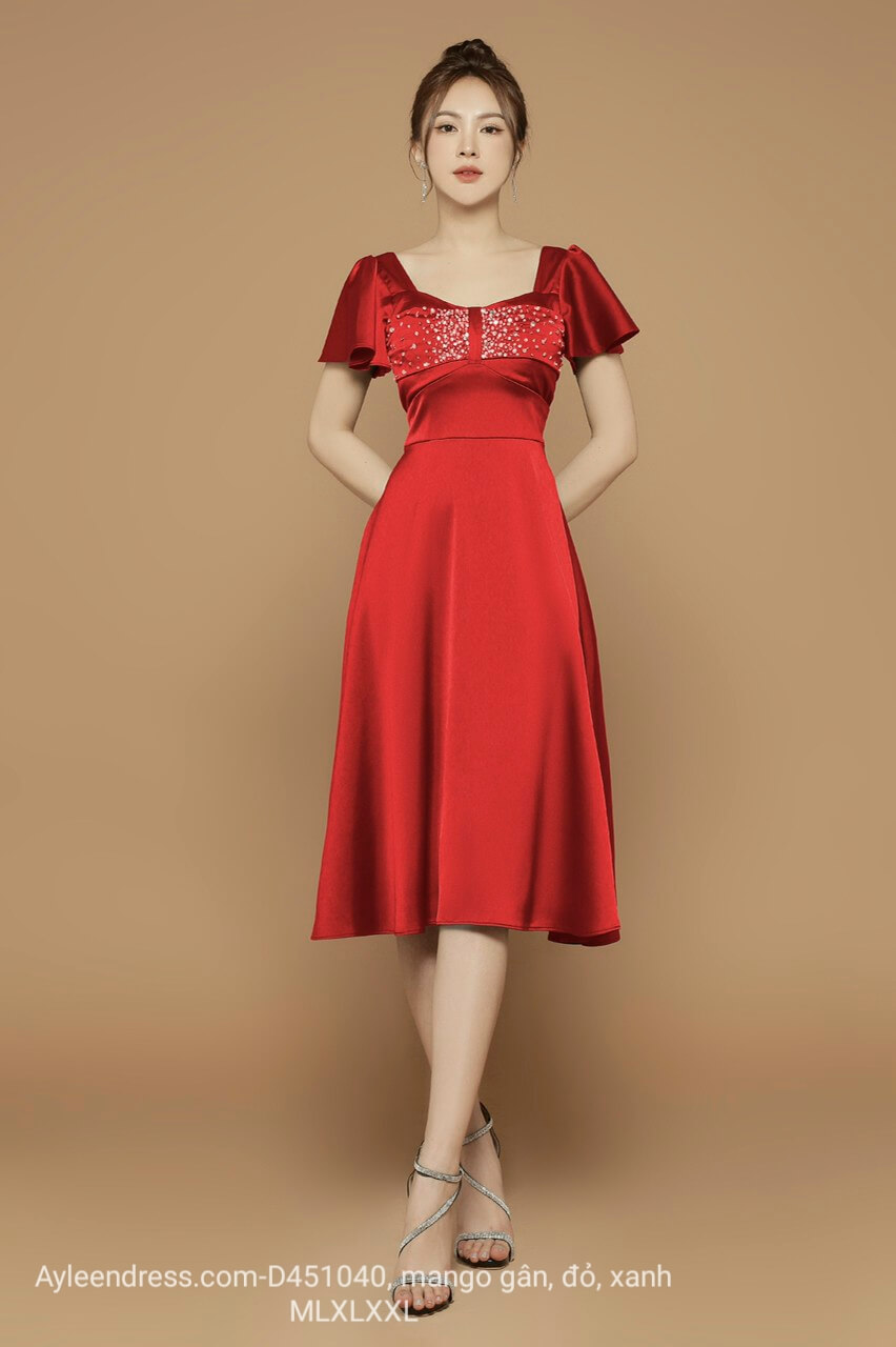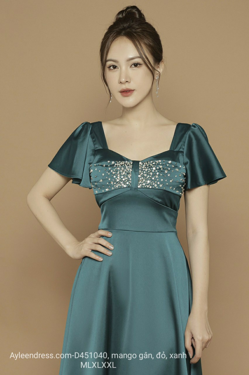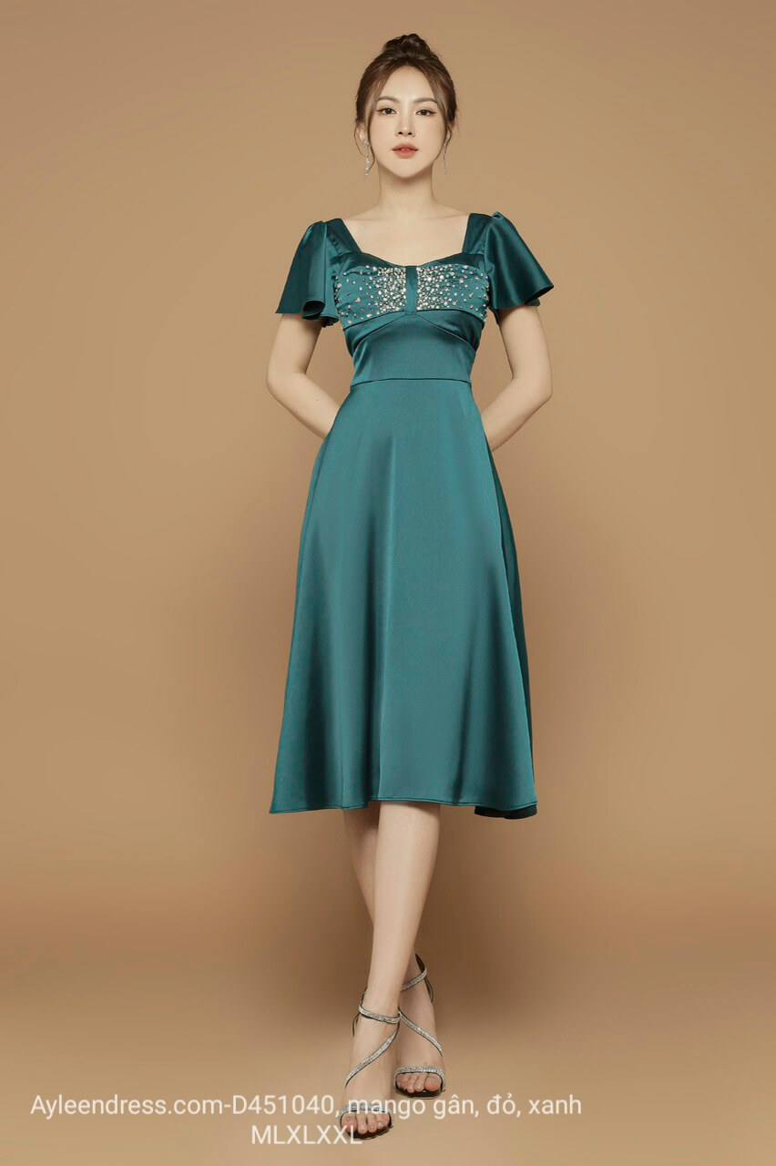 Đầm xoè kết pha lê tay loe chất lụa mango
