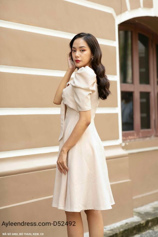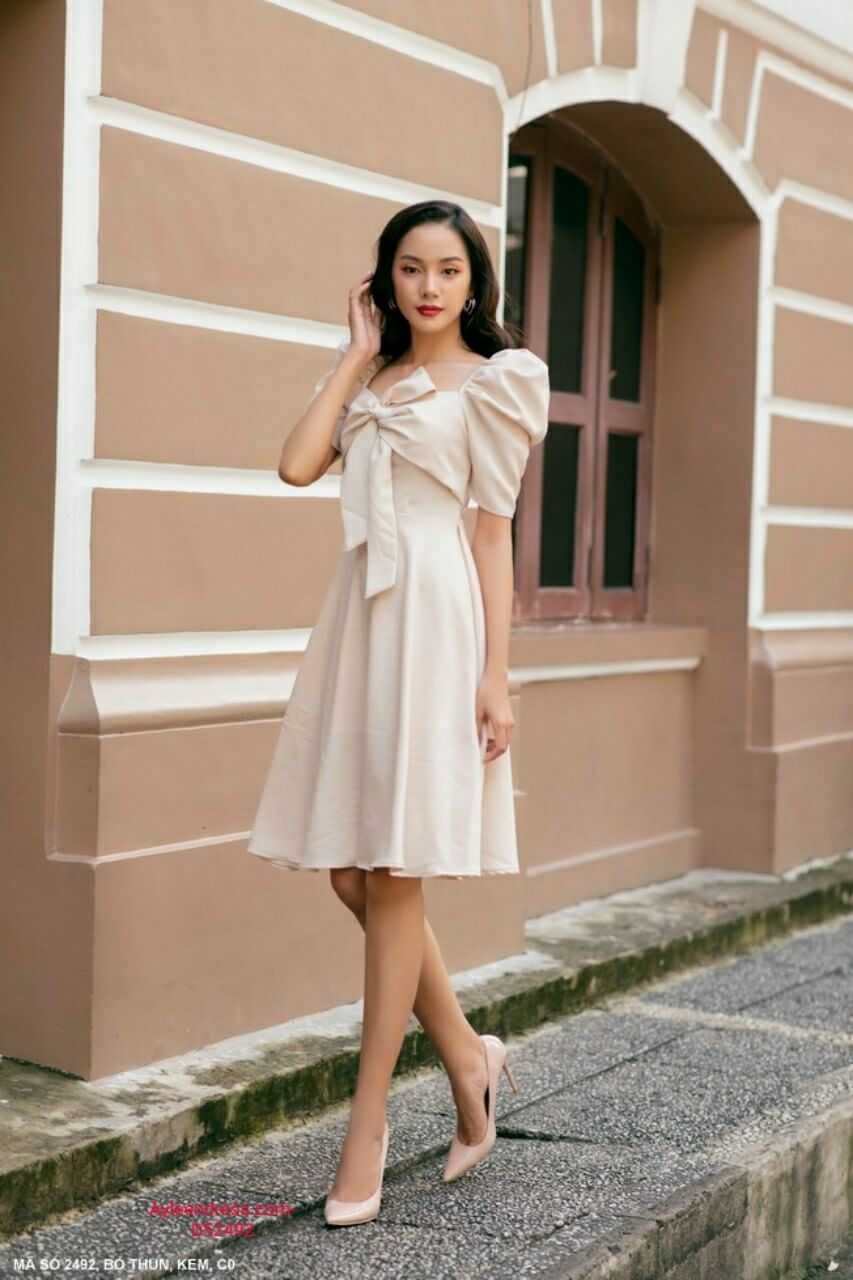 Đầm xòe màu kem tay ngắn phồng thắt nơ trước ngực