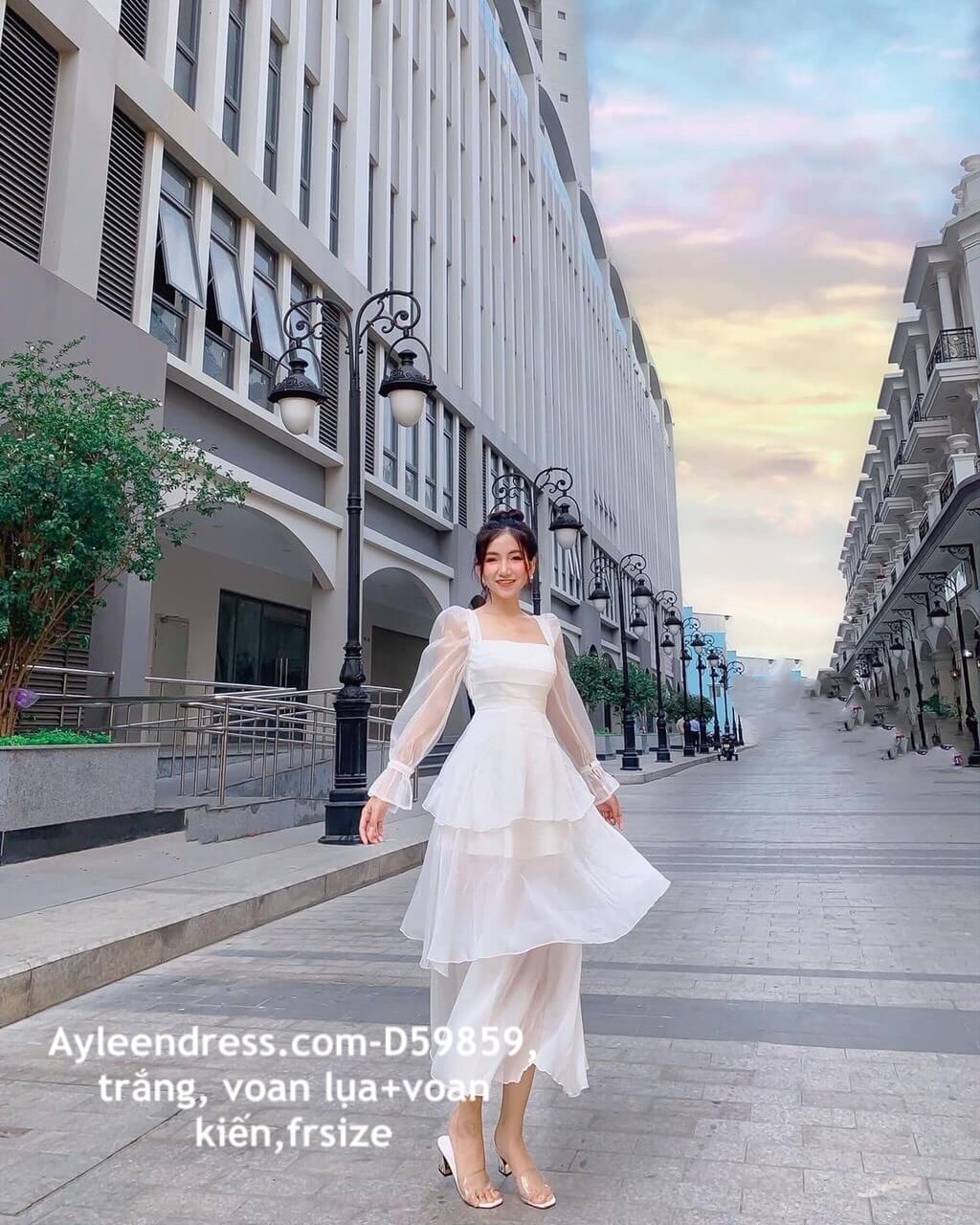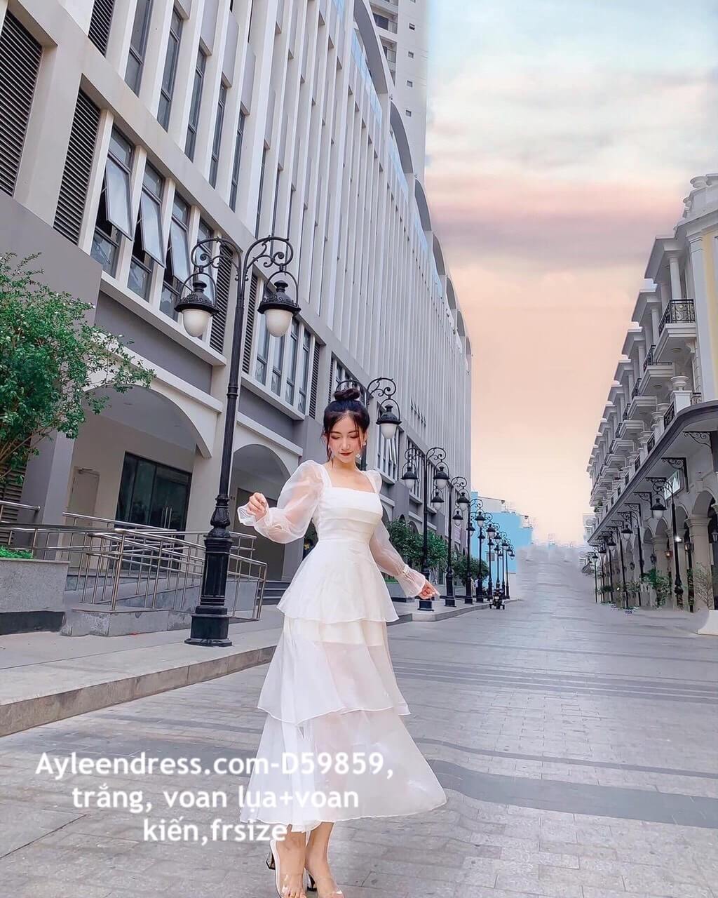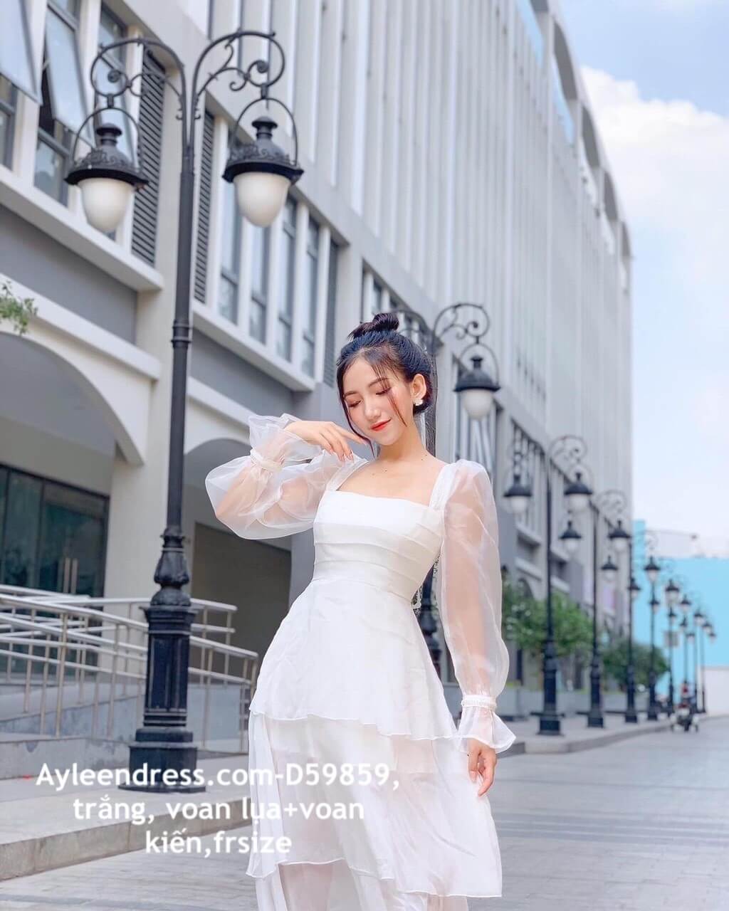 Đầm xoè tầng cổ vuông tay dài phồng màu trắng